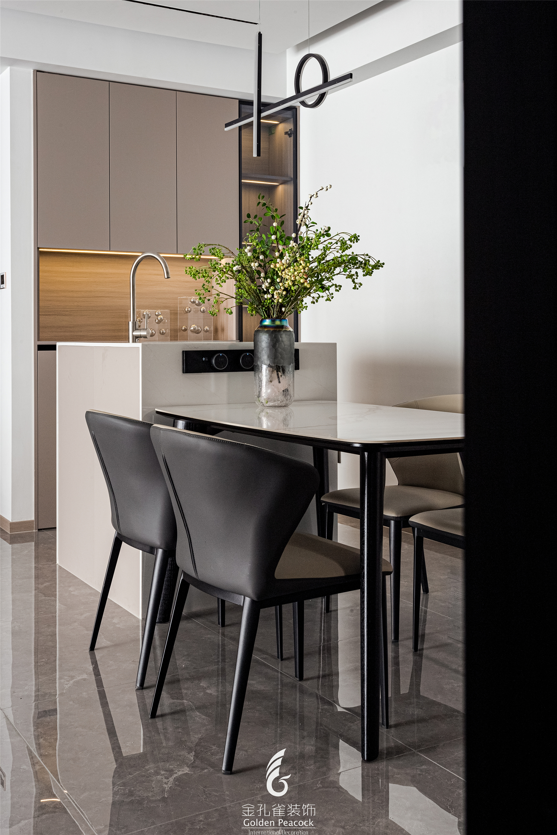 空间布局:餐厅在白色乳胶漆墙面基础下,加入简约设计感吊灯,餐岛组合,容纳用餐和水吧,岛台带直饮水功能,让空间整体显得简约而舒适。