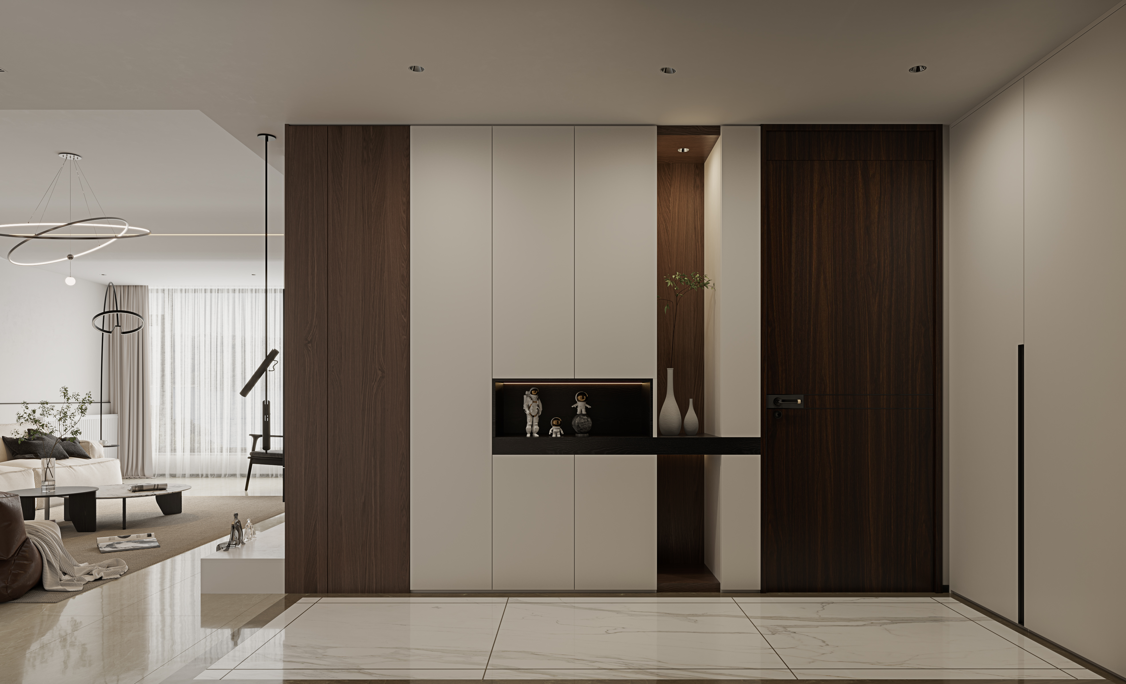 玄关是一个家的门面,不仅注重设计感还要考虑居住者的使用要求。胡桃色搭配奶白色的定制玄关配以个性的现代精致饰品,营造出一个干净纯粹、盈满透明感会呼吸的空间。