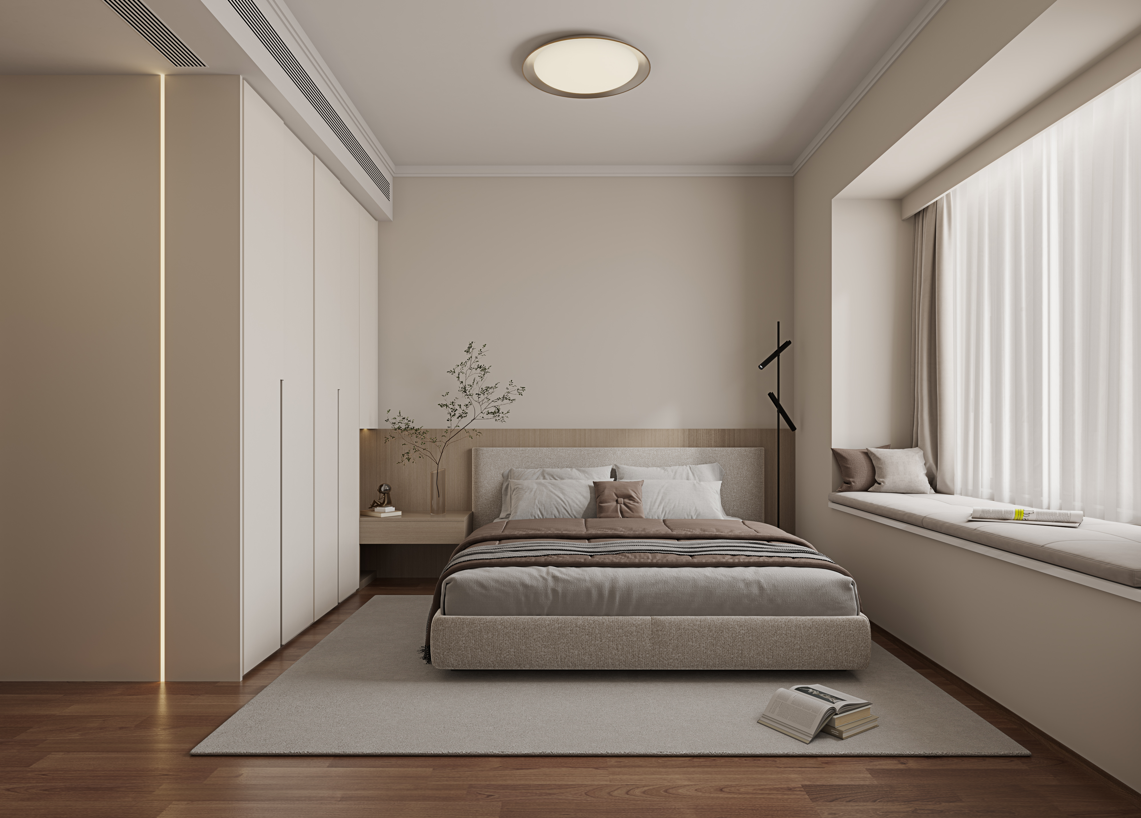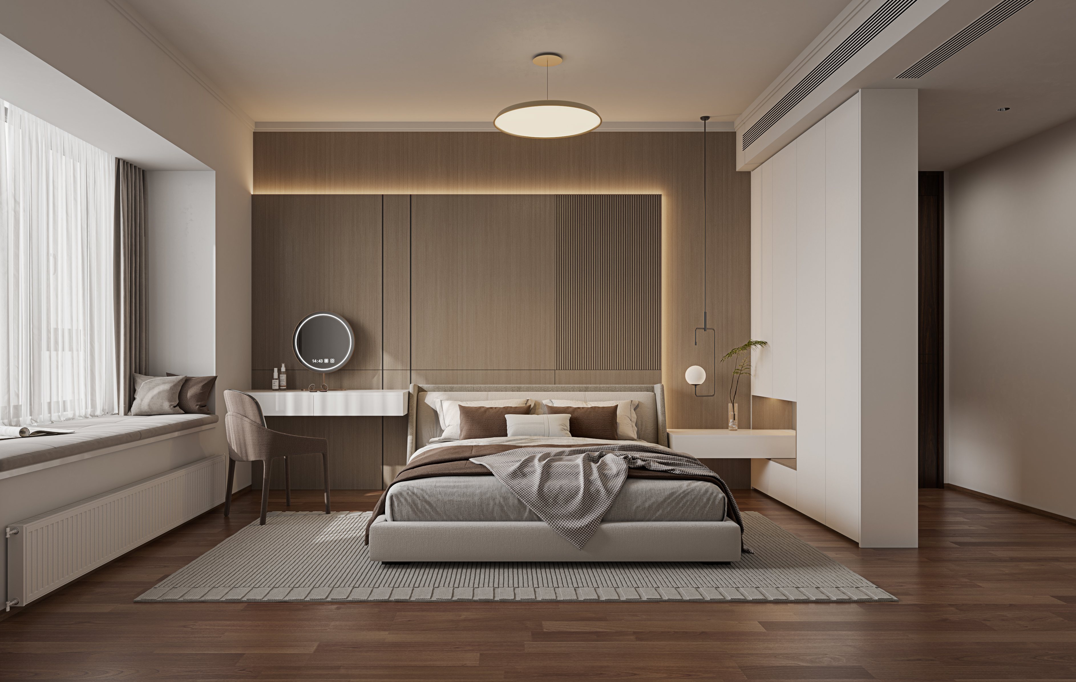 次卧浅木色调为主,配以浅灰色的床品,极简床头落地灯散发着和煦的暖光,犹如空间中的催化剂,在清新文雅中多了些许意境。