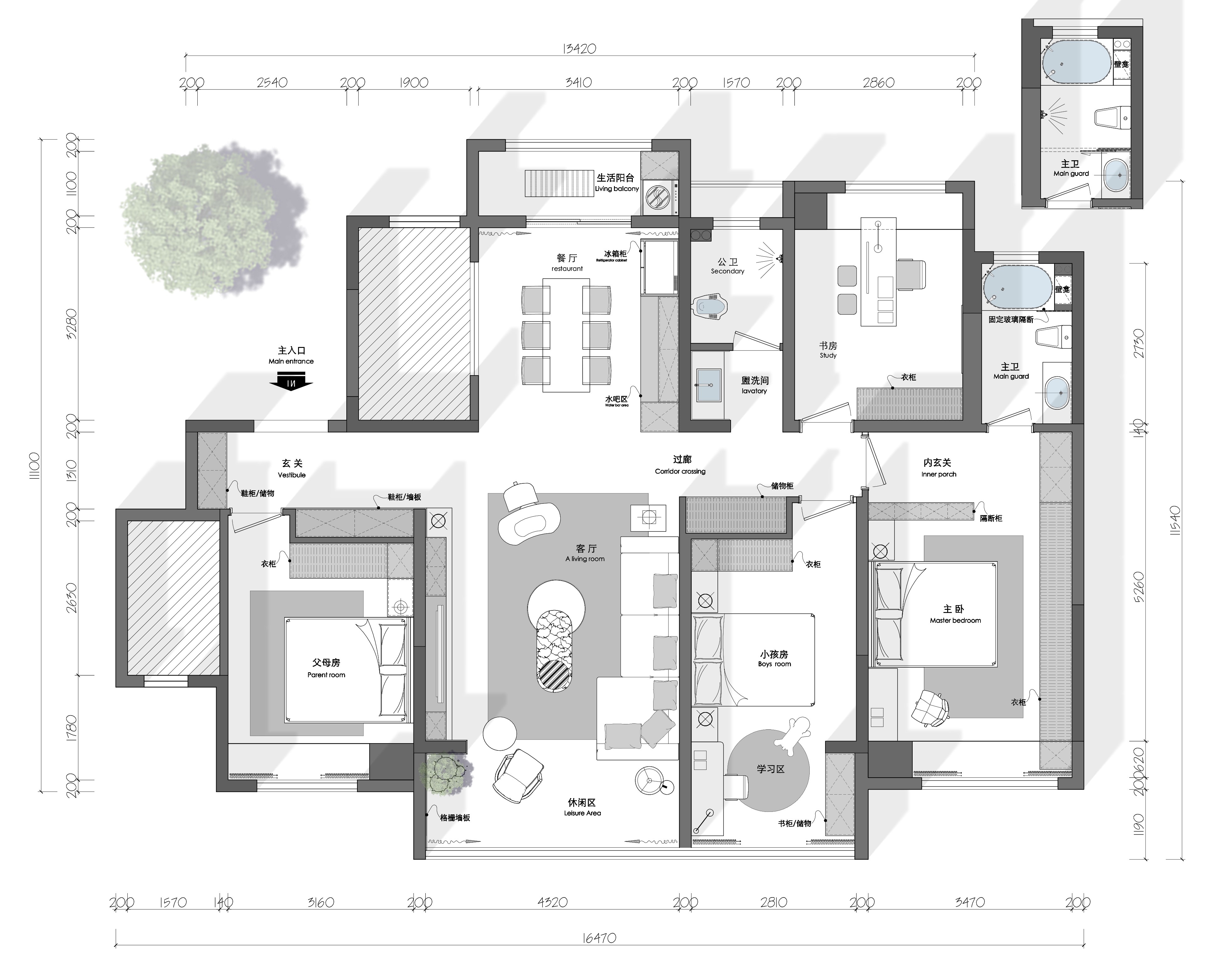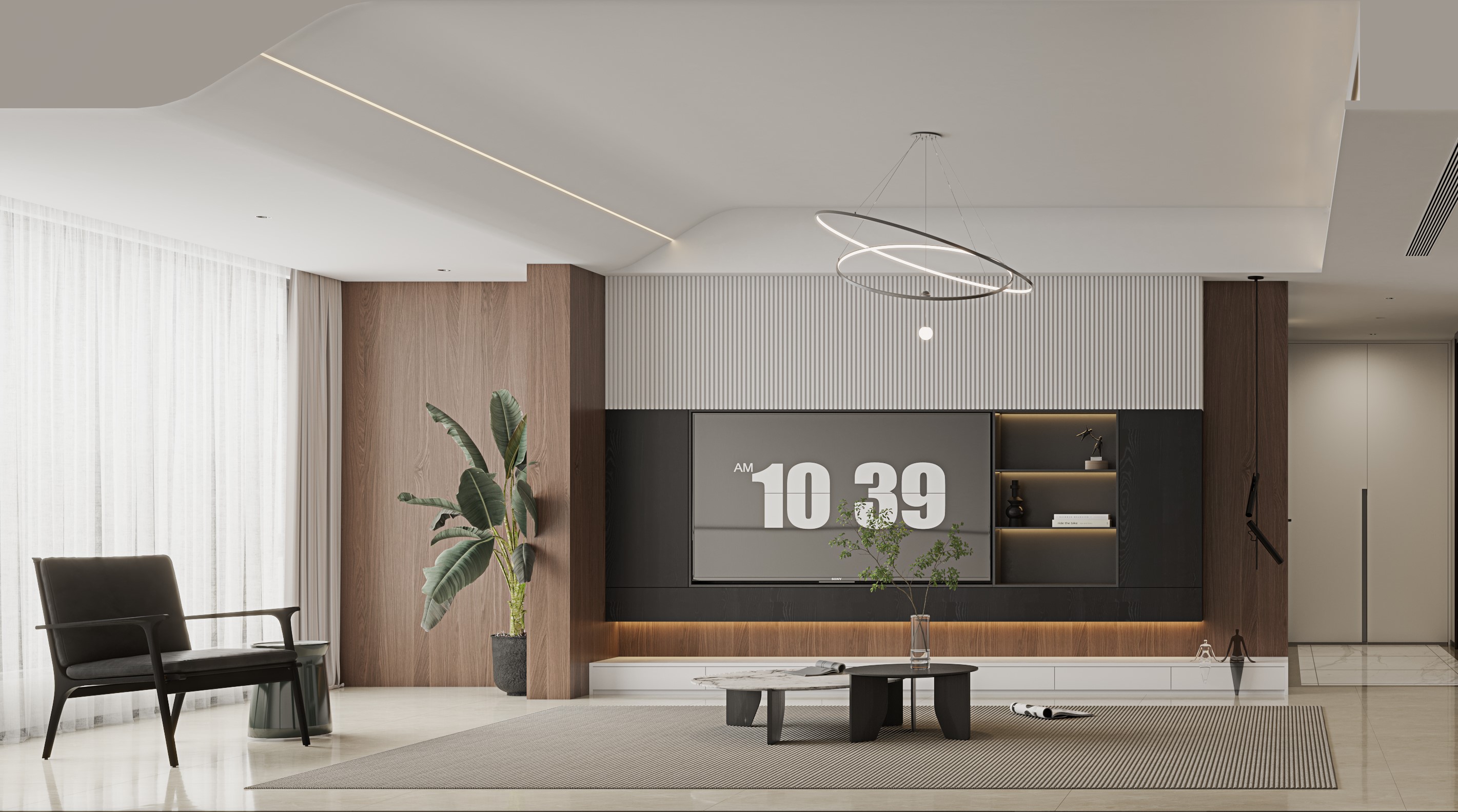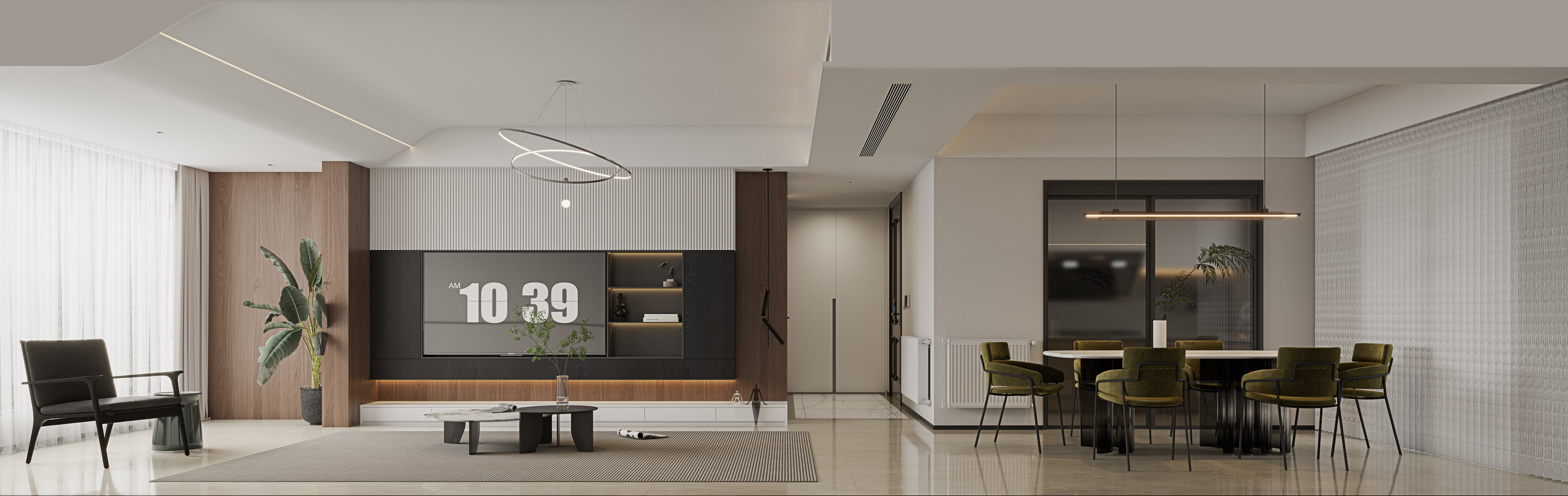 摈弃复杂的装饰是一种自由的观感,简单的木饰面块面处理、冰川灰墙面与黑色线性灯的对比,保证了空间的整体感。