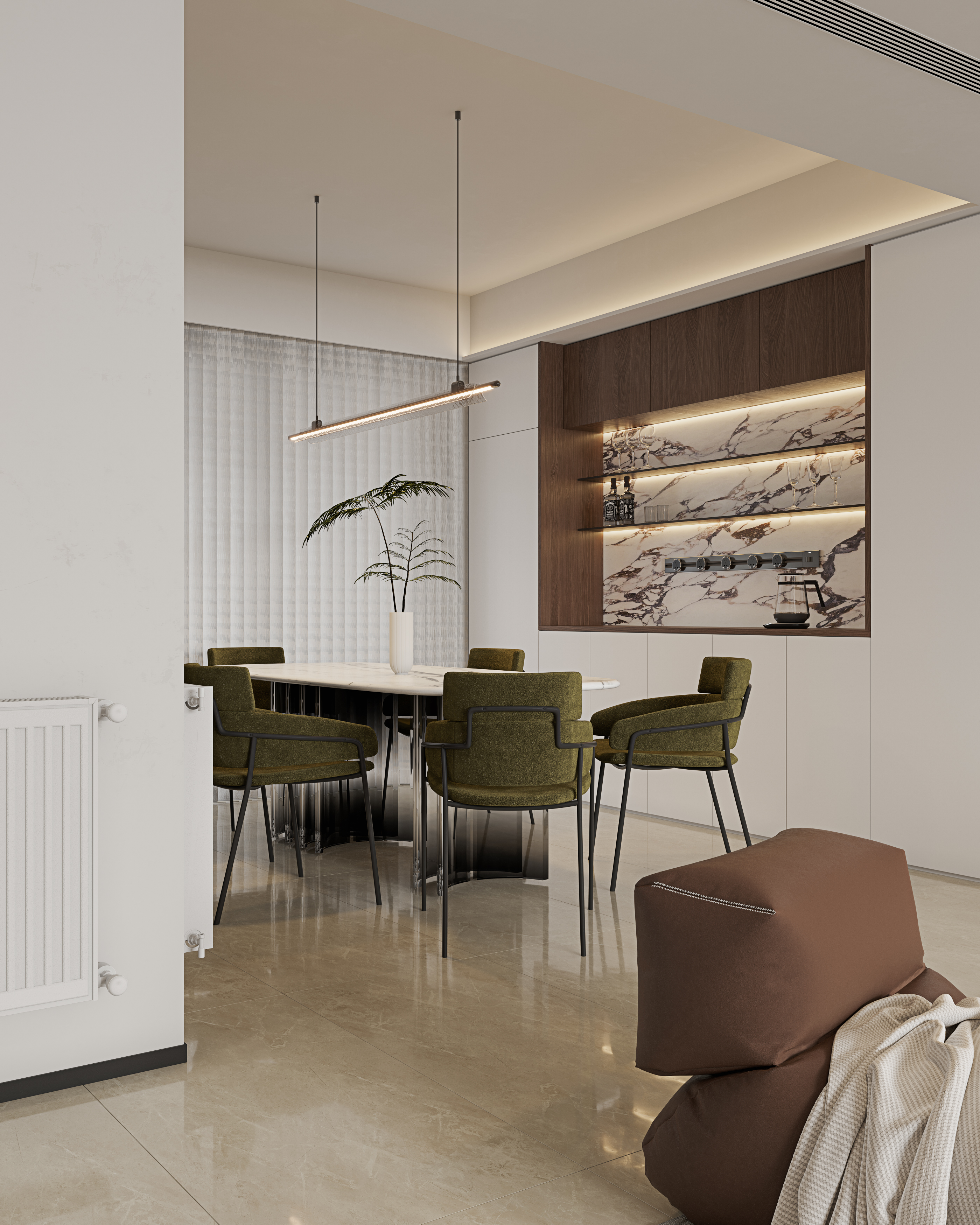 日光全方位洒满家的每个角落,大理石餐桌泛发独特的光泽。黑白纹理大理石餐桌搭配暗芥末绿色桌椅,色调与家具造型让空间具有艺术与自然美感,回归到生活的自然艺术中来。