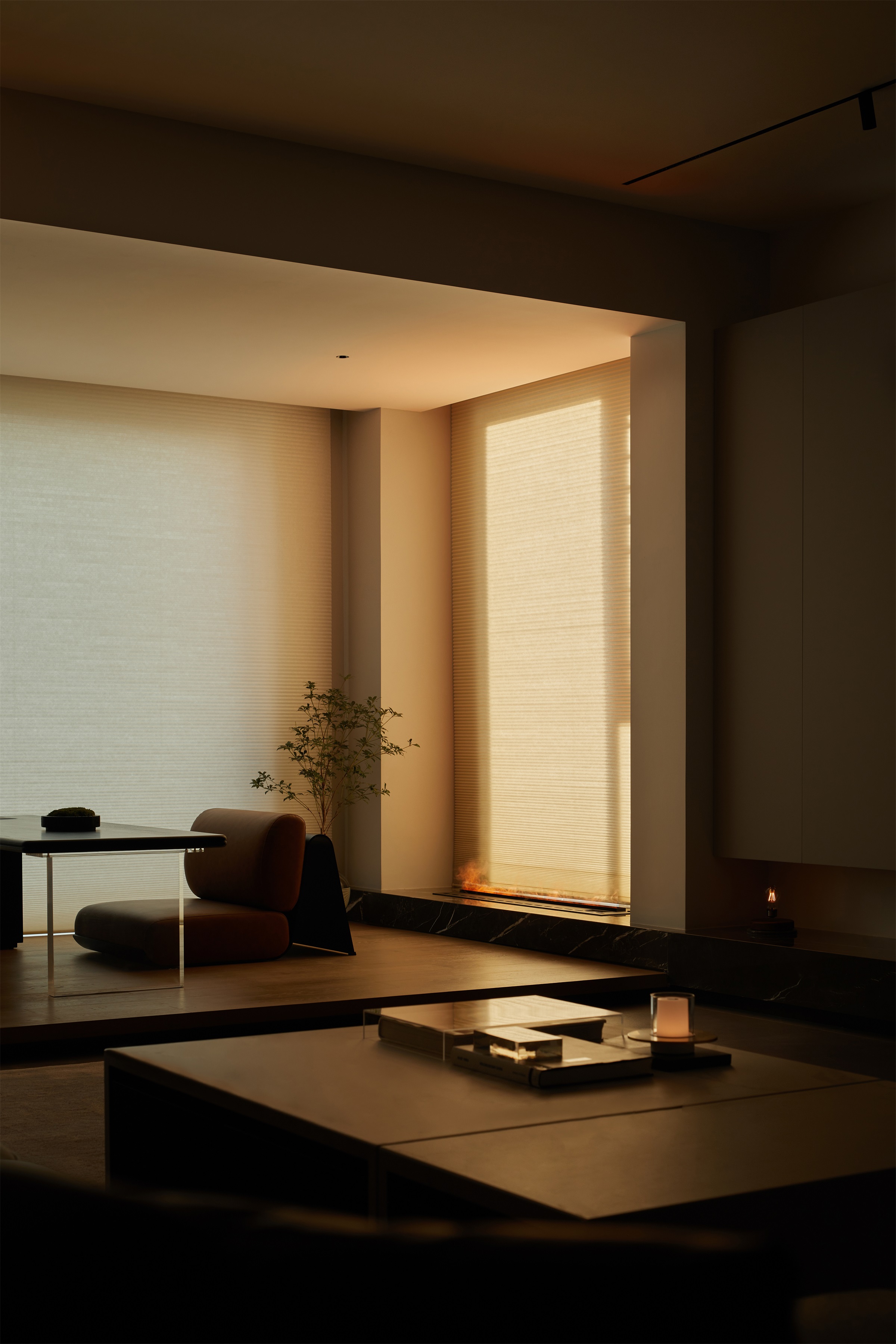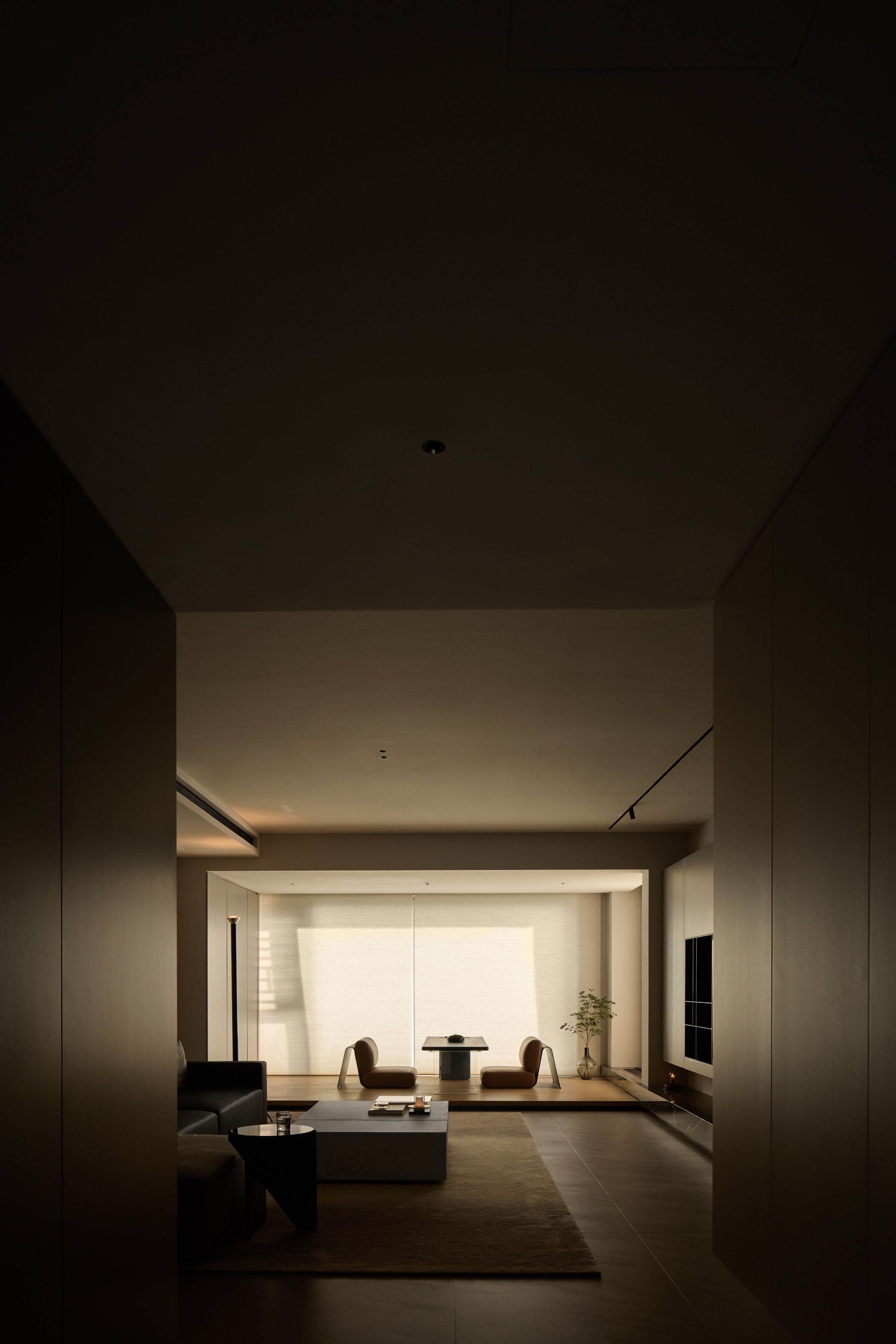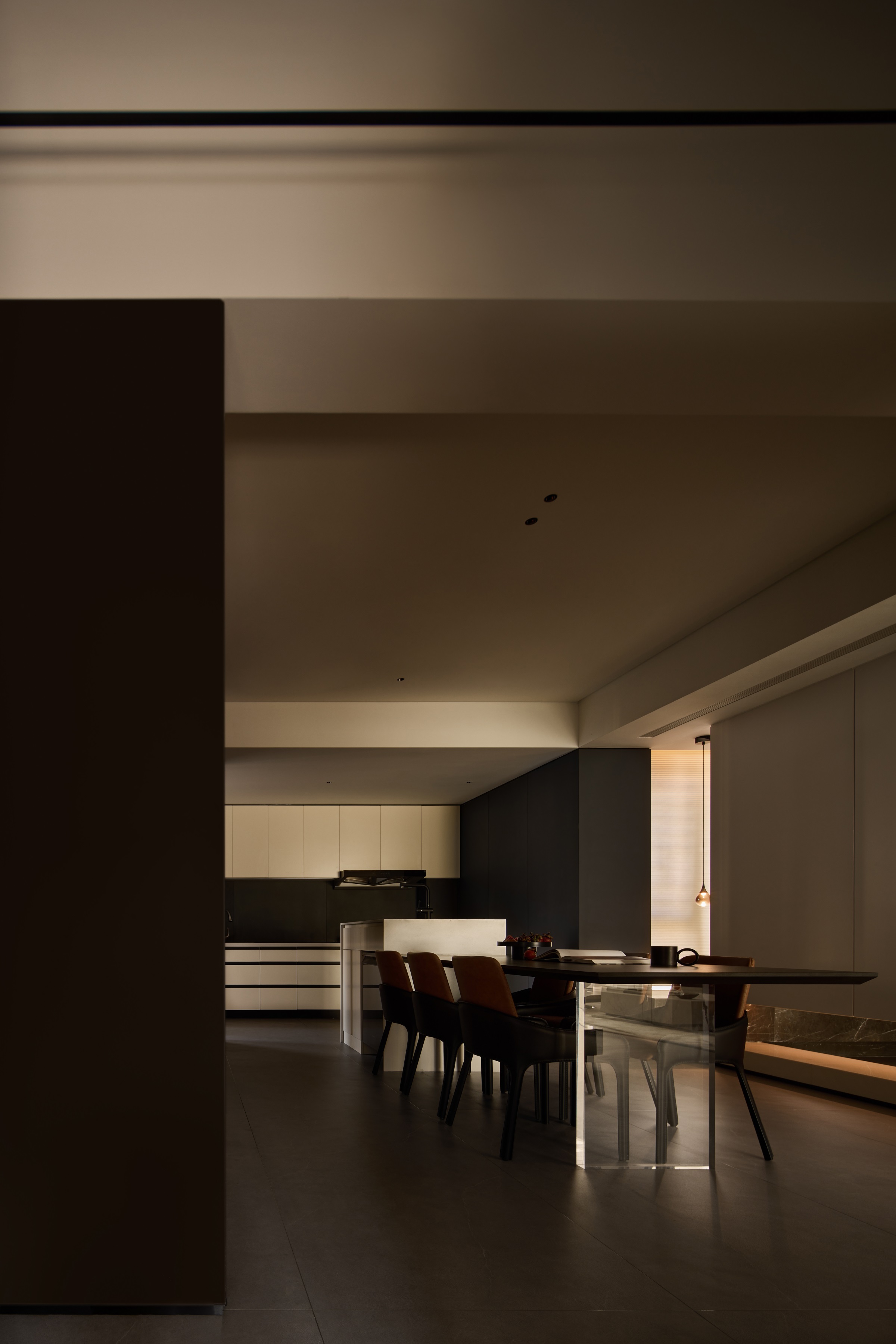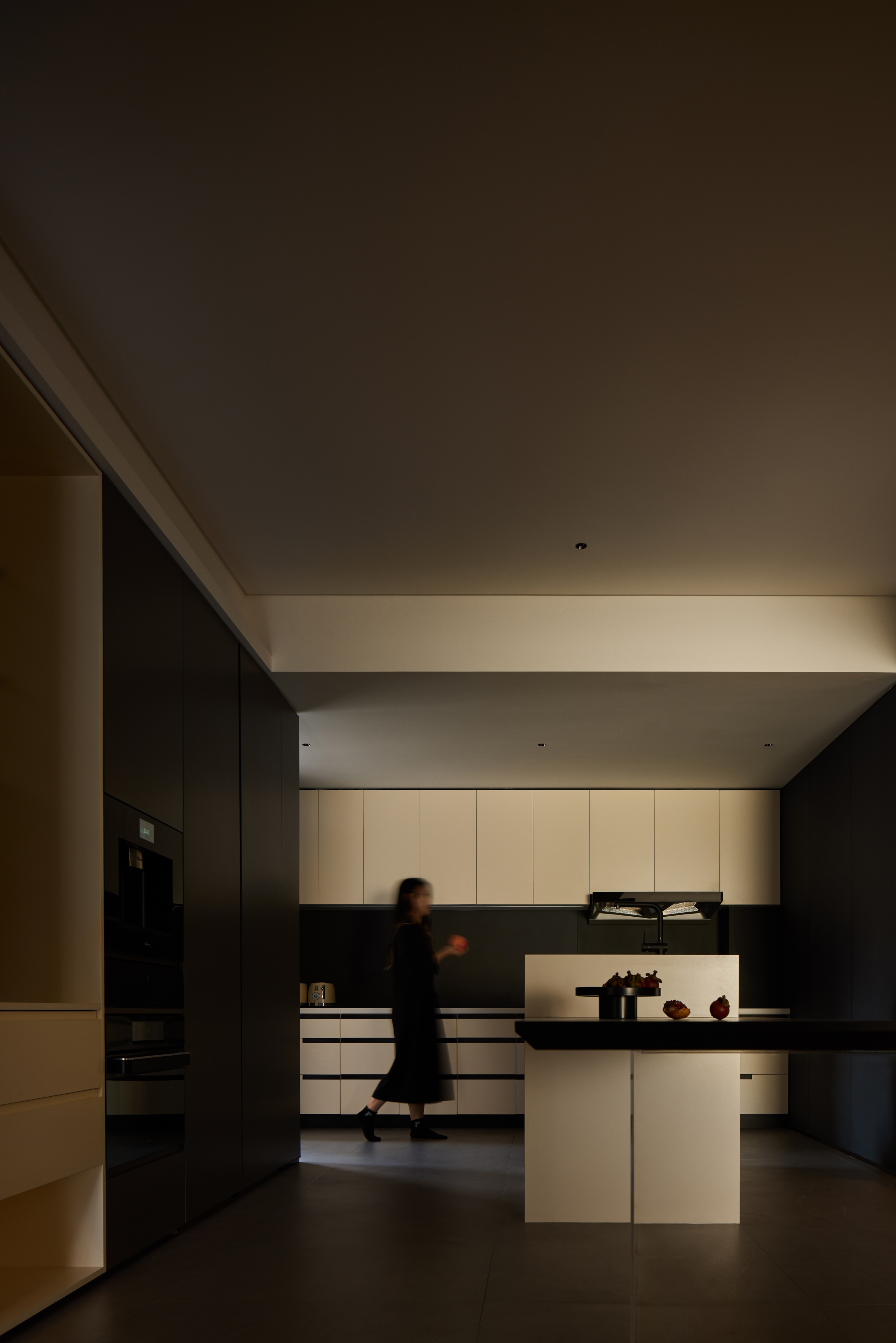 进门玄关设计了半悬浮的柜体,轻盈的视觉之下,收纳的包容力超强;同时内置智能设备,兼具除味除湿功能的贴心细节,确保了日常生活的舒爽。定制的换鞋凳位置,透过空置的间隙可以看到内景,与厨房刚好形成了相对应视觉关系,幸福便在互动的那一瞬间发生。公共区域则打破空间定式,客餐厨全开放塑造阔绰的视觉尺度;并将阳台纳入并改造成观景休闲区,为屋主创建风雅自生的茶室,还透过自动升降帘,让人一键开启便欣赏到美景。