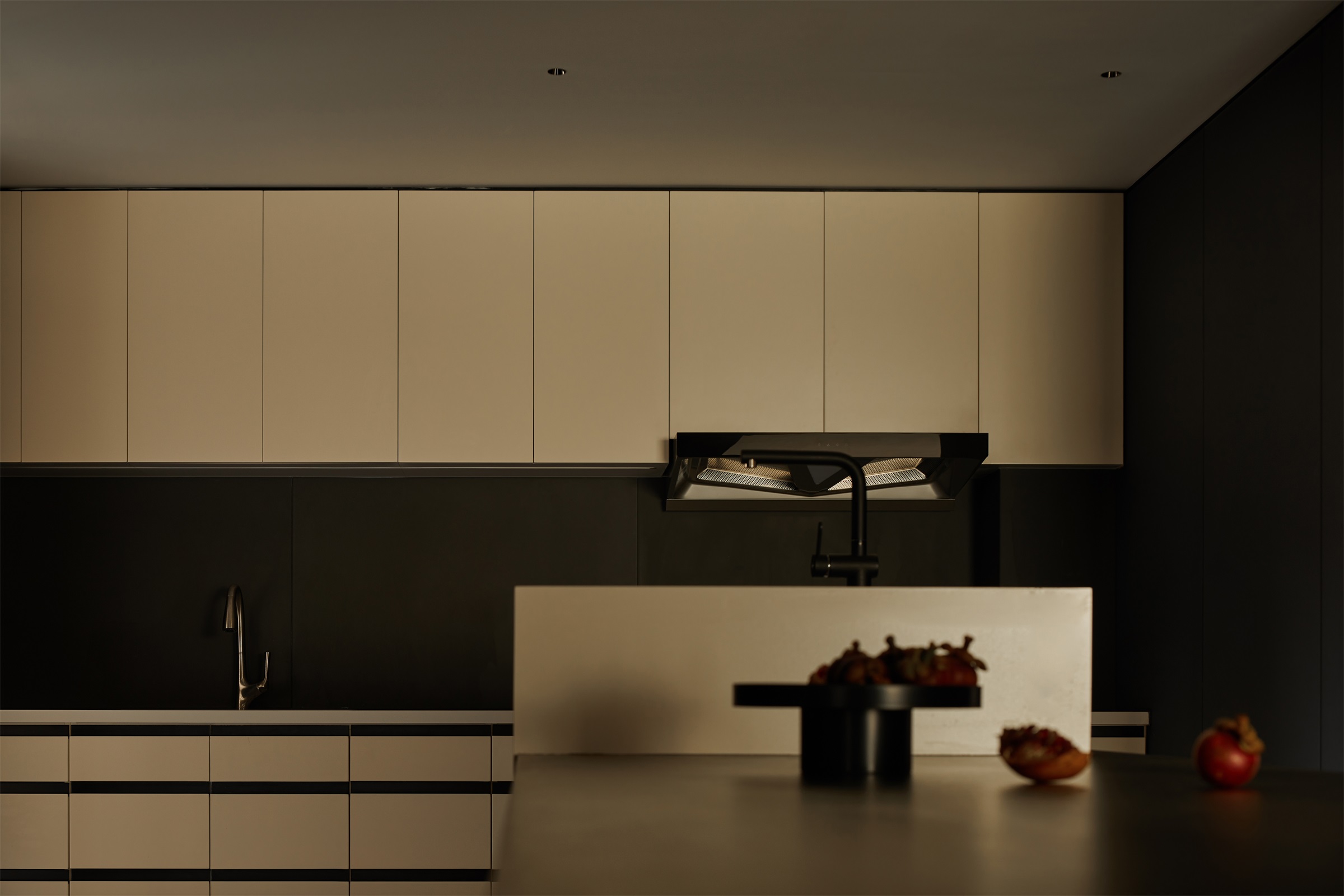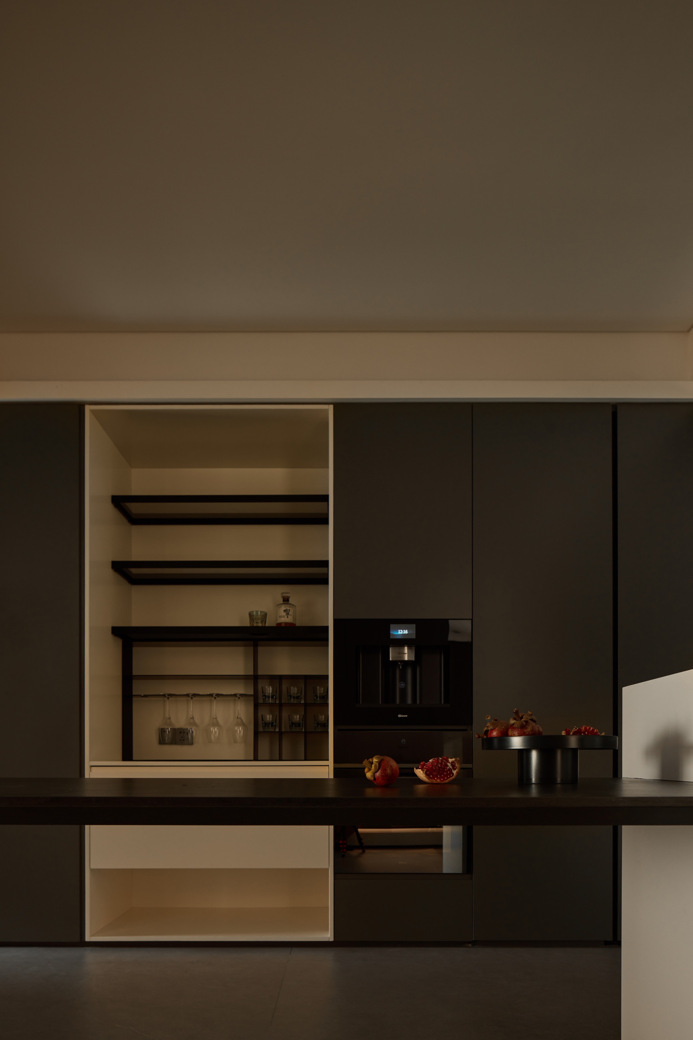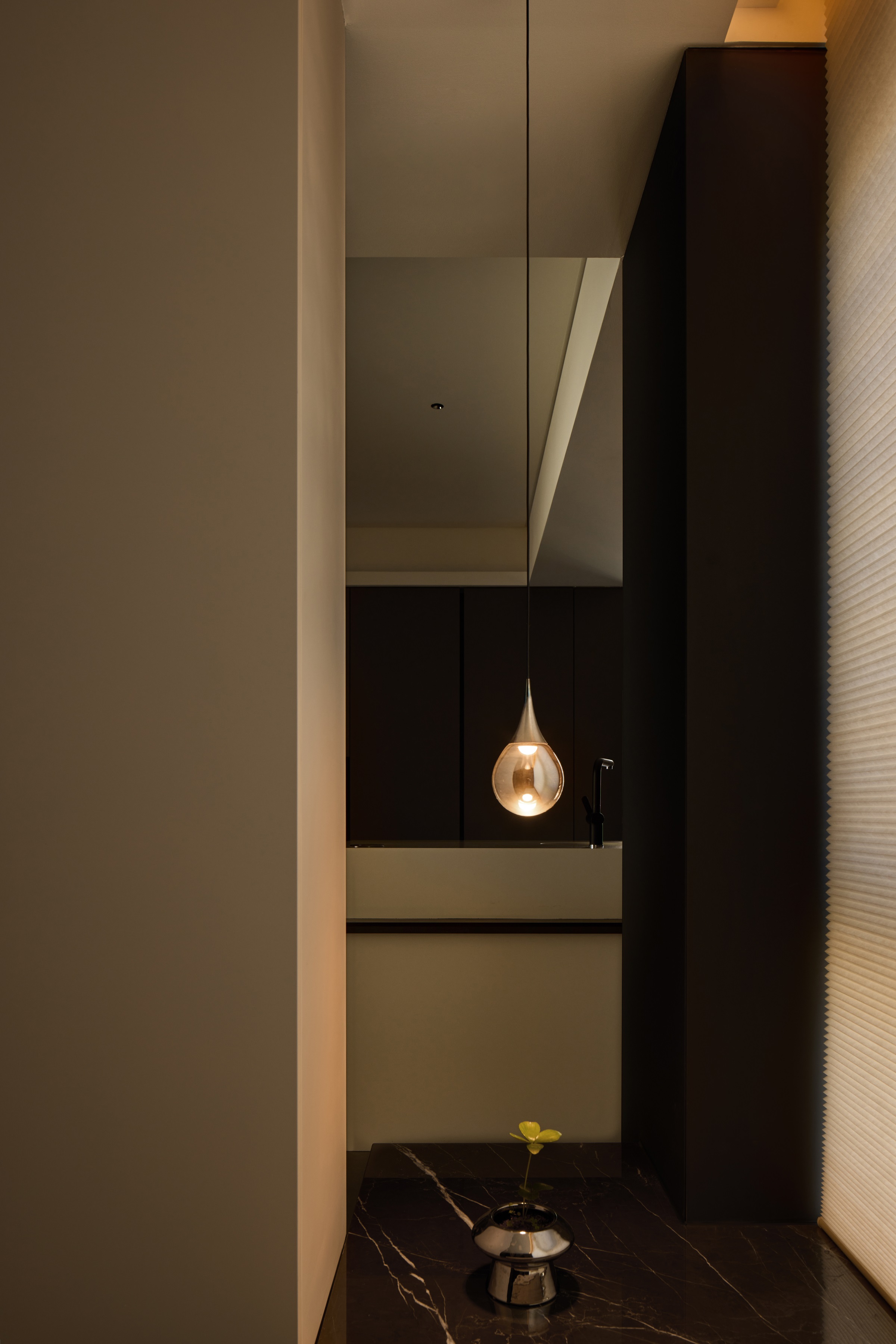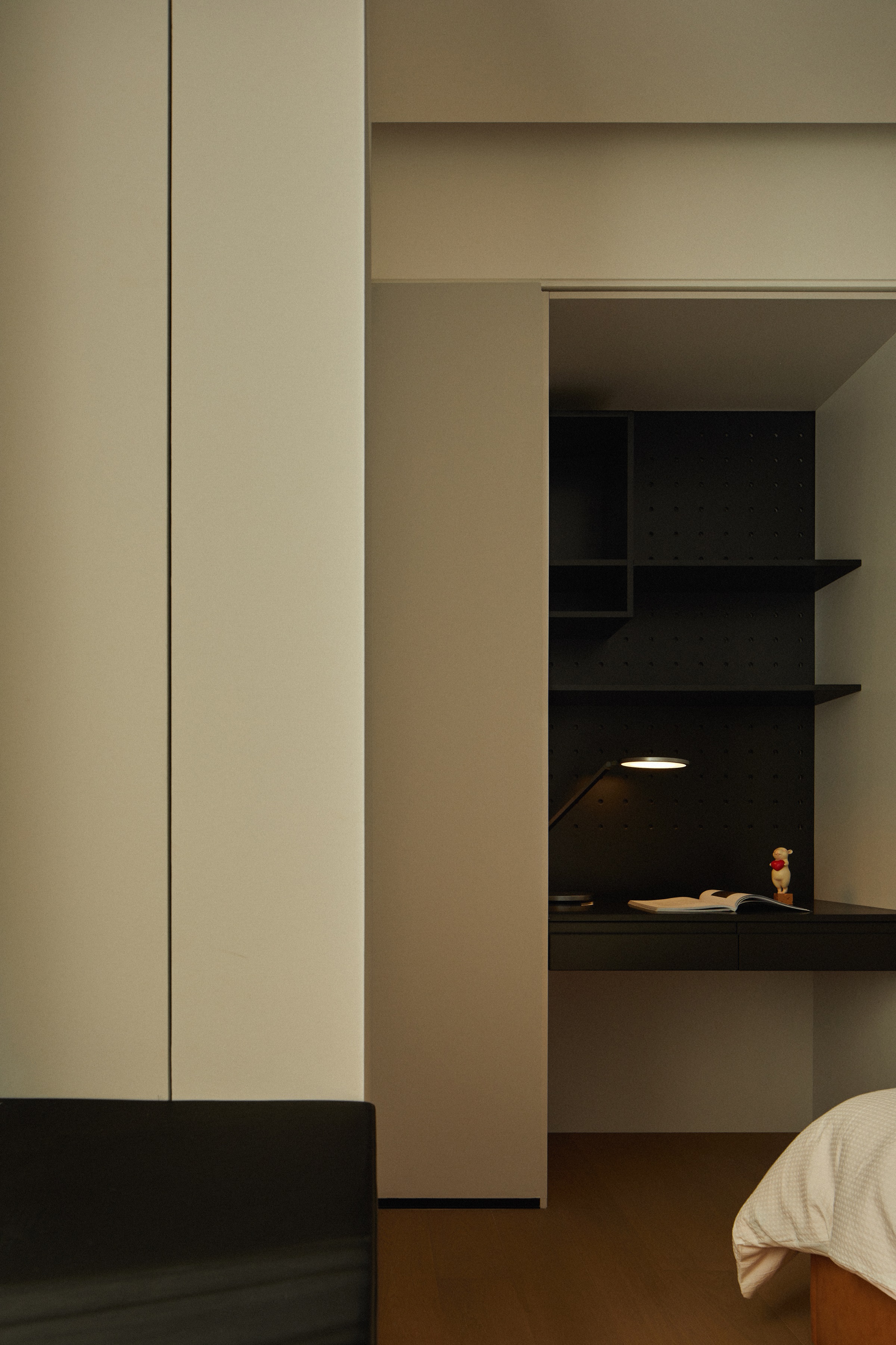 进门玄关设计了半悬浮的柜体,轻盈的视觉之下,收纳的包容力超强;同时内置智能设备,兼具除味除湿功能的贴心细节,确保了日常生活的舒爽。定制的换鞋凳位置,透过空置的间隙可以看到内景,与厨房刚好形成了相对应视觉关系,幸福便在互动的那一瞬间发生。公共区域则打破空间定式,客餐厨全开放塑造阔绰的视觉尺度;并将阳台纳入并改造成观景休闲区,为屋主创建风雅自生的茶室,还透过自动升降帘,让人一键开启便欣赏到美景。
