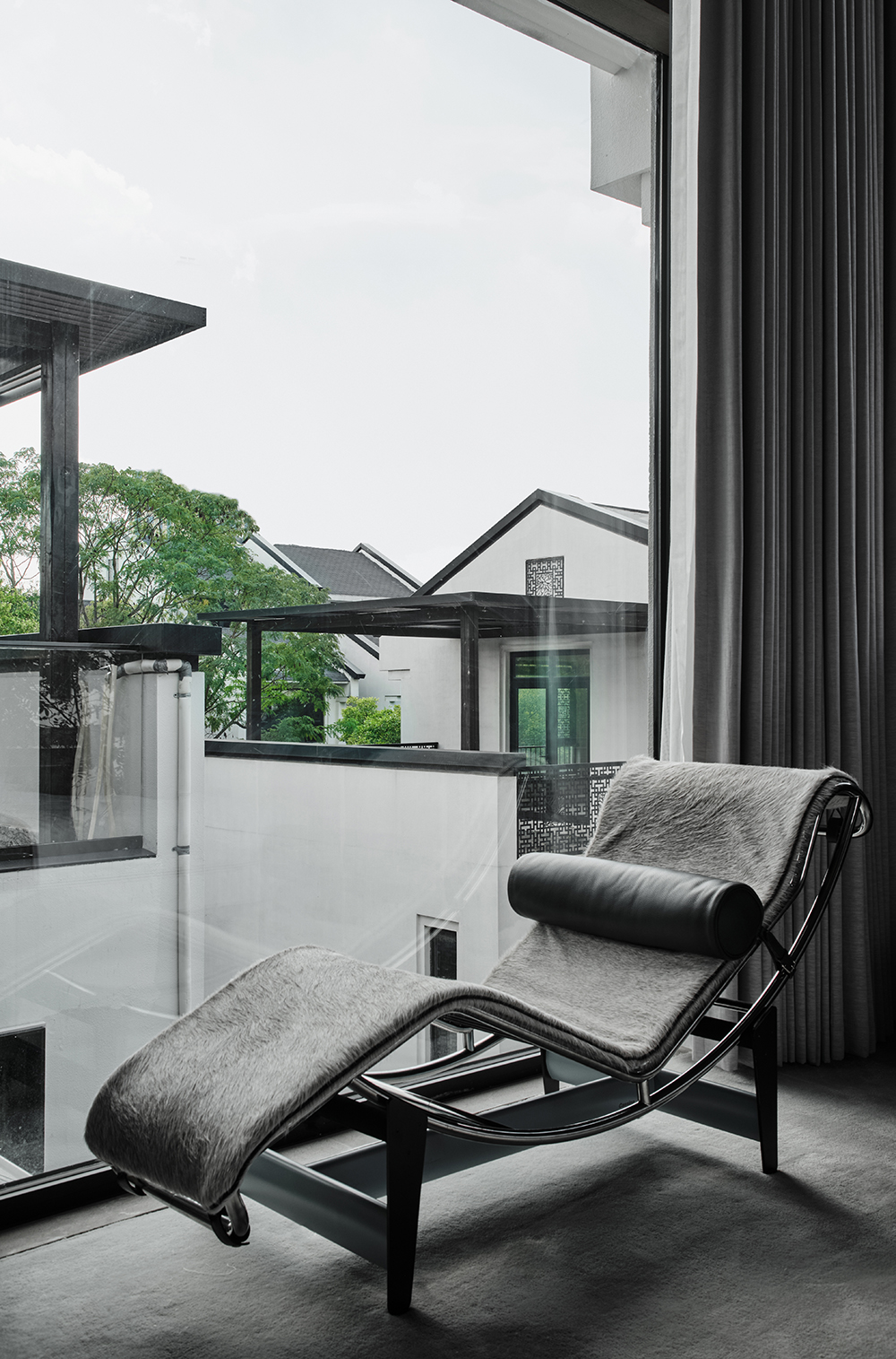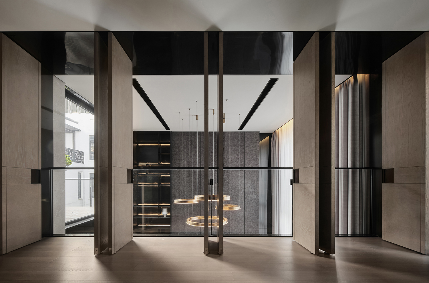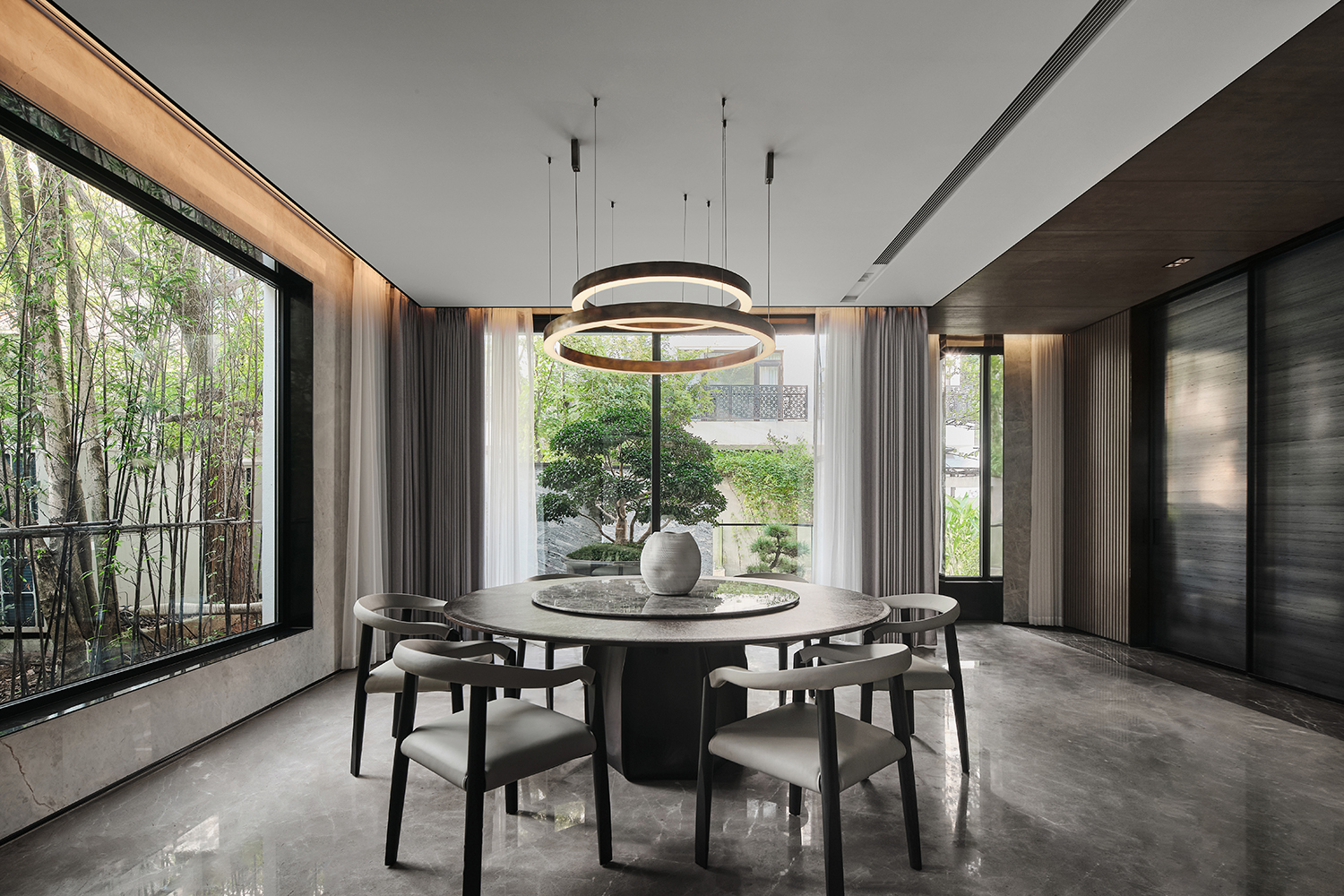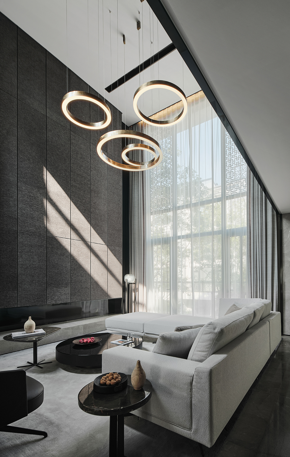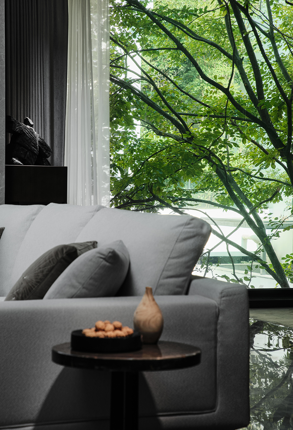 从地下车库入户,负一以开放的安态迎接主人归家,借用框景、借景等建筑语言将外在景观收揽为室内画面,声音、日影、光热、空气、水雾等自然元素被导入室内且加以控制,形望空间氛围及居住质地。自二楼向上,设计趋于探索私人空间的内在向重,露台、花窗、走南、过道、书房新次深入更校心的生活领域,抽离世俗的拘束和繁琐,构筑一种乘物游心的超然态度。