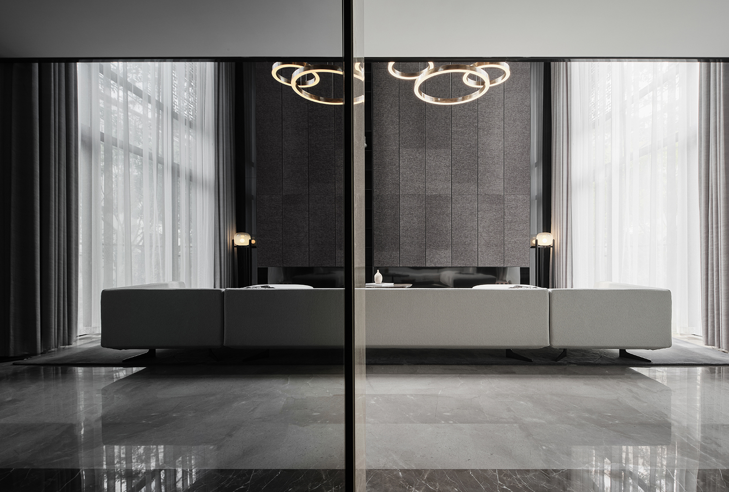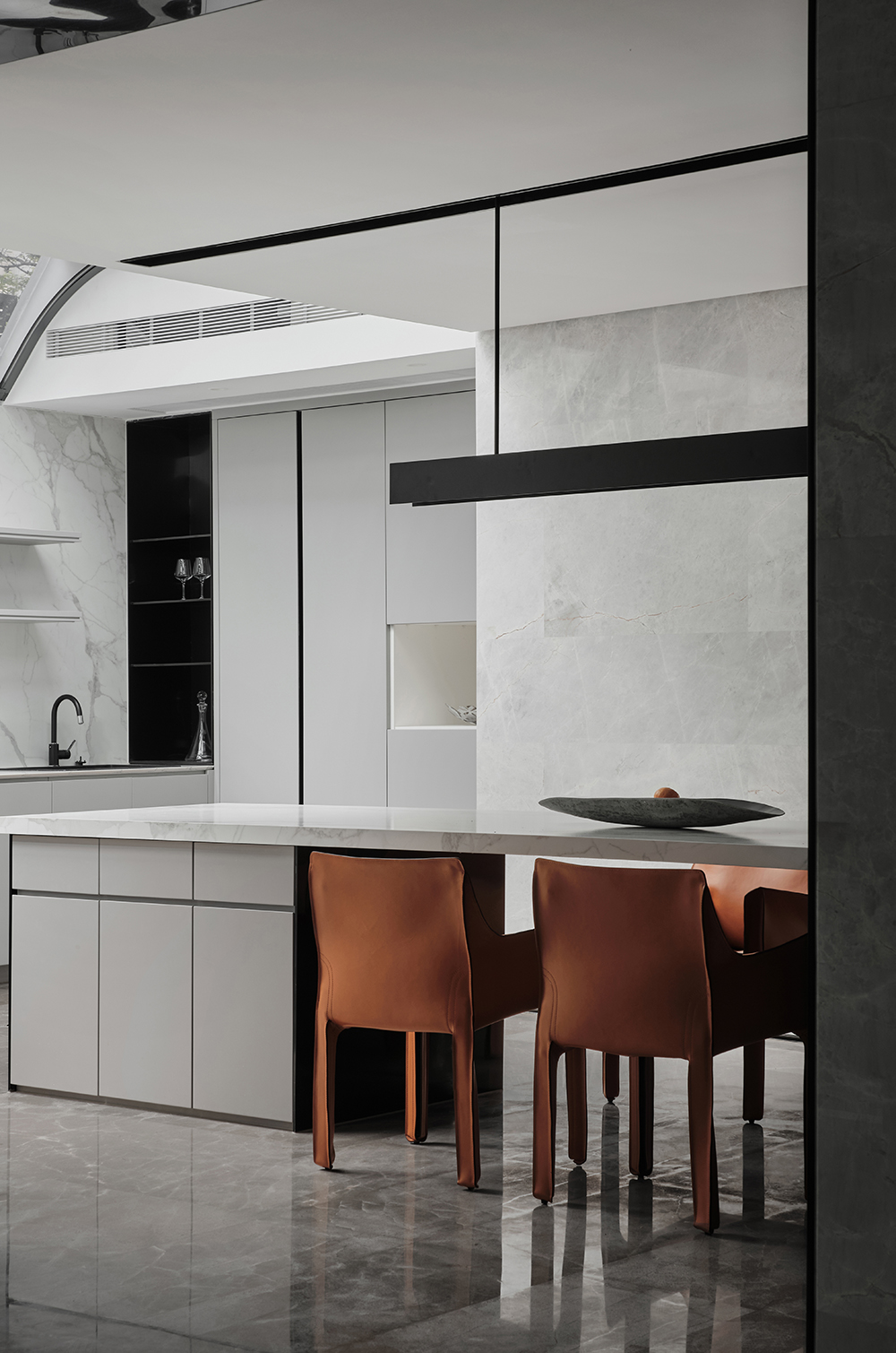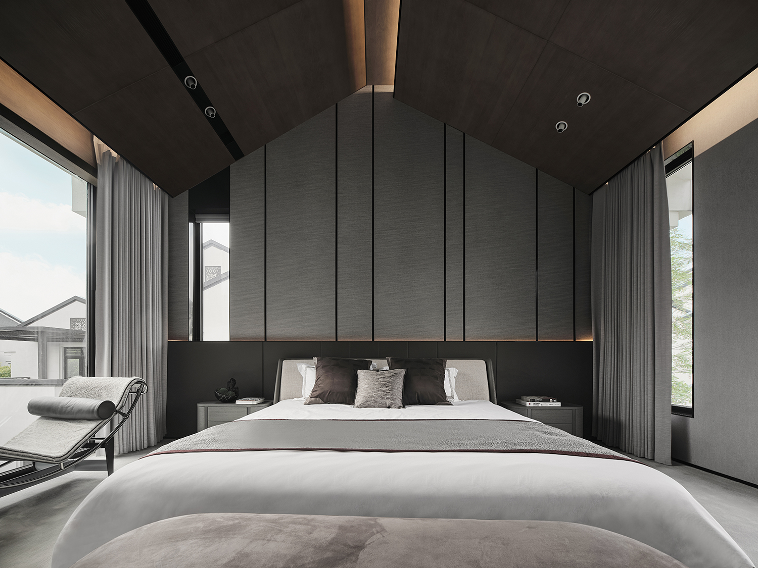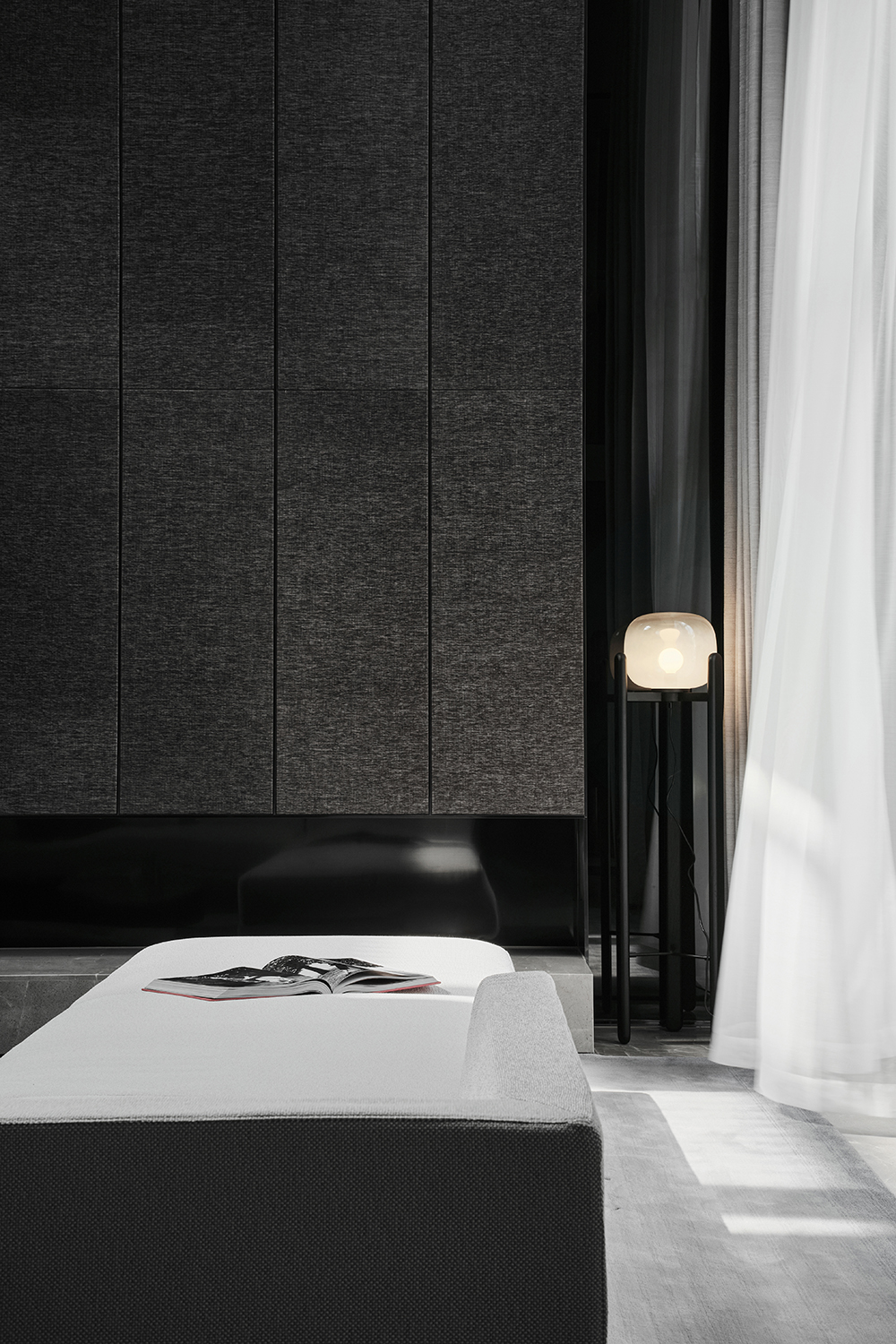 从地下车库入户,负一以开放的安态迎接主人归家,借用框景、借景等建筑语言将外在景观收揽为室内画面,声音、日影、光热、空气、水雾等自然元素被导入室内且加以控制,形望空间氛围及居住质地。自二楼向上,设计趋于探索私人空间的内在向重,露台、花窗、走南、过道、书房新次深入更校心的生活领域,抽离世俗的拘束和繁琐,构筑一种乘物游心的超然态度。