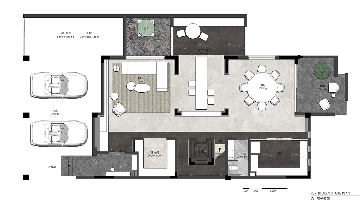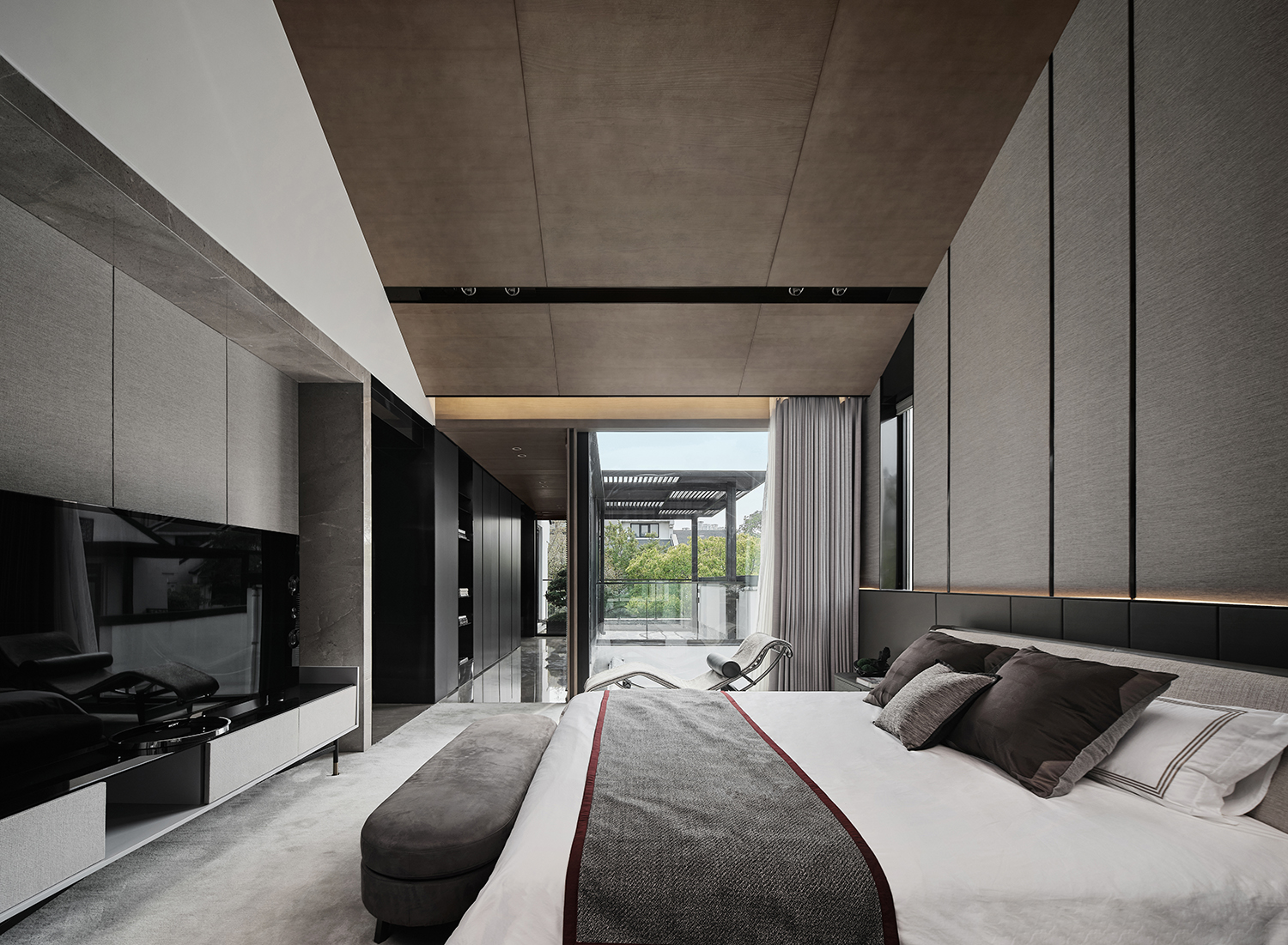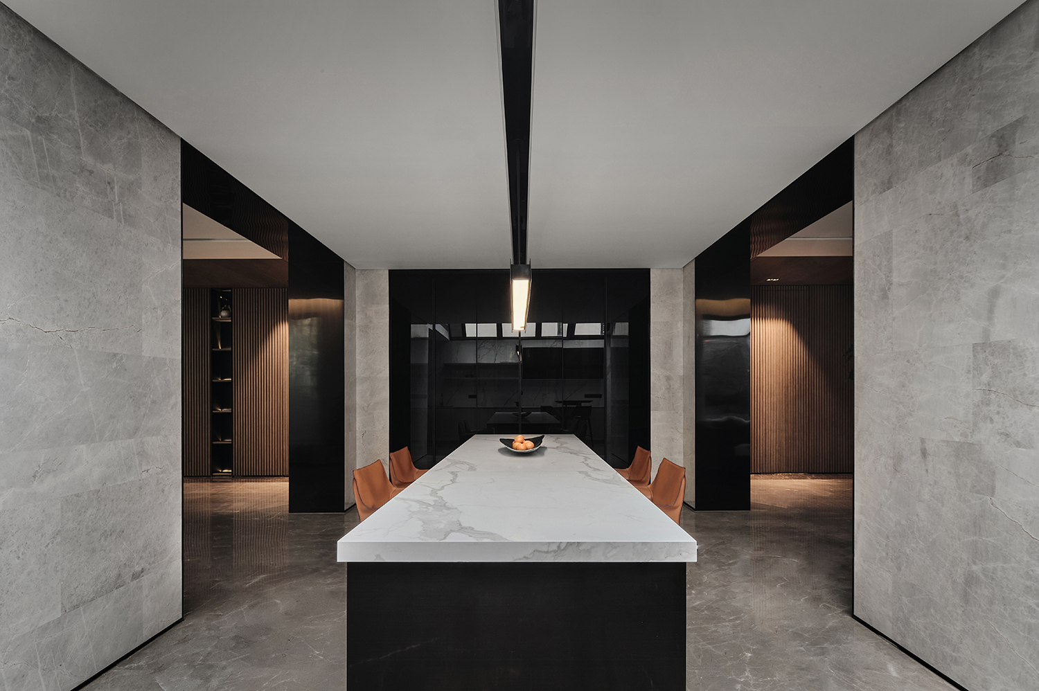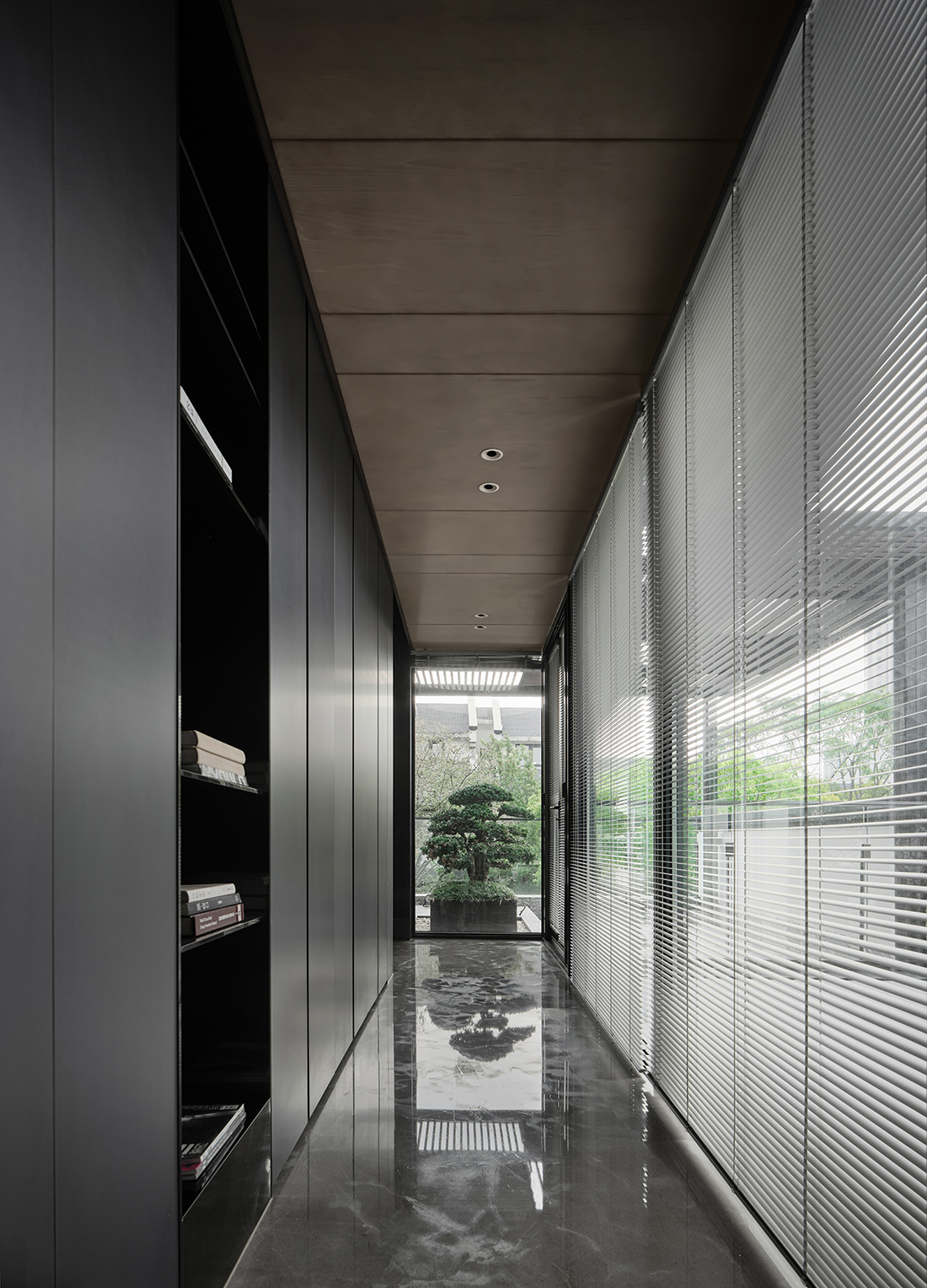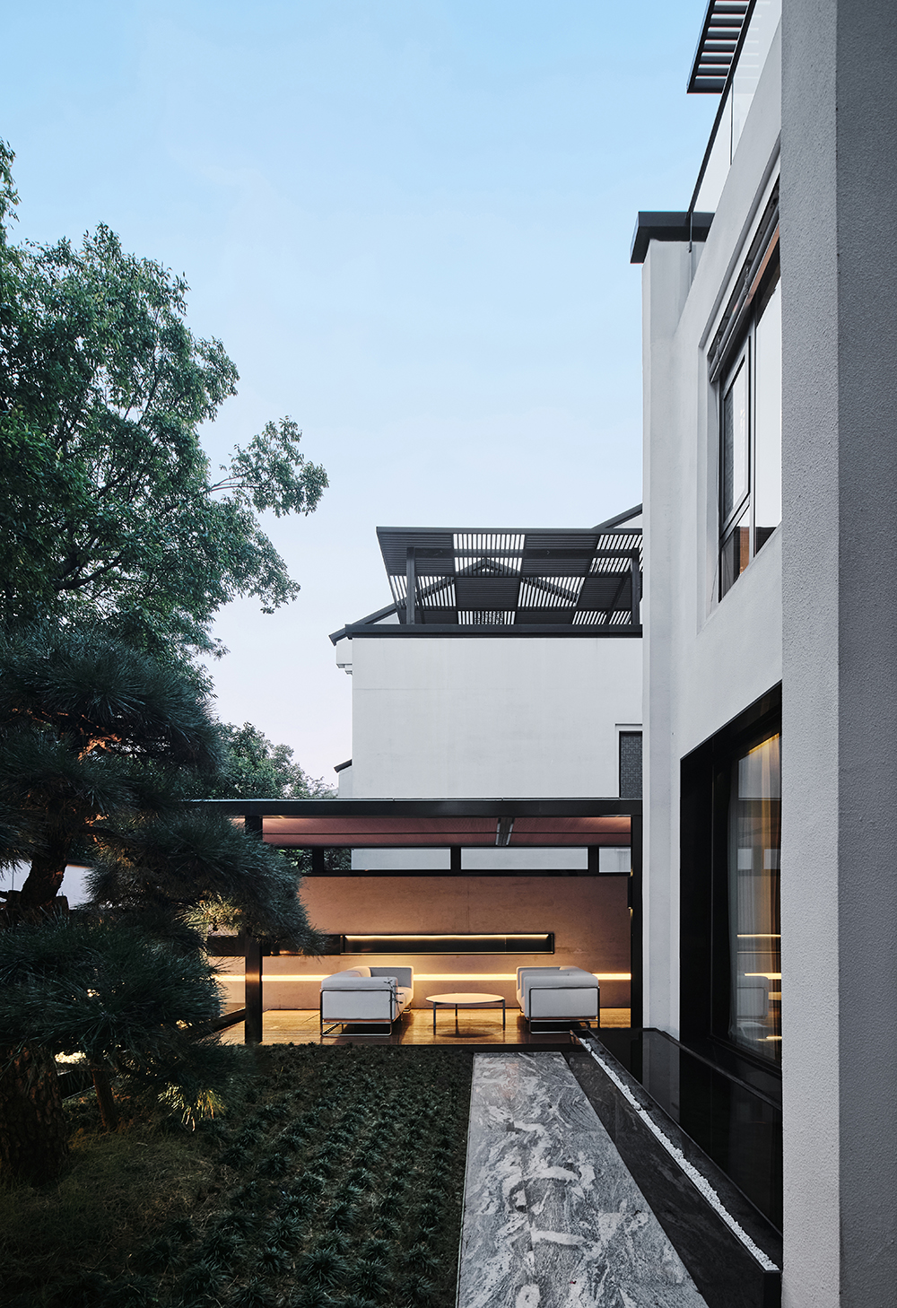 从地下车库入户,负一以开放的安态迎接主人归家,借用框景、借景等建筑语言将外在景观收揽为室内画面,声音、日影、光热、空气、水雾等自然元素被导入室内且加以控制,形望空间氛围及居住质地。自二楼向上,设计趋于探索私人空间的内在向重,露台、花窗、走南、过道、书房新次深入更校心的生活领域,抽离世俗的拘束和繁琐,构筑一种乘物游心的超然态度。