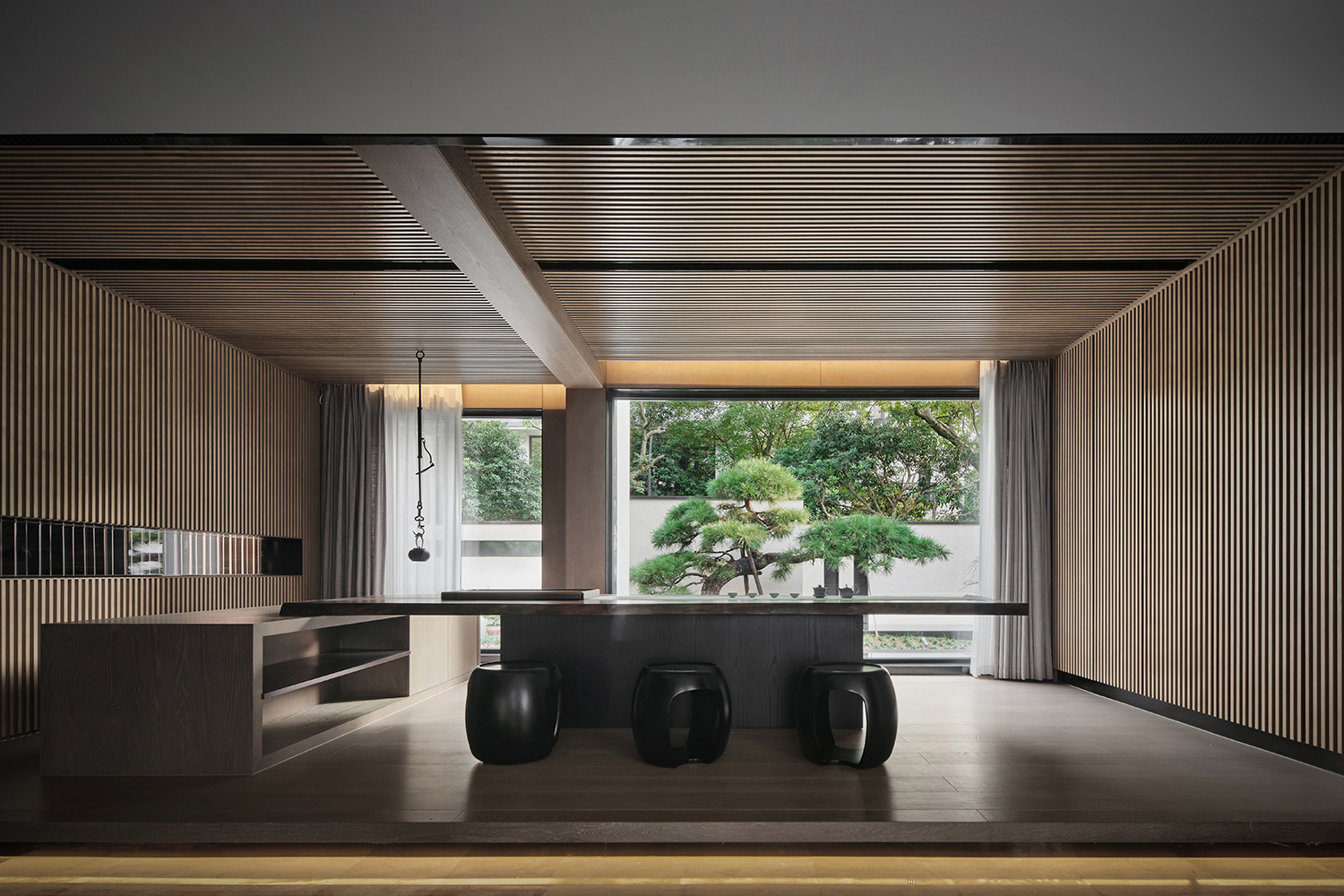 超长县挑注续岩板抽屁柜凝聚视觉焦点,兼具实用性与艺术美感,并与米色半国合沙发在色彩上形威呼应。当柜门全部闭合时,它延伸为一扇带有鞋炉的客厅墙壁而当柜门打开,县浮式集成电视露出,紧凑的表面呈现出完整的功能指向和丰富的空间层次,以及公共区域的亲密属性。2、茶宝临窗,天然木材的肌理搭配纵向排布的性,极简影像渗于其内·艺术集置、伤古戴凳、中式瓶器、内嵌灯带、隐藏式音箱、多宝格与庭院青松的点绍,使得空间在东方式风雅里又徽显着超越物表的现代兴味。