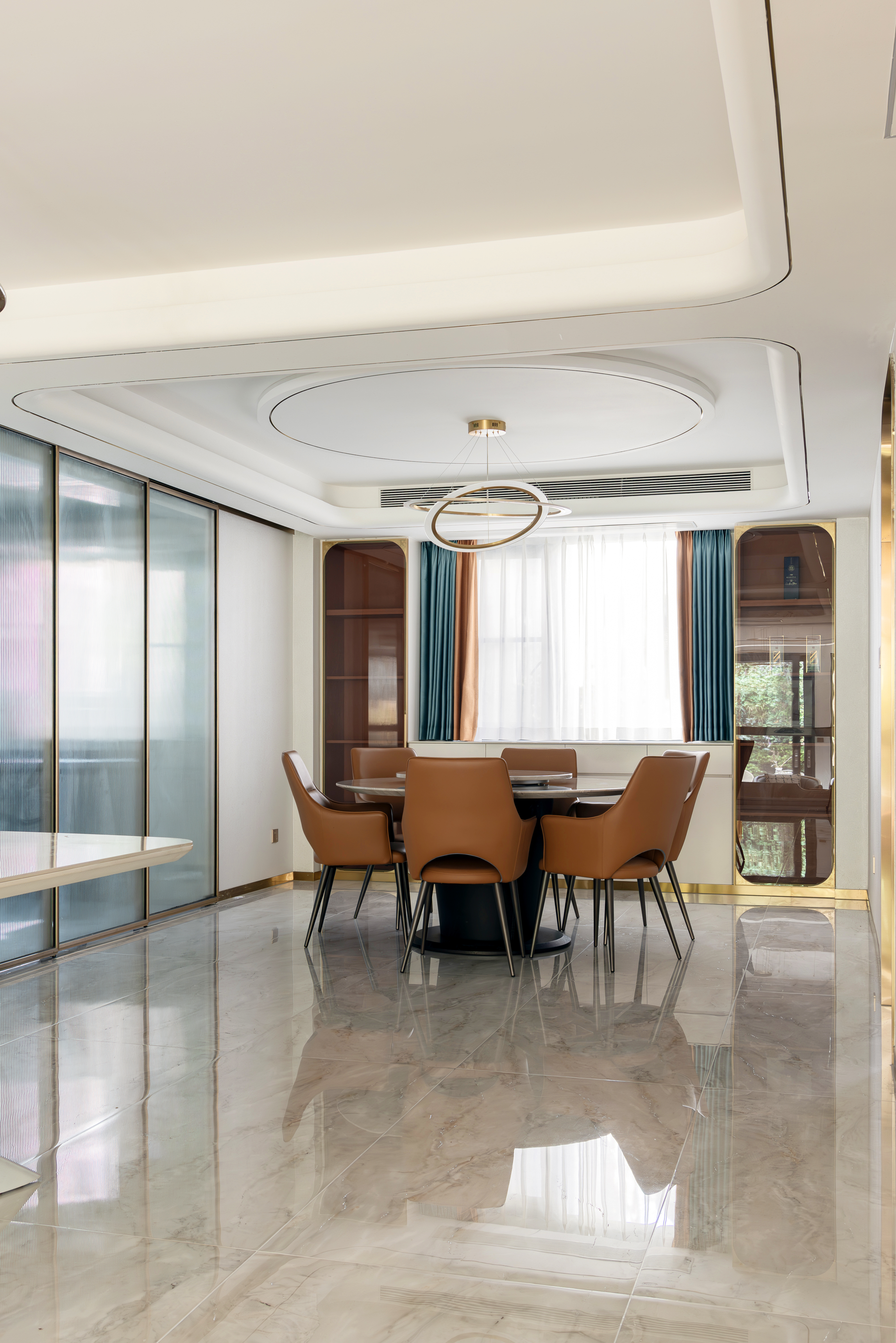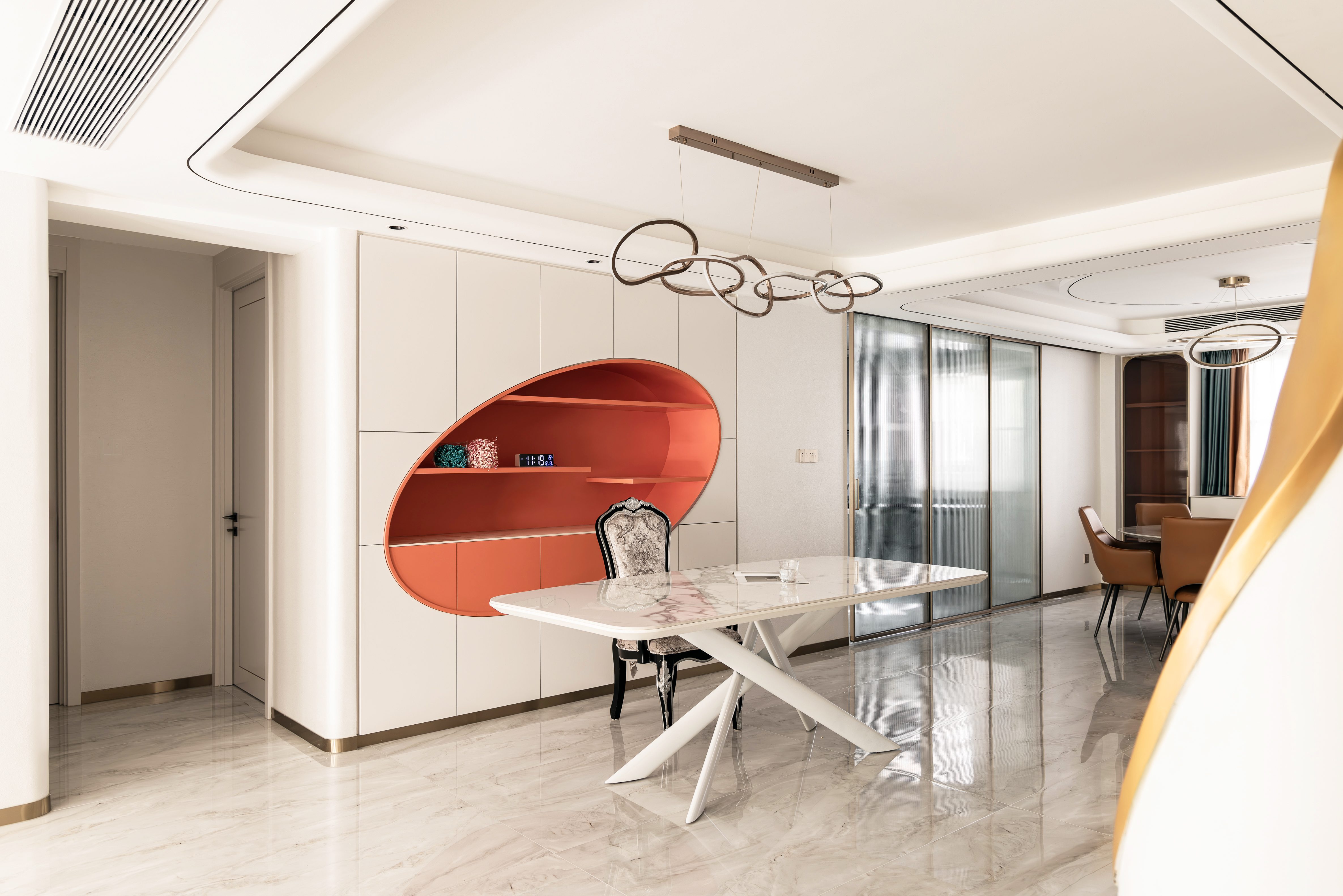 空间布局:利用公共过厅改入户门反向解决入门即餐厅,把原餐厅改到入户旁边和客厅一起联动,让整个空间会更加的宽敞