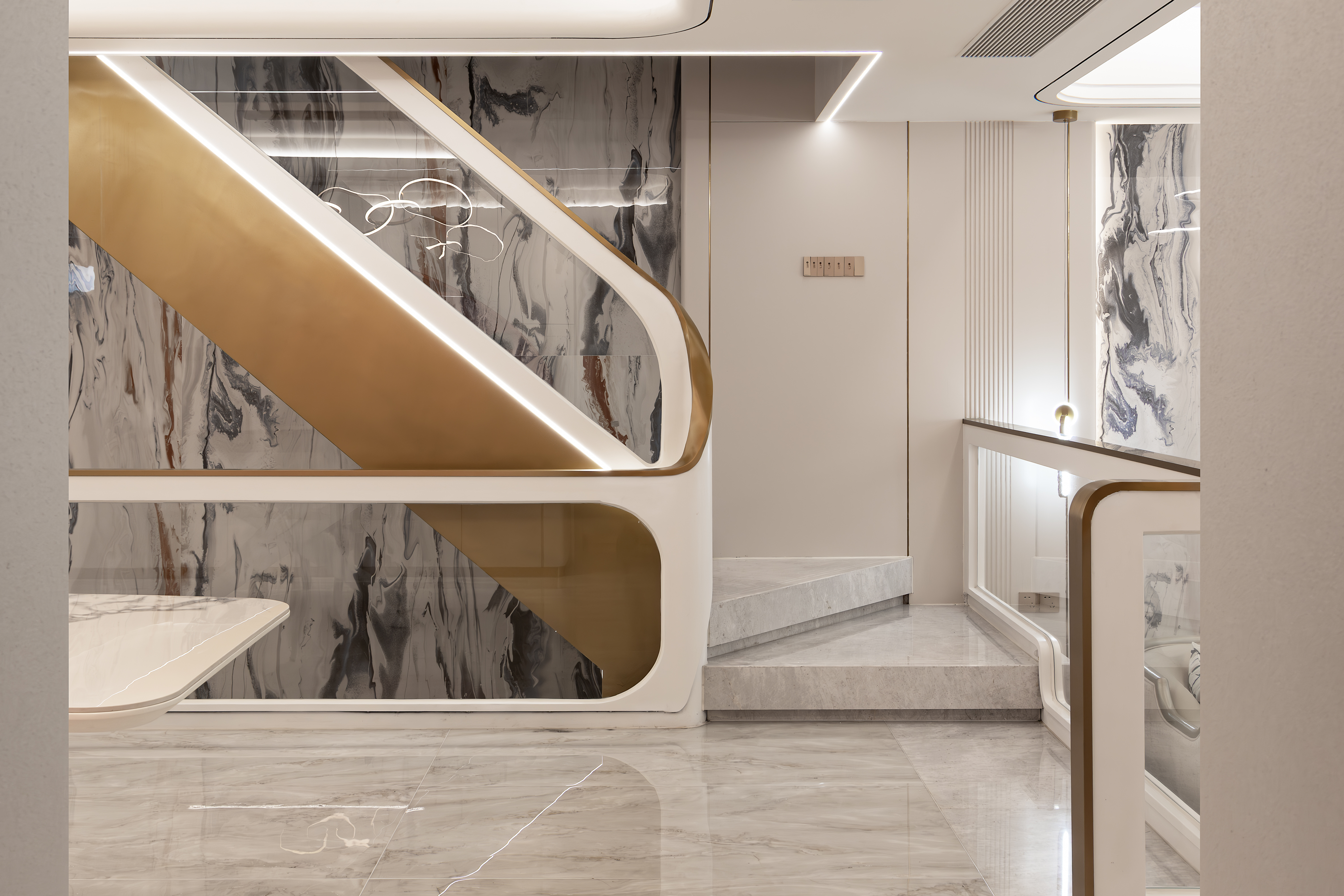 设计选材:墙面整体使用艺术让整体空间更干净,部分点缀护墙和岩板让空间更具有灵动性