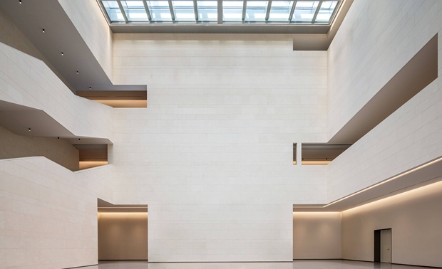 西大厅为国家领导人、重要外宾及友人接待区域,设计师将耐候钢板延续至此,强调此区域的重要性,天花部分采用仿阳极氧化铝板的不锈钢板,与耐候钢板对应后规律展开,冷暖交相呼应,平衡中凸显精致且不喧宾夺主的设计细节。