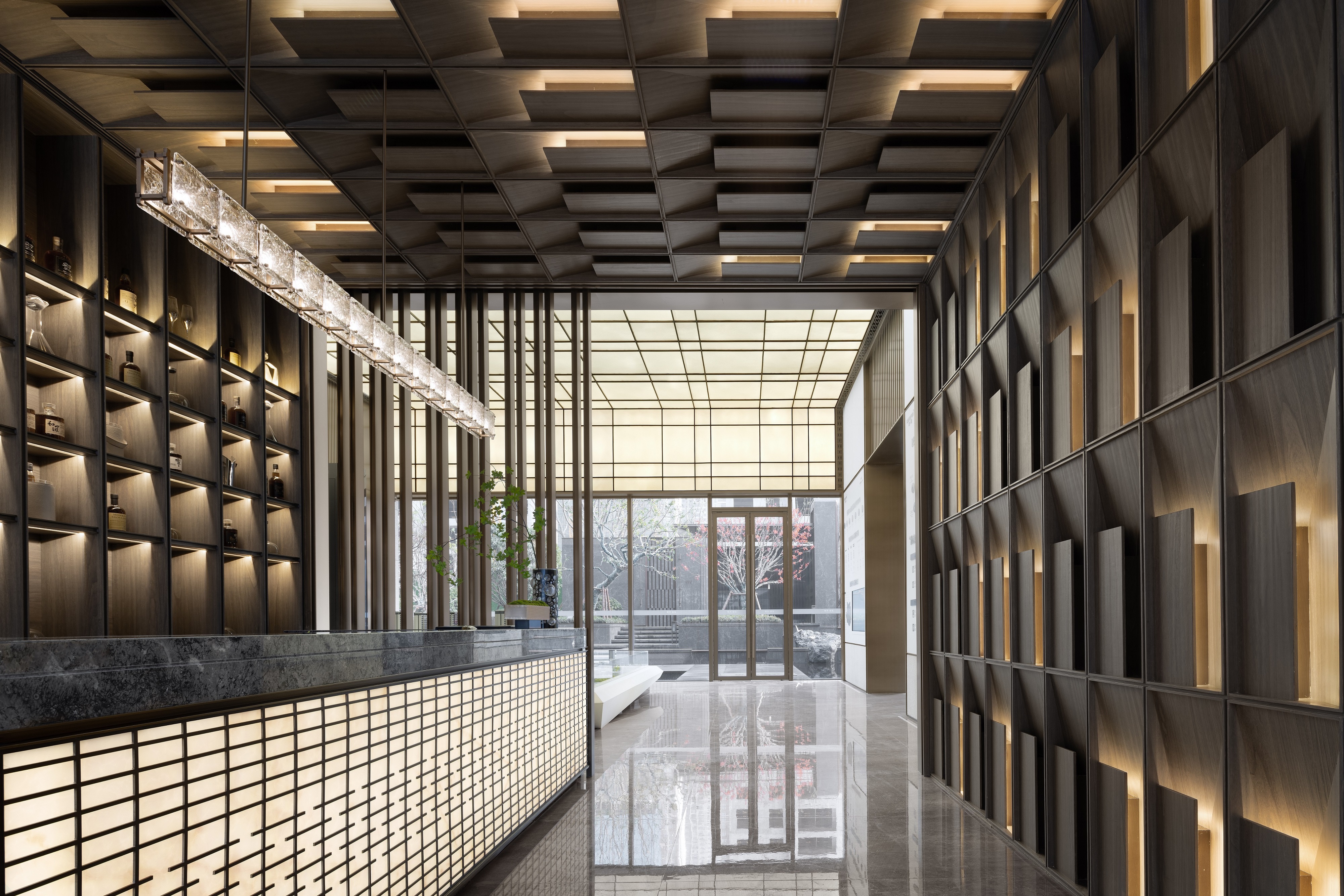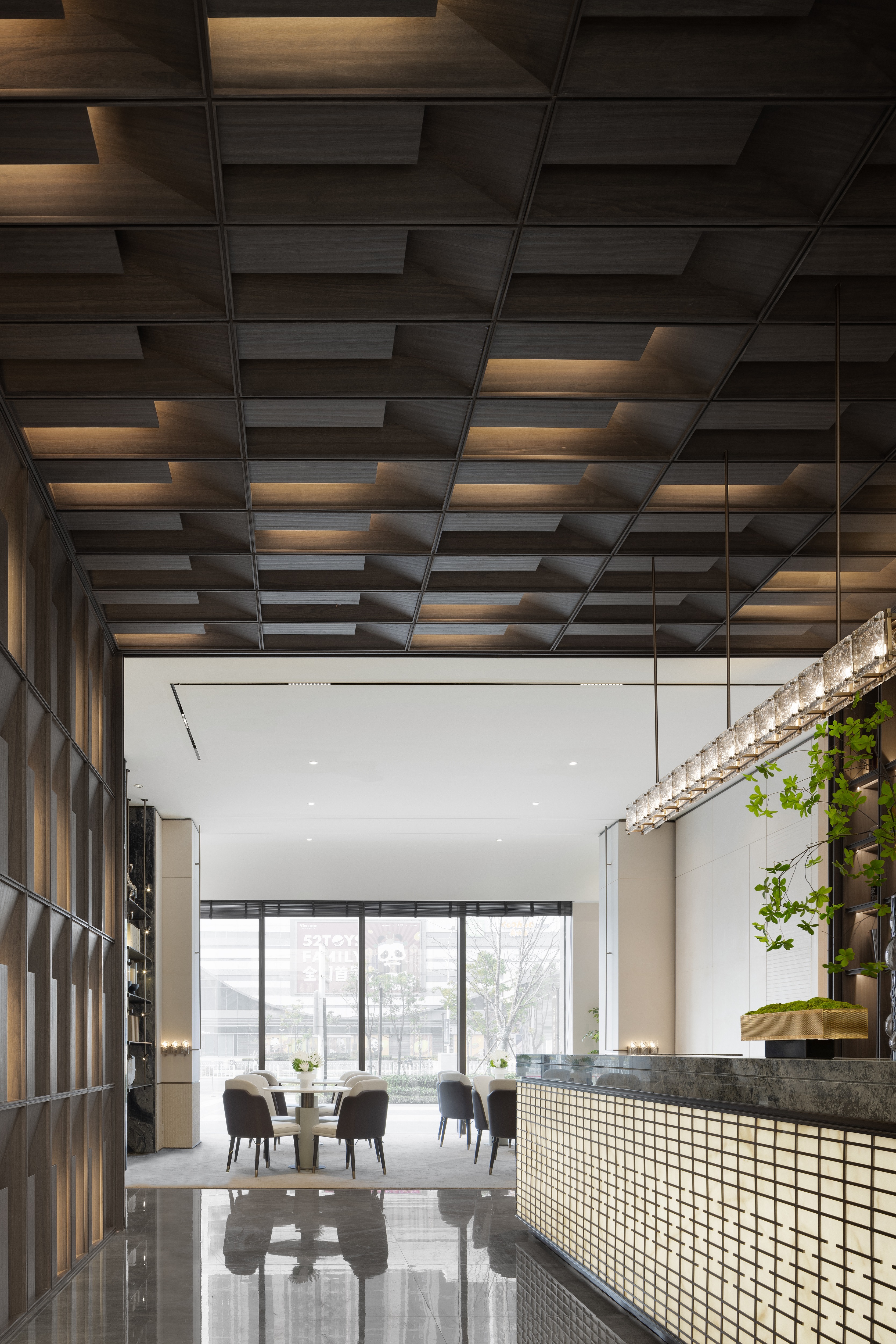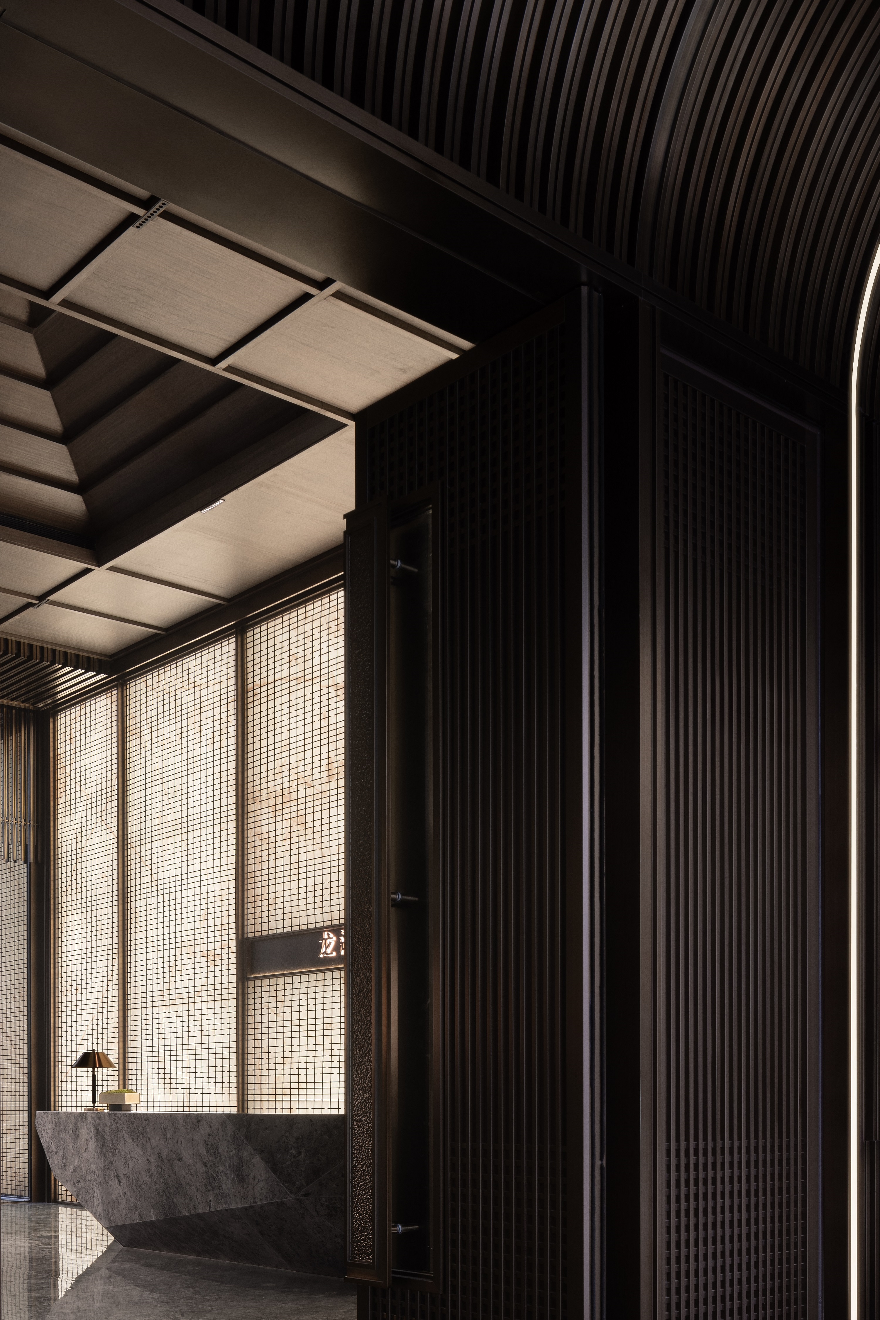 空间的顶、墙面采用深色木饰面,精致打磨出数十个小木盒,内藏随机的灯光点缀,寓意九九归一。在比例美感的精确把握下,空间本身结构的形式美与室内细腻的装点相辅相成,展呈出空间的艺术品位与文化感染力。