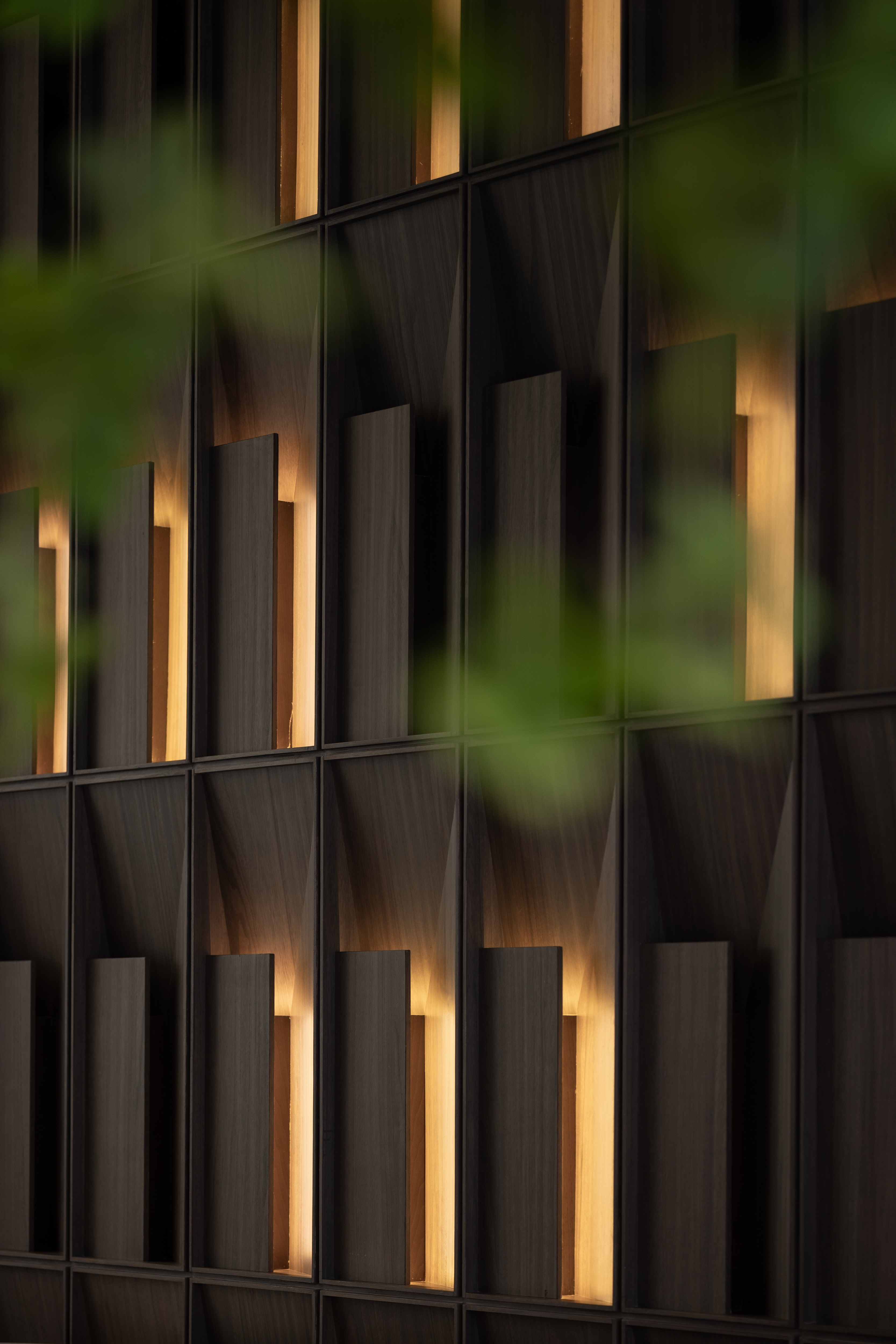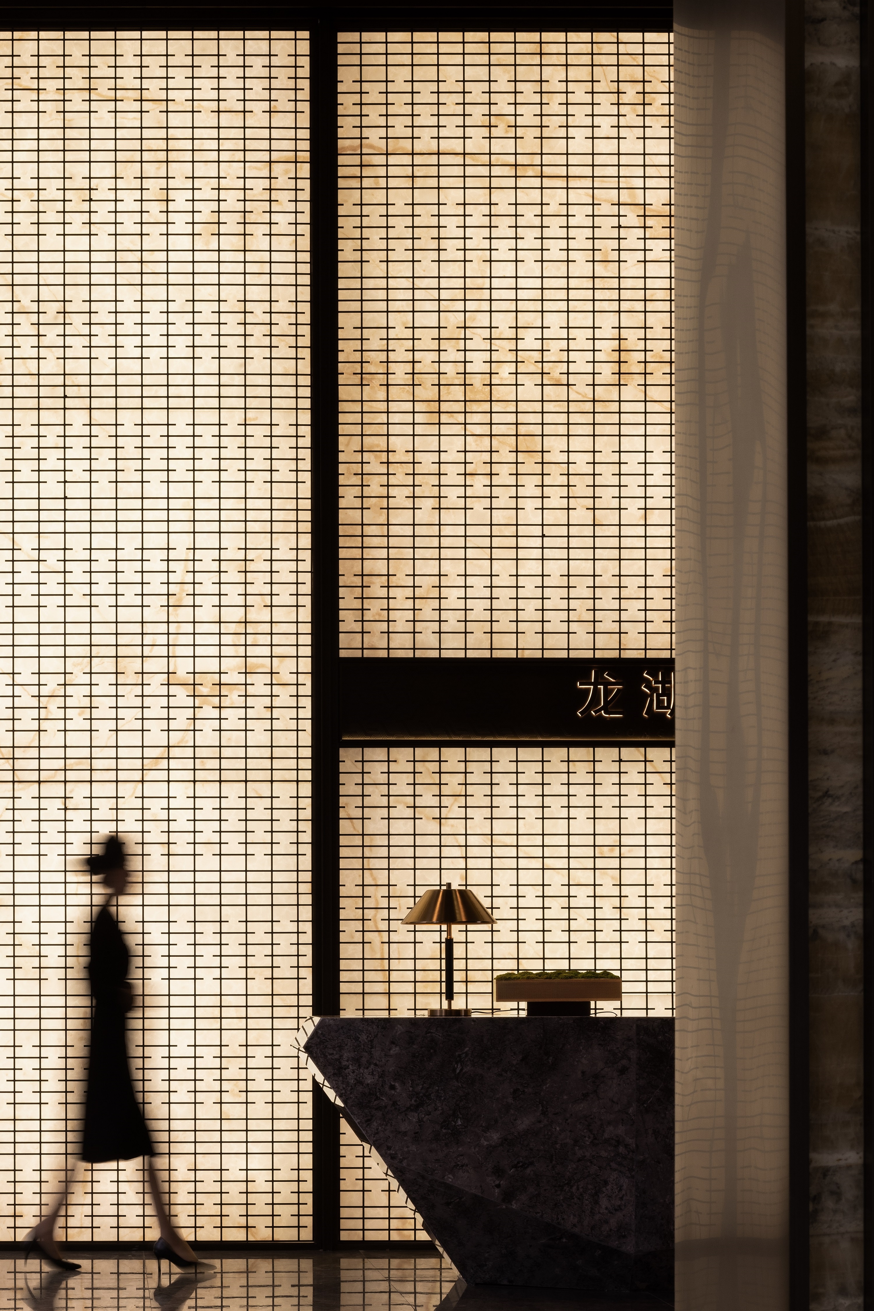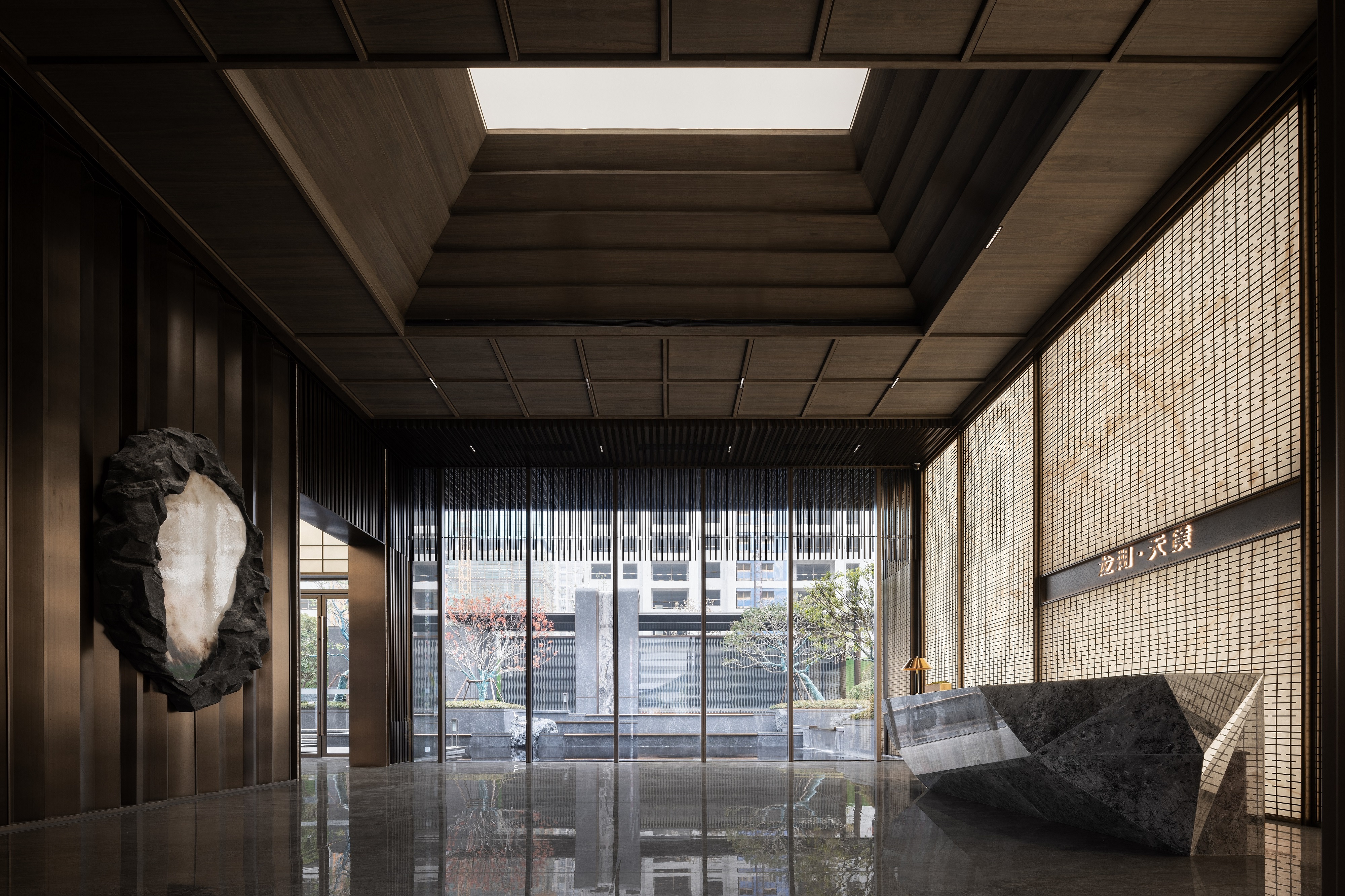 空间的顶、墙面采用深色木饰面,精致打磨出数十个小木盒,内藏随机的灯光点缀,寓意九九归一。在比例美感的精确把握下,空间本身结构的形式美与室内细腻的装点相辅相成,展呈出空间的艺术品位与文化感染力。