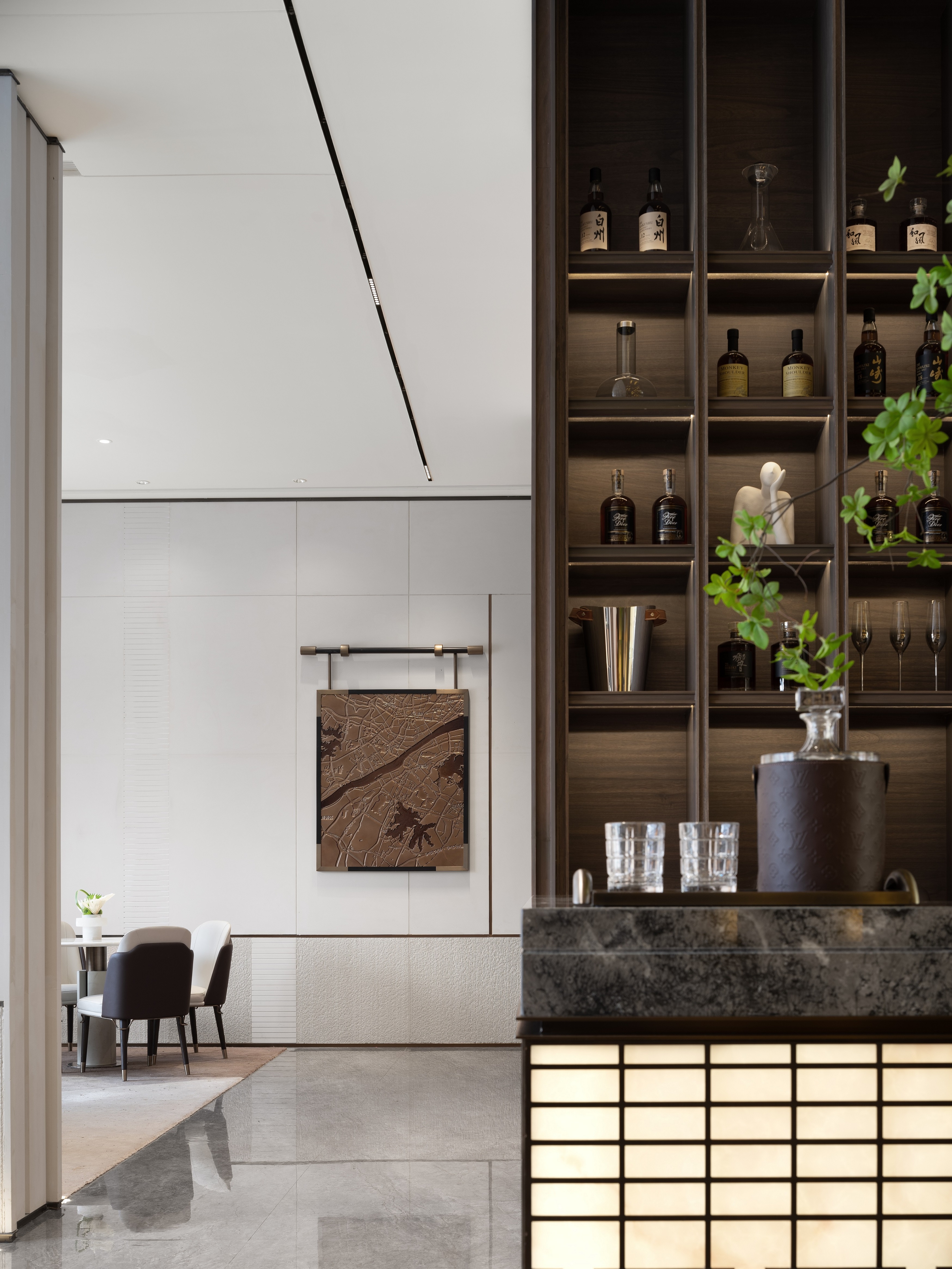 设计选材:设计摒弃浮华外表,力求还原一个与自然相辅相成的空间。水吧区空间的顶、墙面采用深色木饰面,精致打磨出数十个小木盒,内藏随机的灯光点缀,寓意九九归一。在比例美感的精确把握下,展呈出空间的艺术品位与文化感染力。洽谈区因地制宜利用建筑柱体,墙面大面使用泥客石,表面质感强烈、纹理独特。在严格校准线、面、体之余,通过细节的形态切割,打造出粗细不一的凹缝。极简的形式与纯粹的材质相互映衬,空间之间互相流通,让交流显得自由有序。
