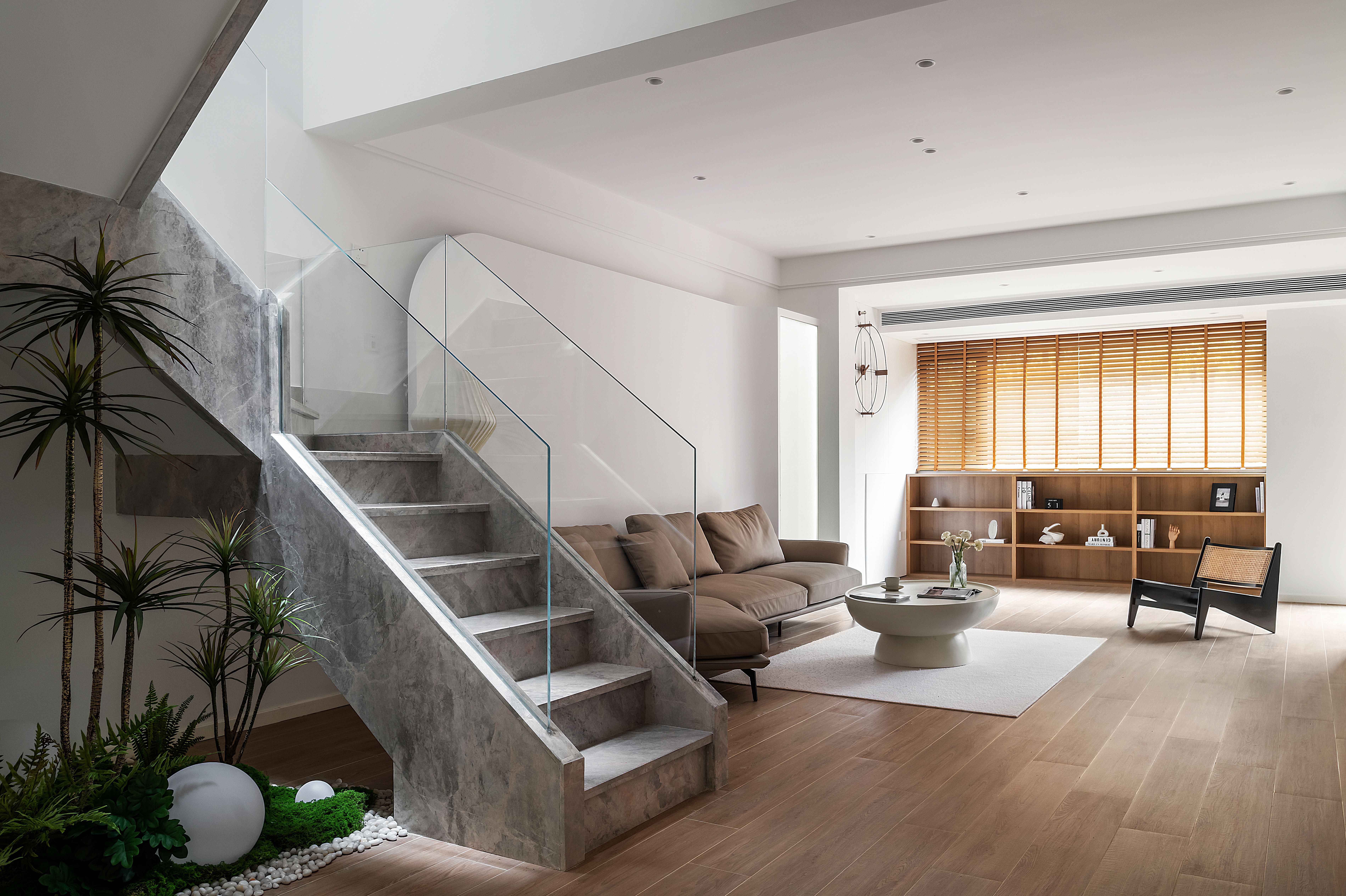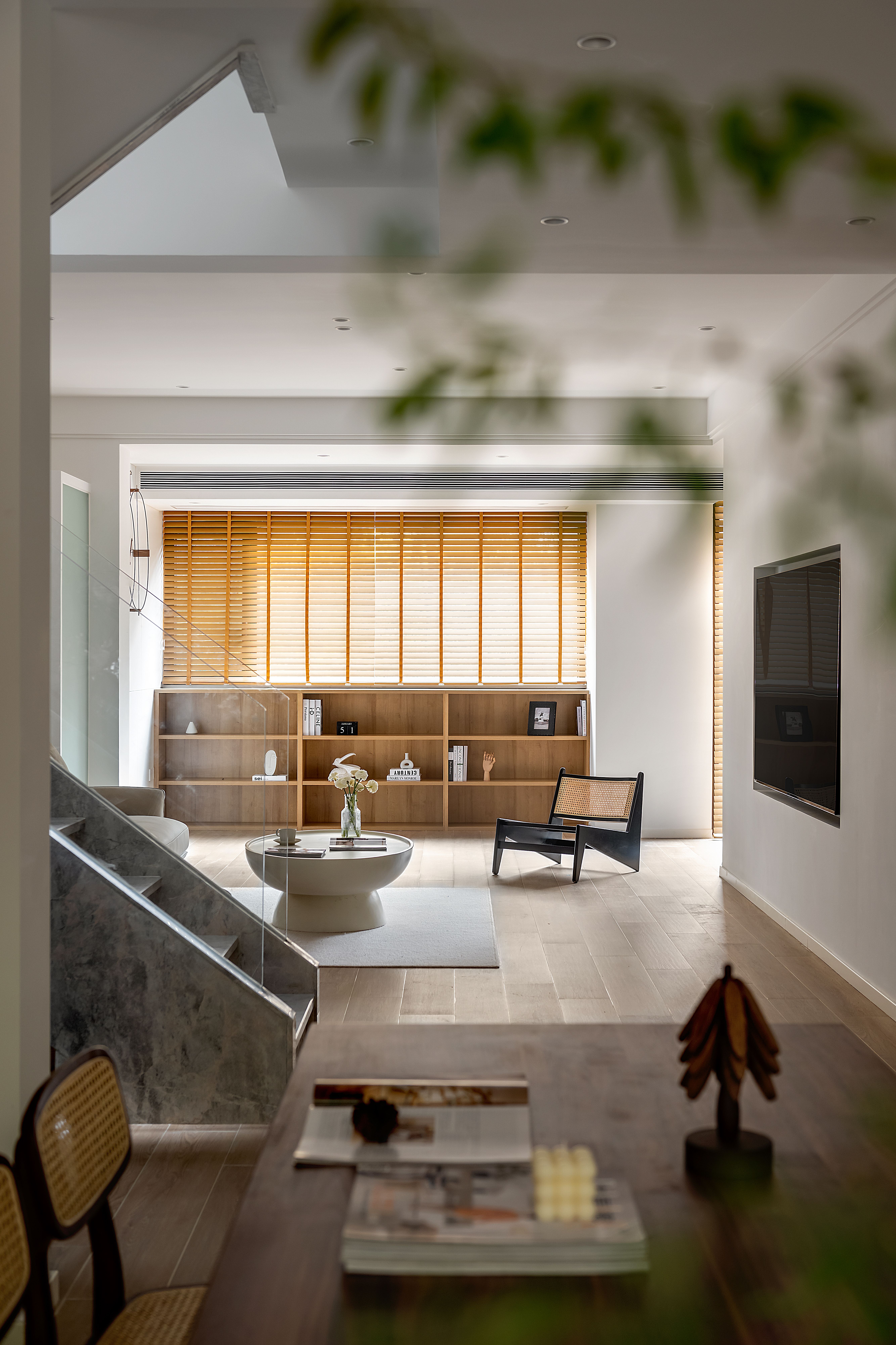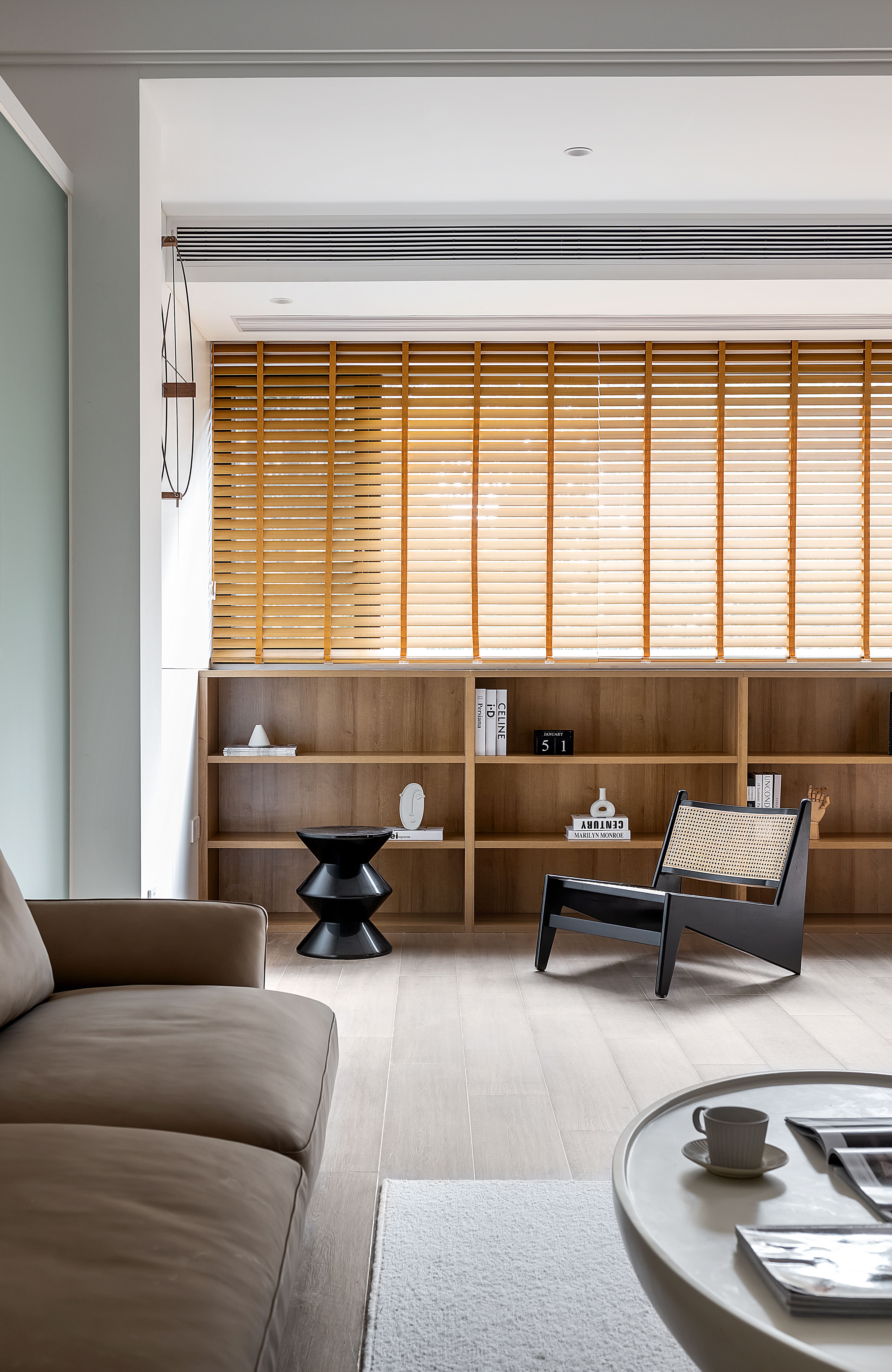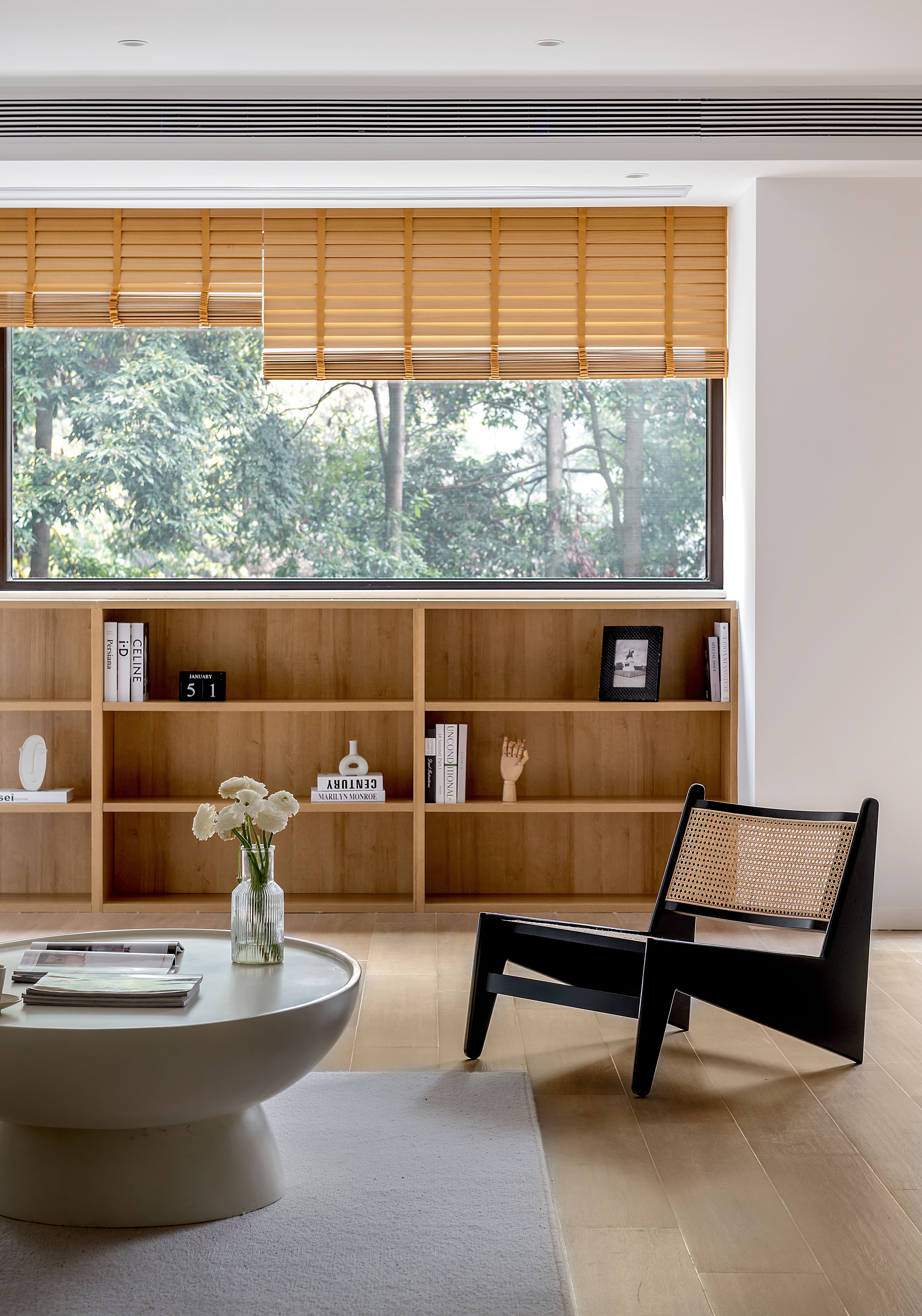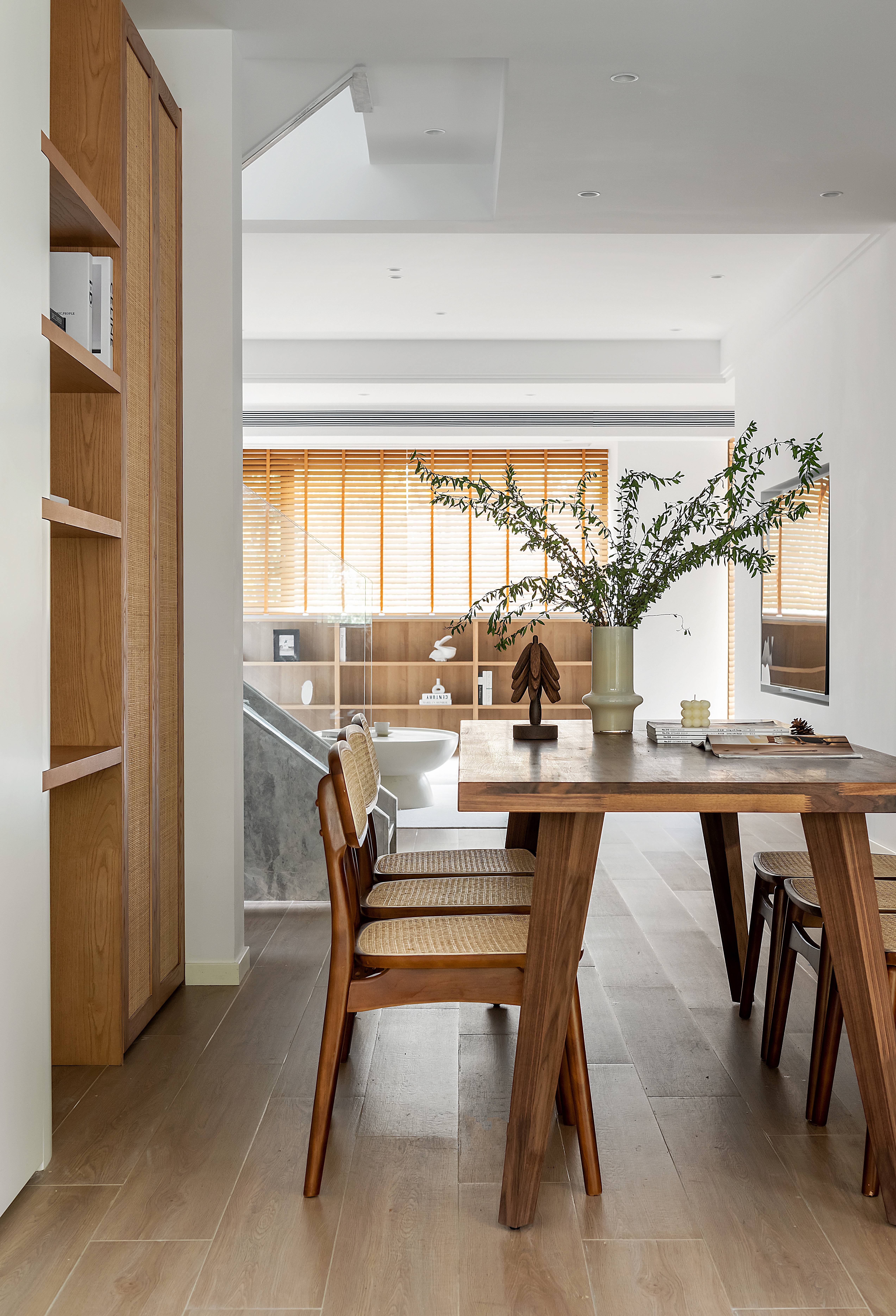 设计选材:本案的材质选择上大多以实木为主,有深色的胡桃木提升质感,也有温柔的橡木,窗帘上,公共区域则大多使用木百叶,增添光影变换,更显温柔静谧。部分玻璃材质的使用,增加通透感。
