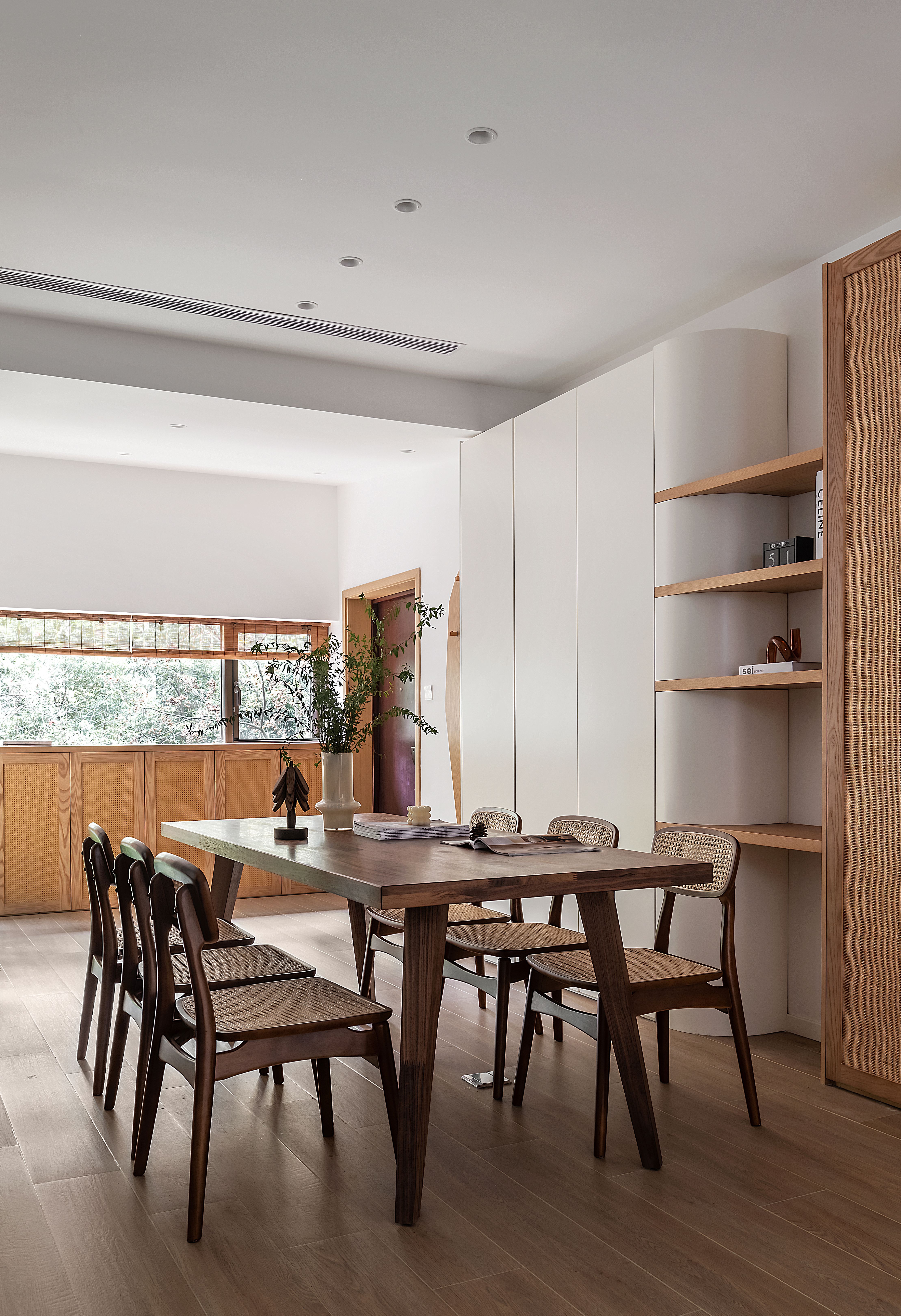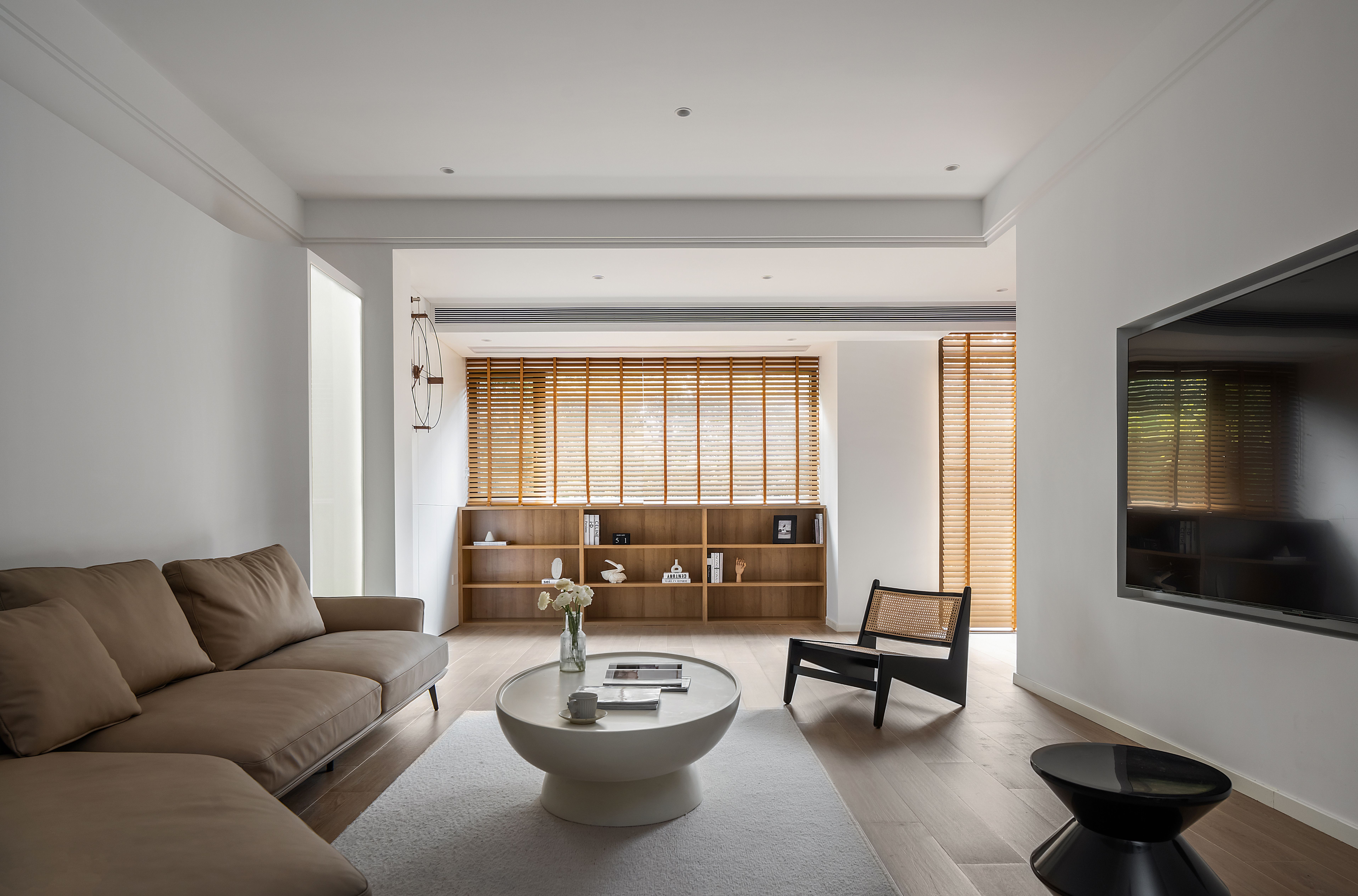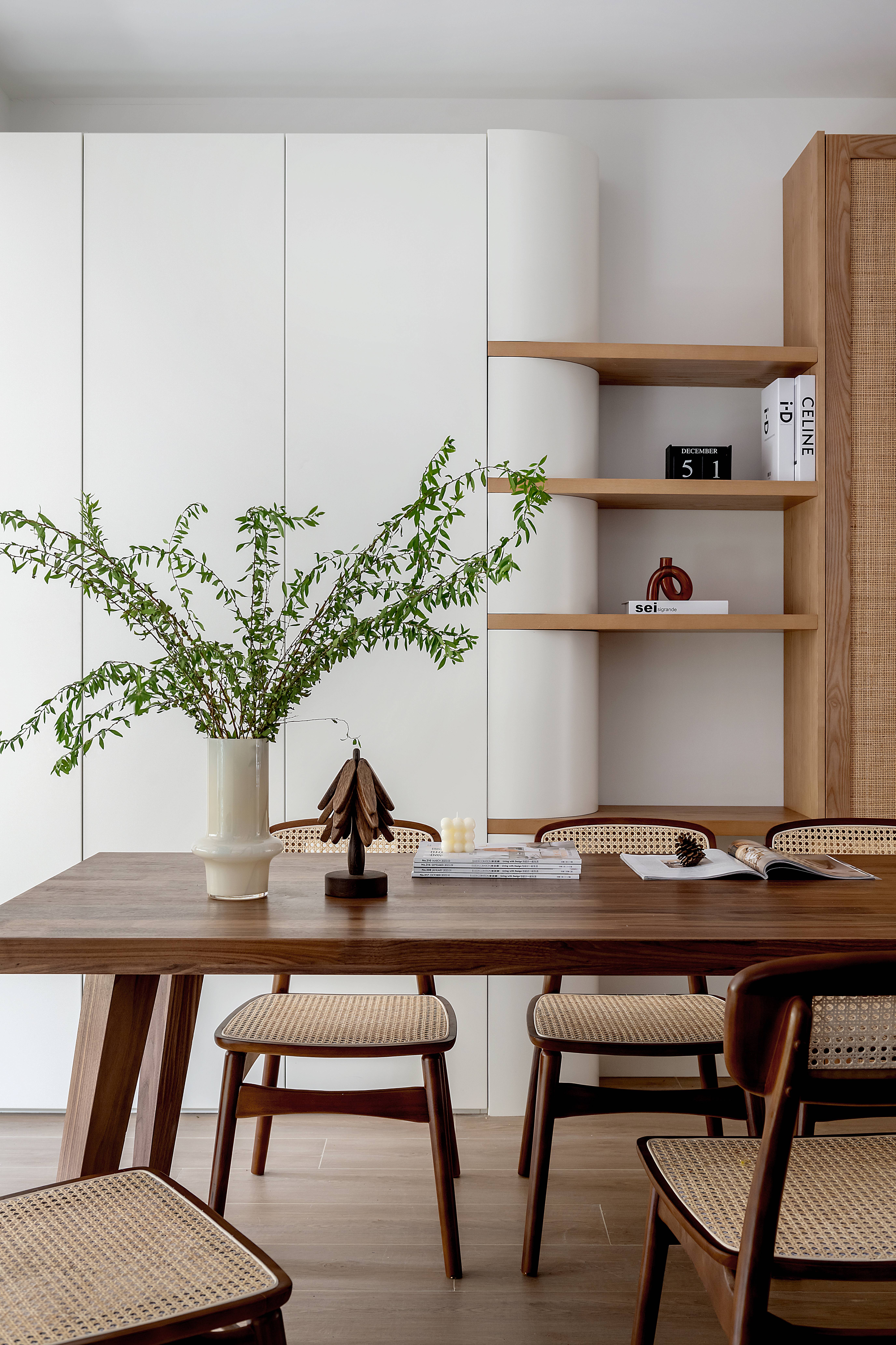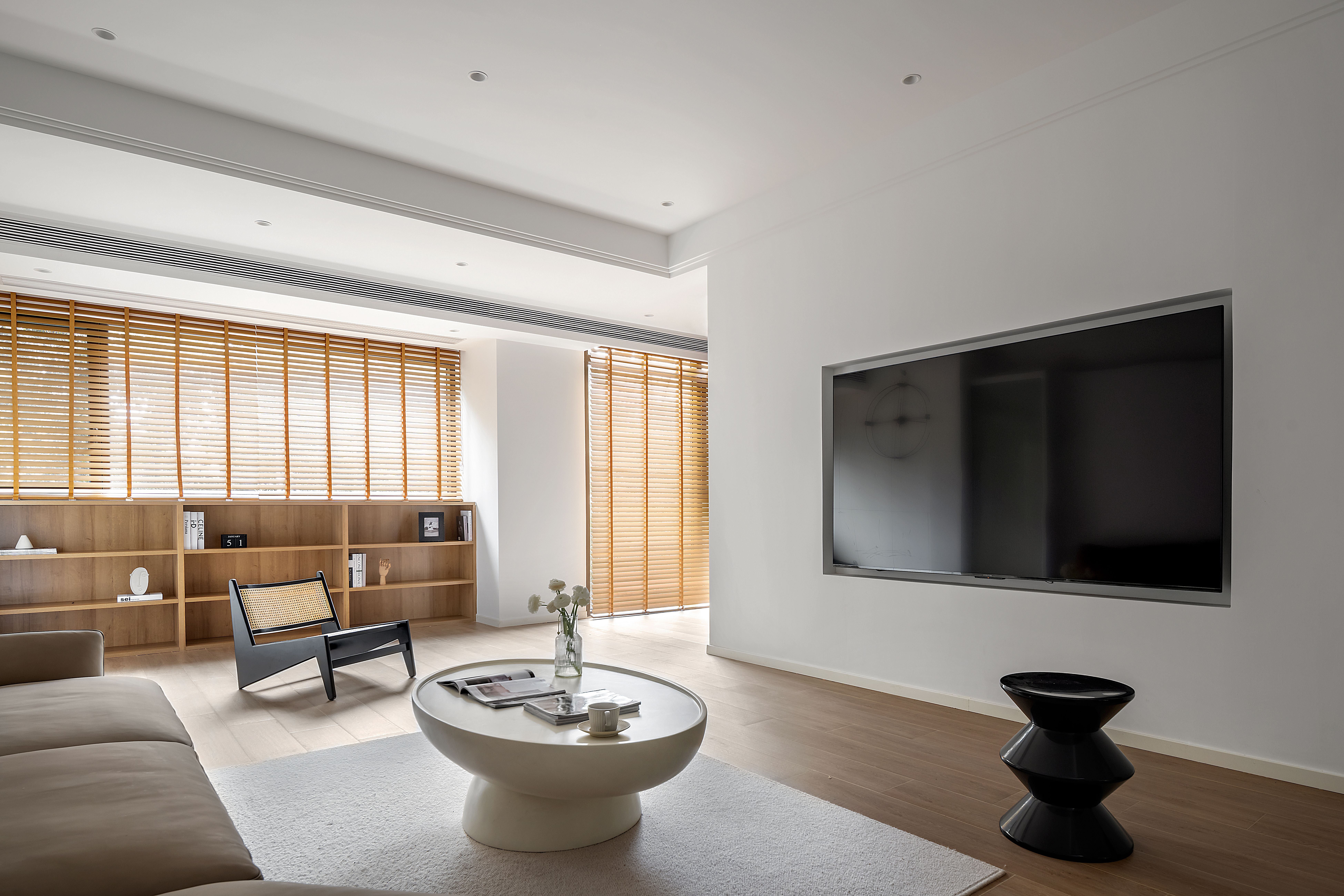 设计选材:本案的材质选择上大多以实木为主,有深色的胡桃木提升质感,也有温柔的橡木,窗帘上,公共区域则大多使用木百叶,增添光影变换,更显温柔静谧。部分玻璃材质的使用,增加通透感。