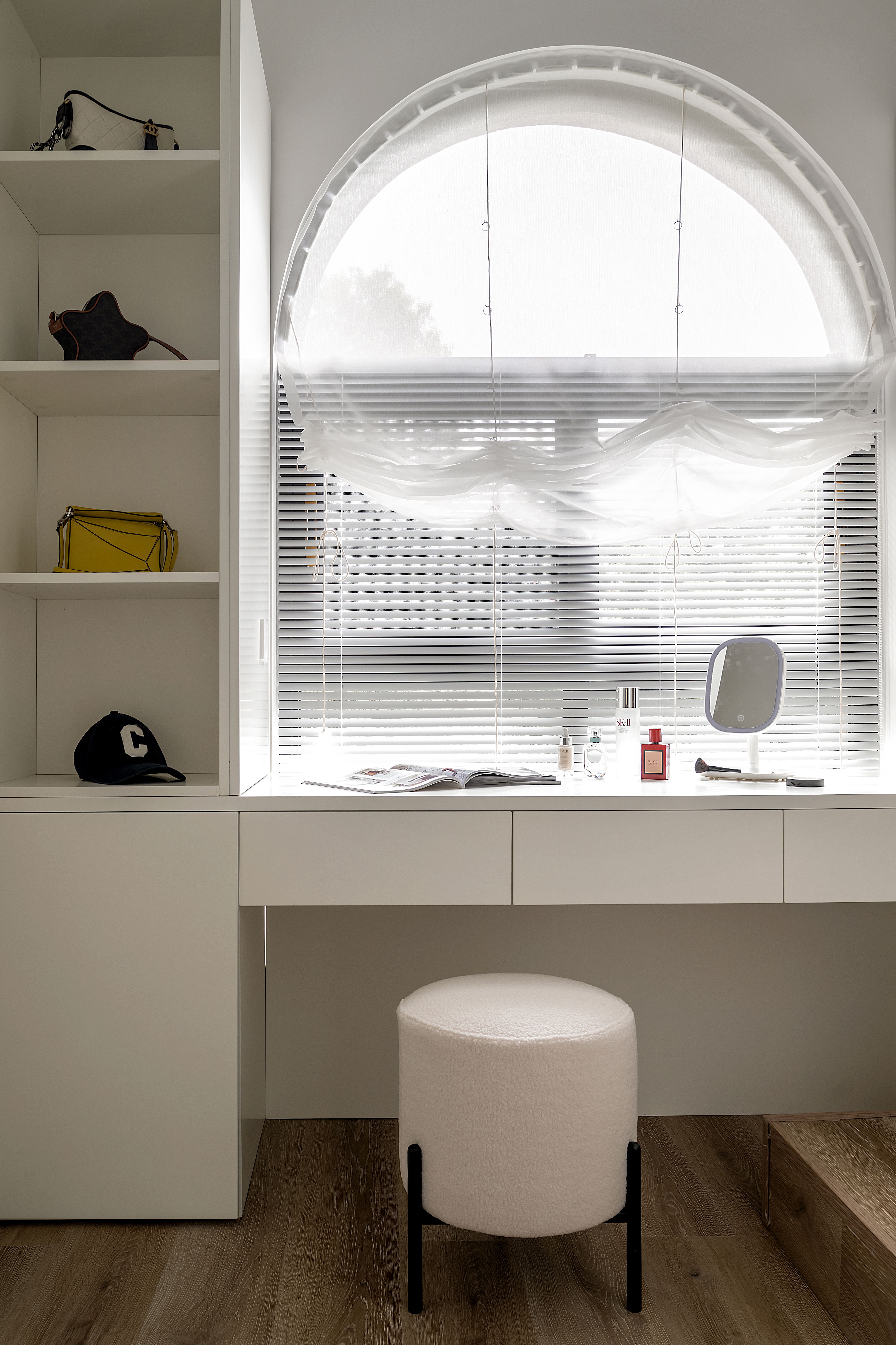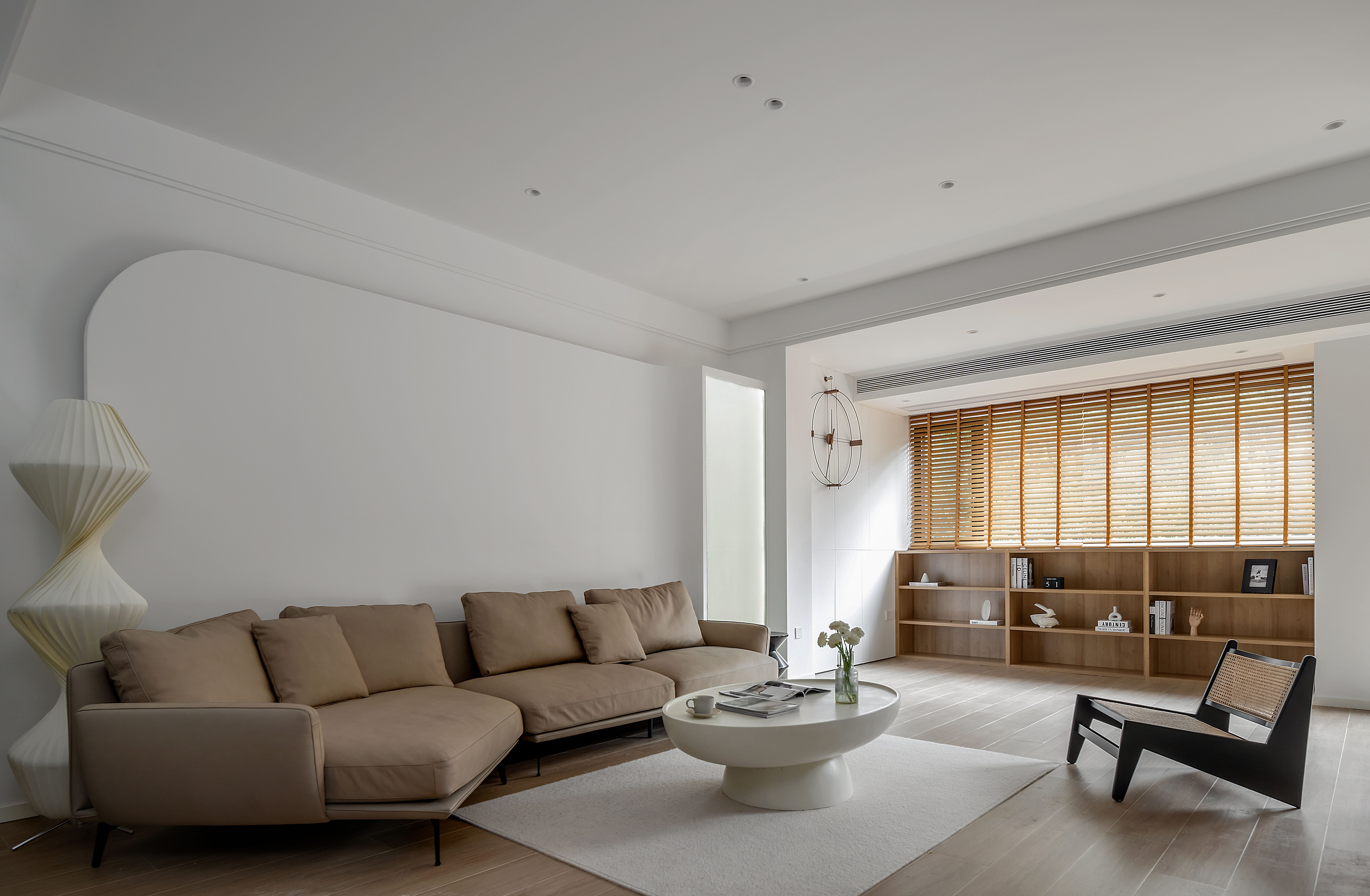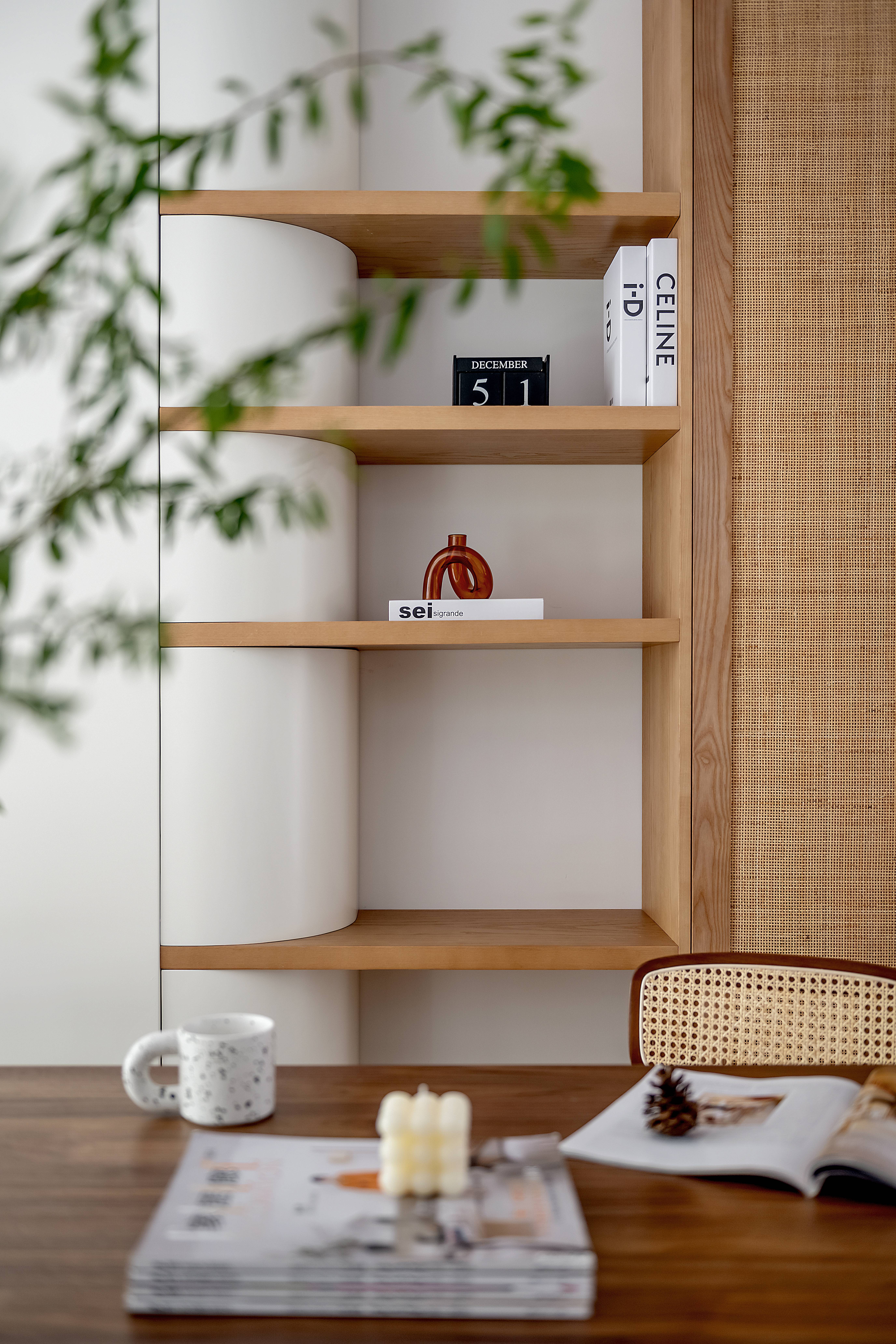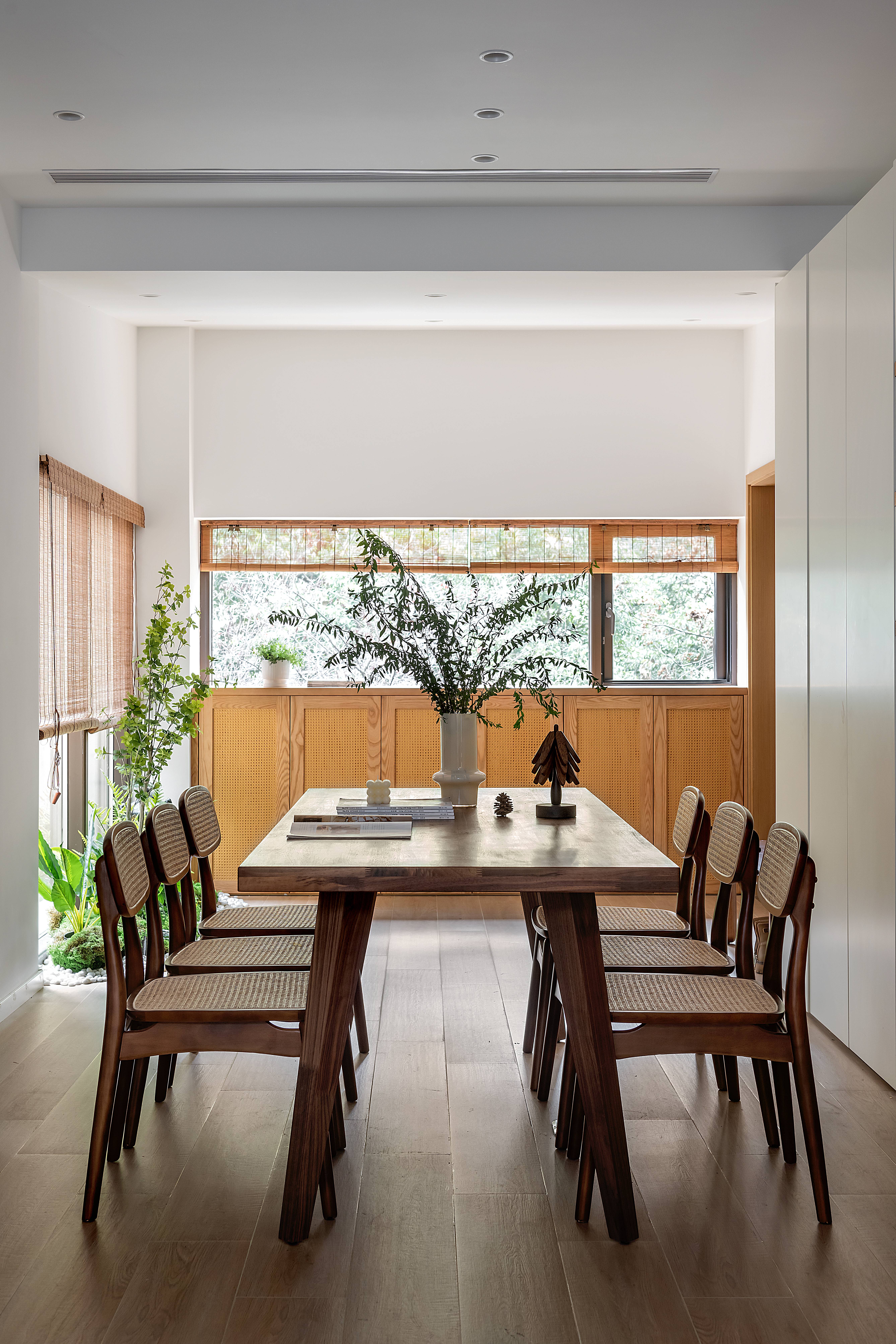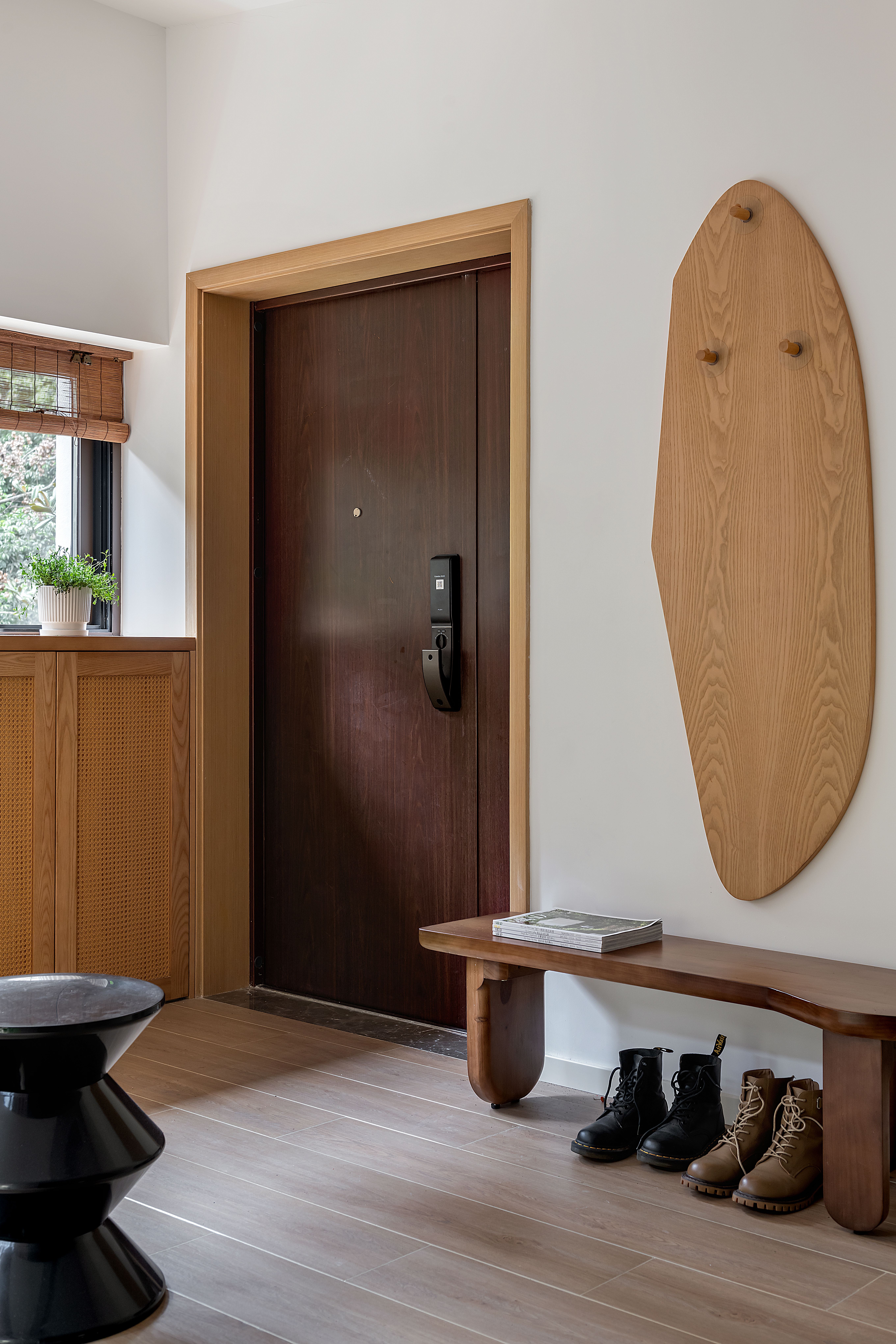 设计选材:本案的材质选择上大多以实木为主,有深色的胡桃木提升质感,也有温柔的橡木,窗帘上,公共区域则大多使用木百叶,增添光影变换,更显温柔静谧。部分玻璃材质的使用,增加通透感。
