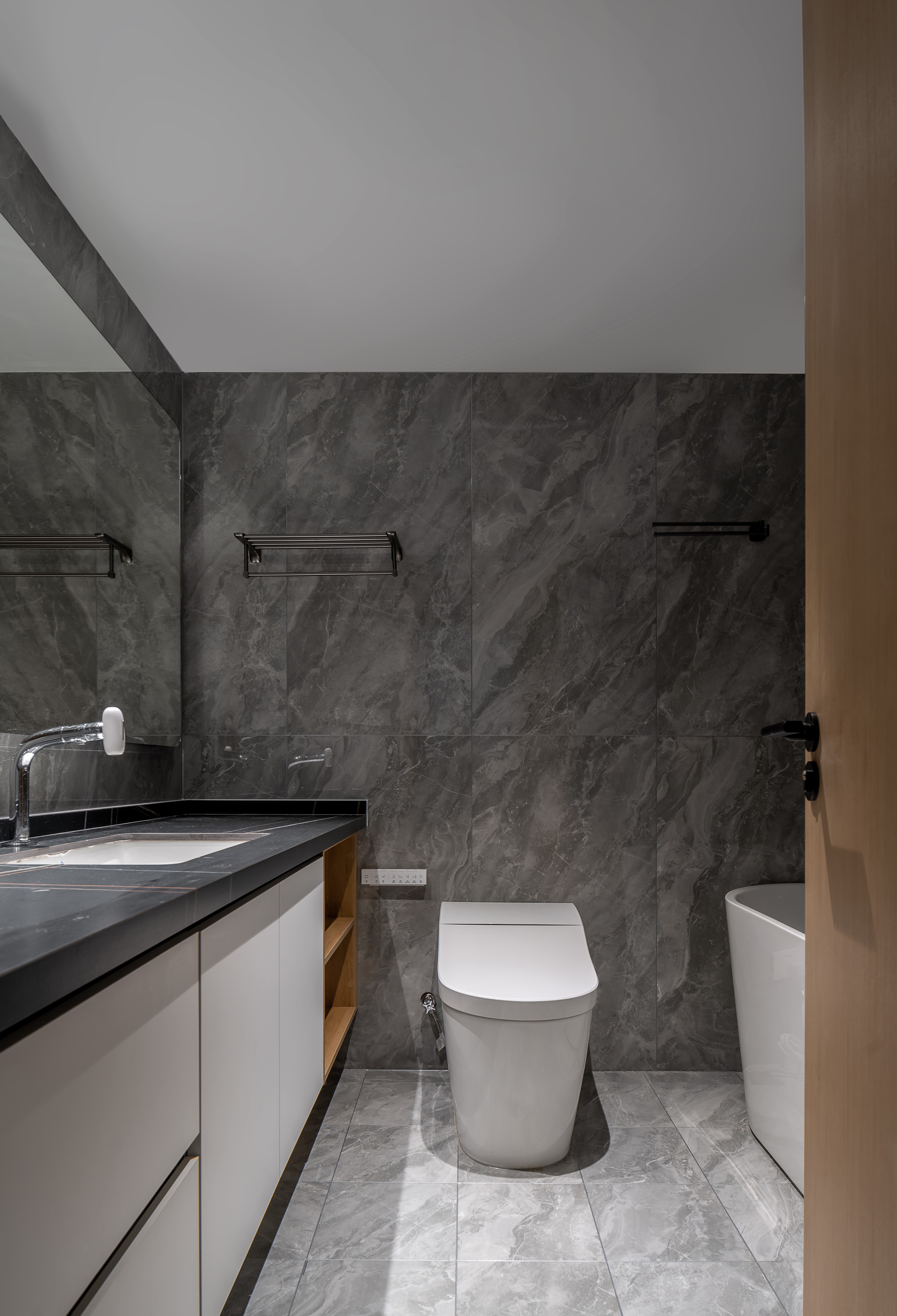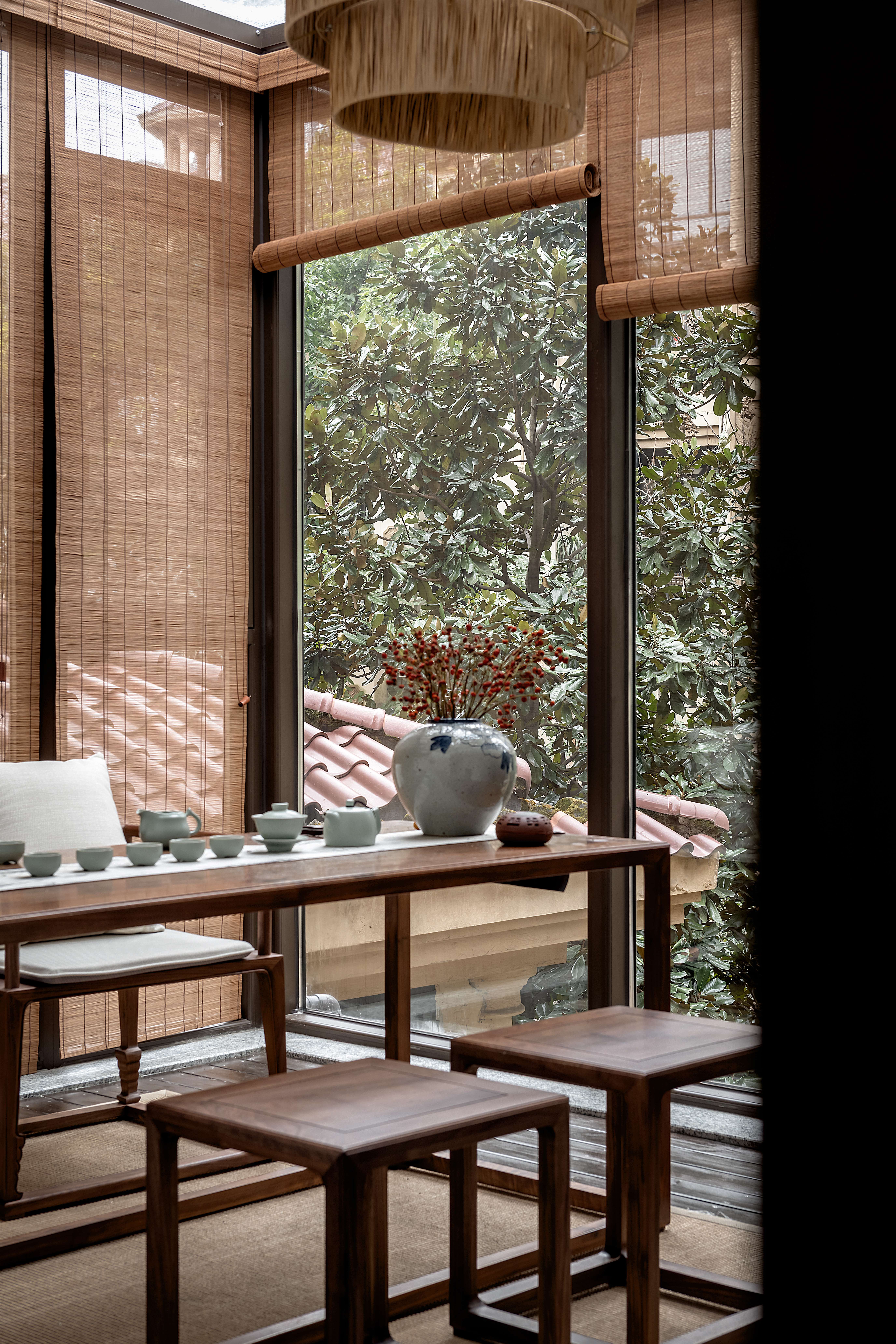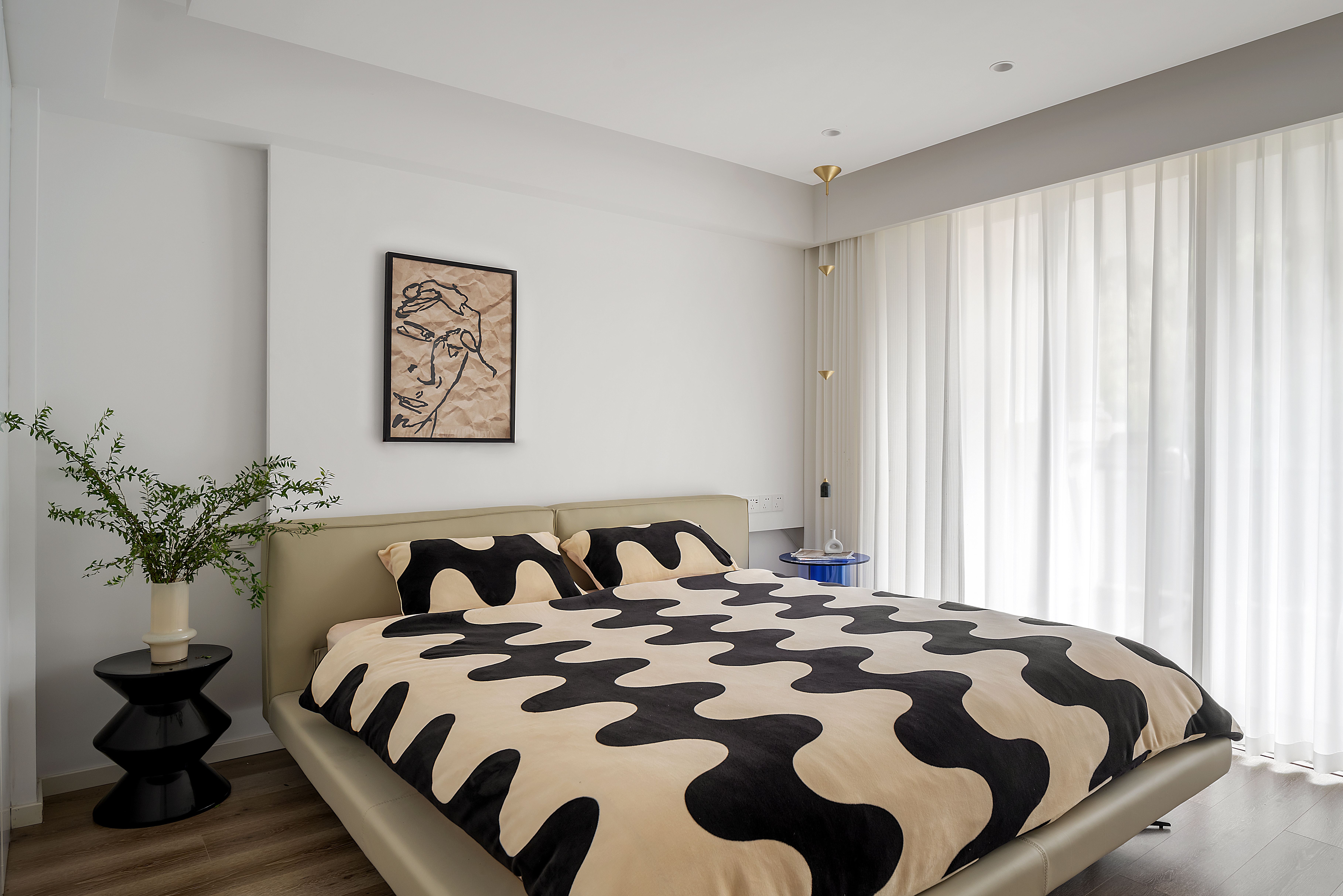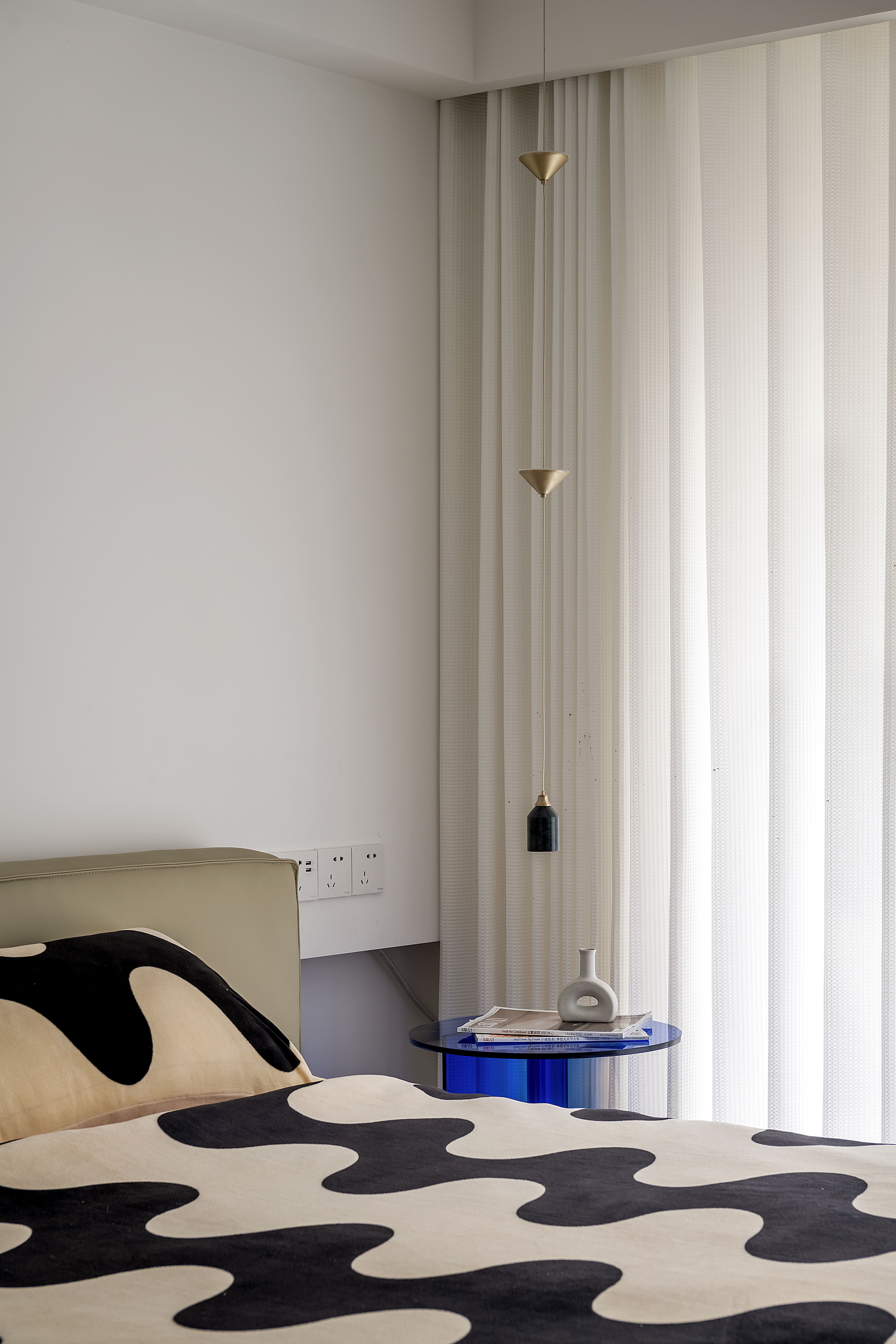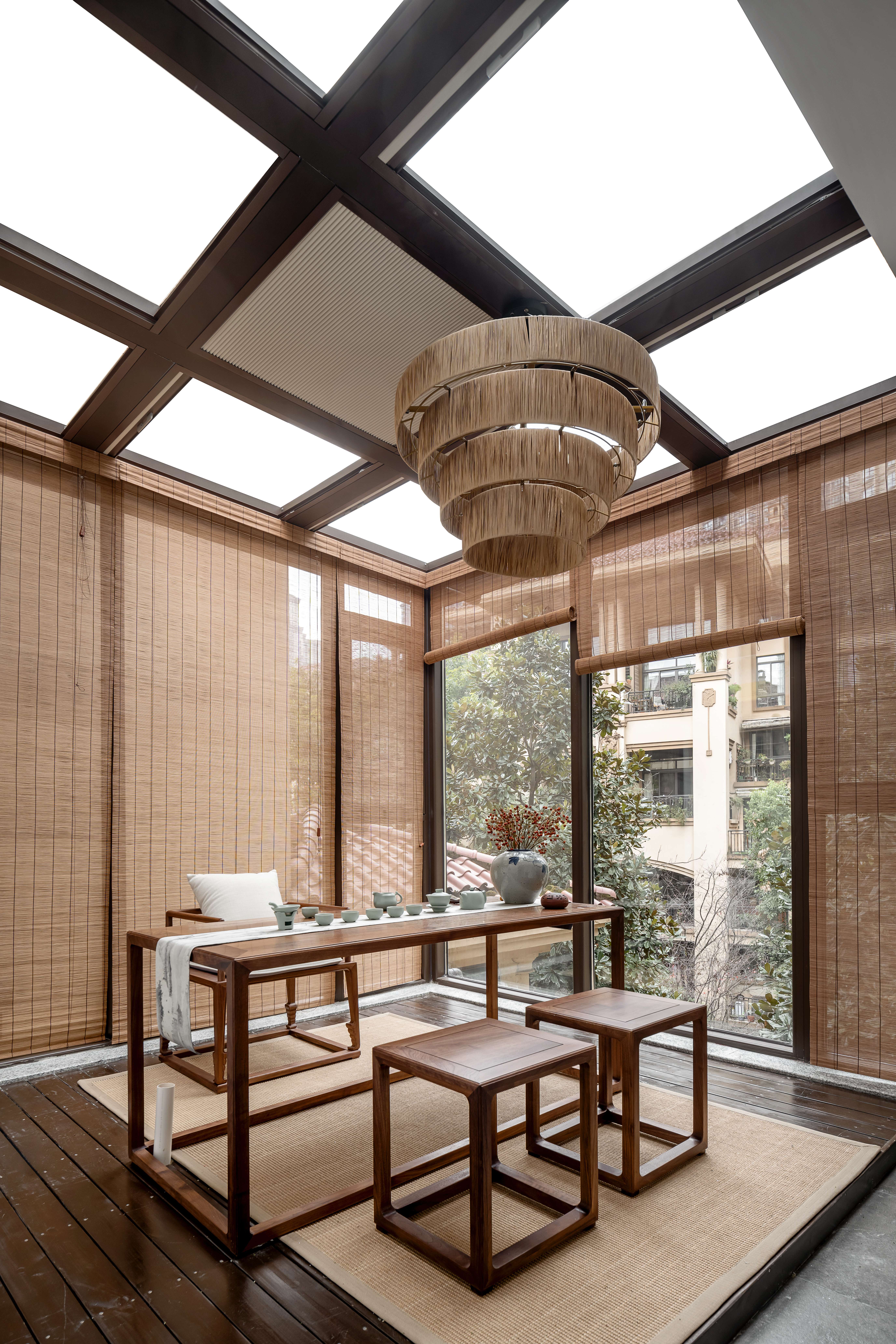 设计选材:本案的材质选择上大多以实木为主,有深色的胡桃木提升质感,也有温柔的橡木,窗帘上,公共区域则大多使用木百叶,增添光影变换,更显温柔静谧。部分玻璃材质的使用,增加通透感。