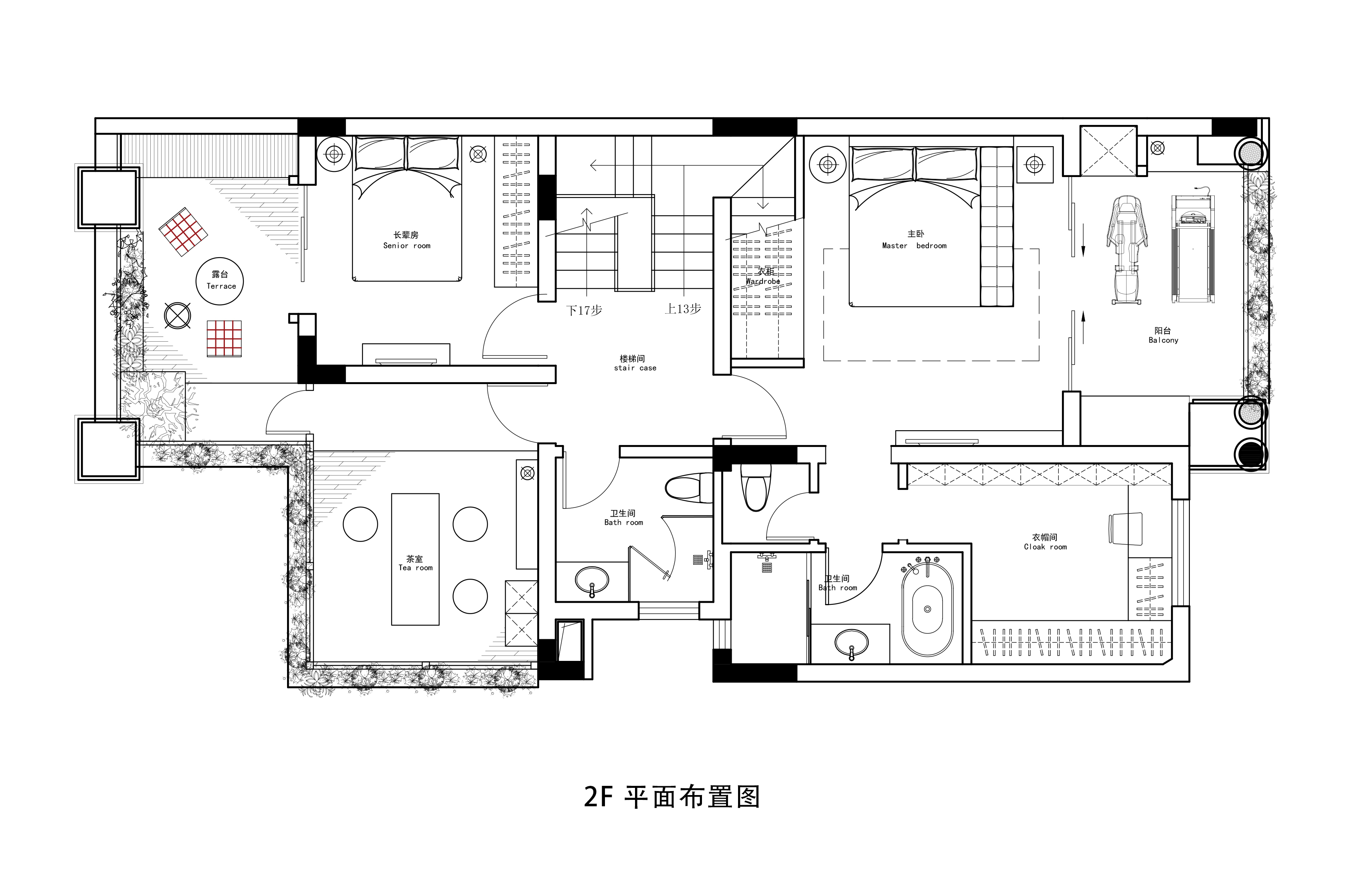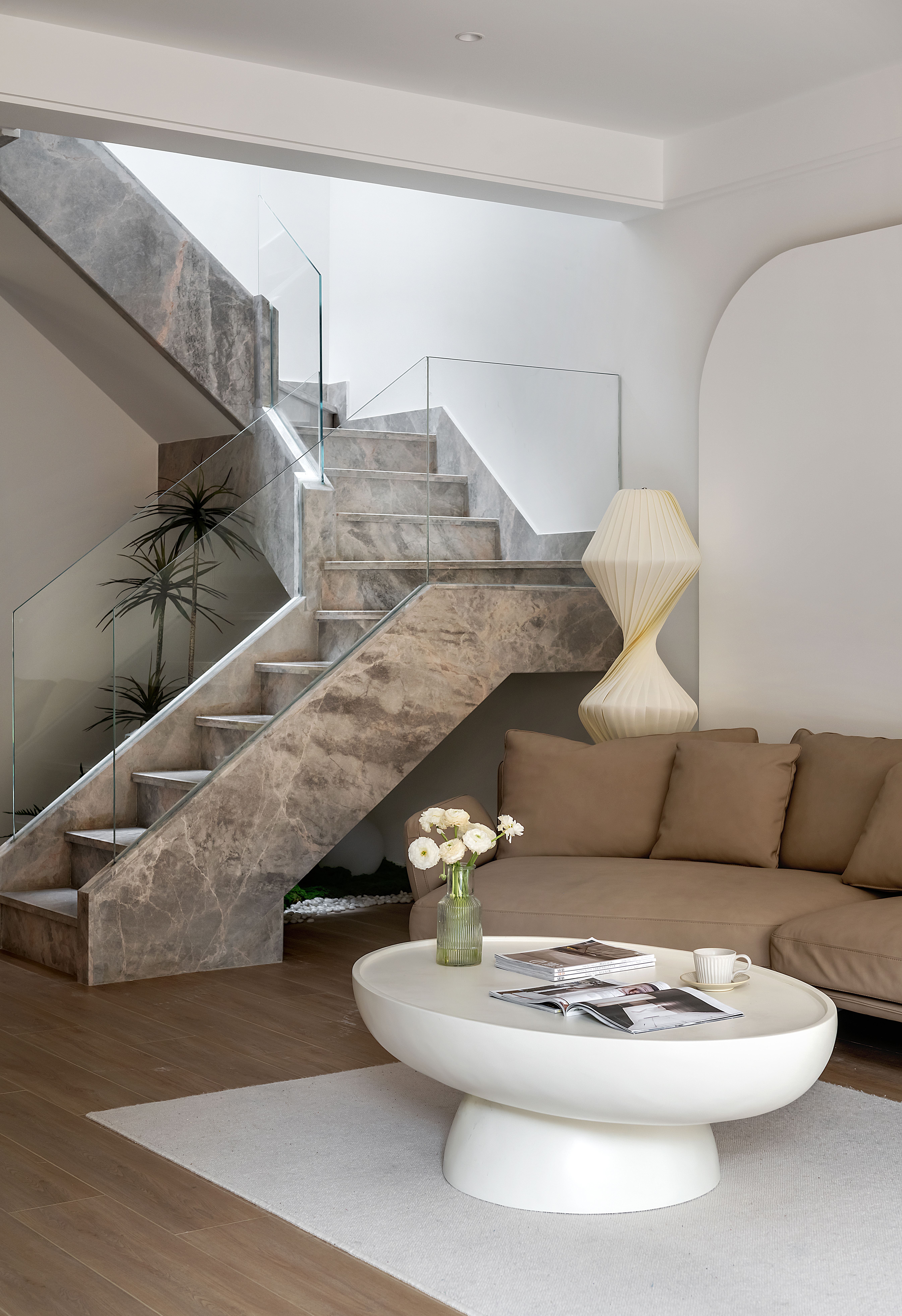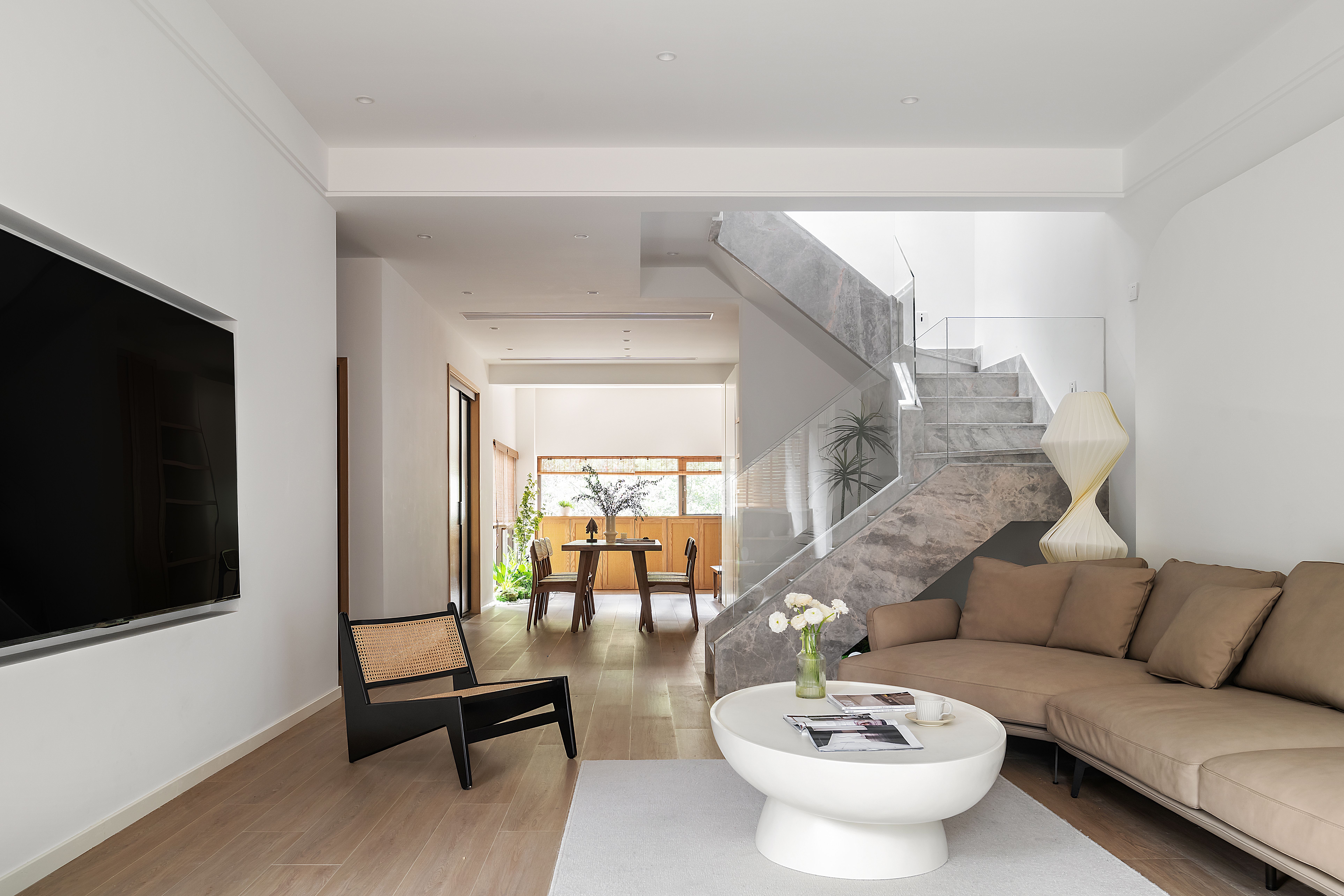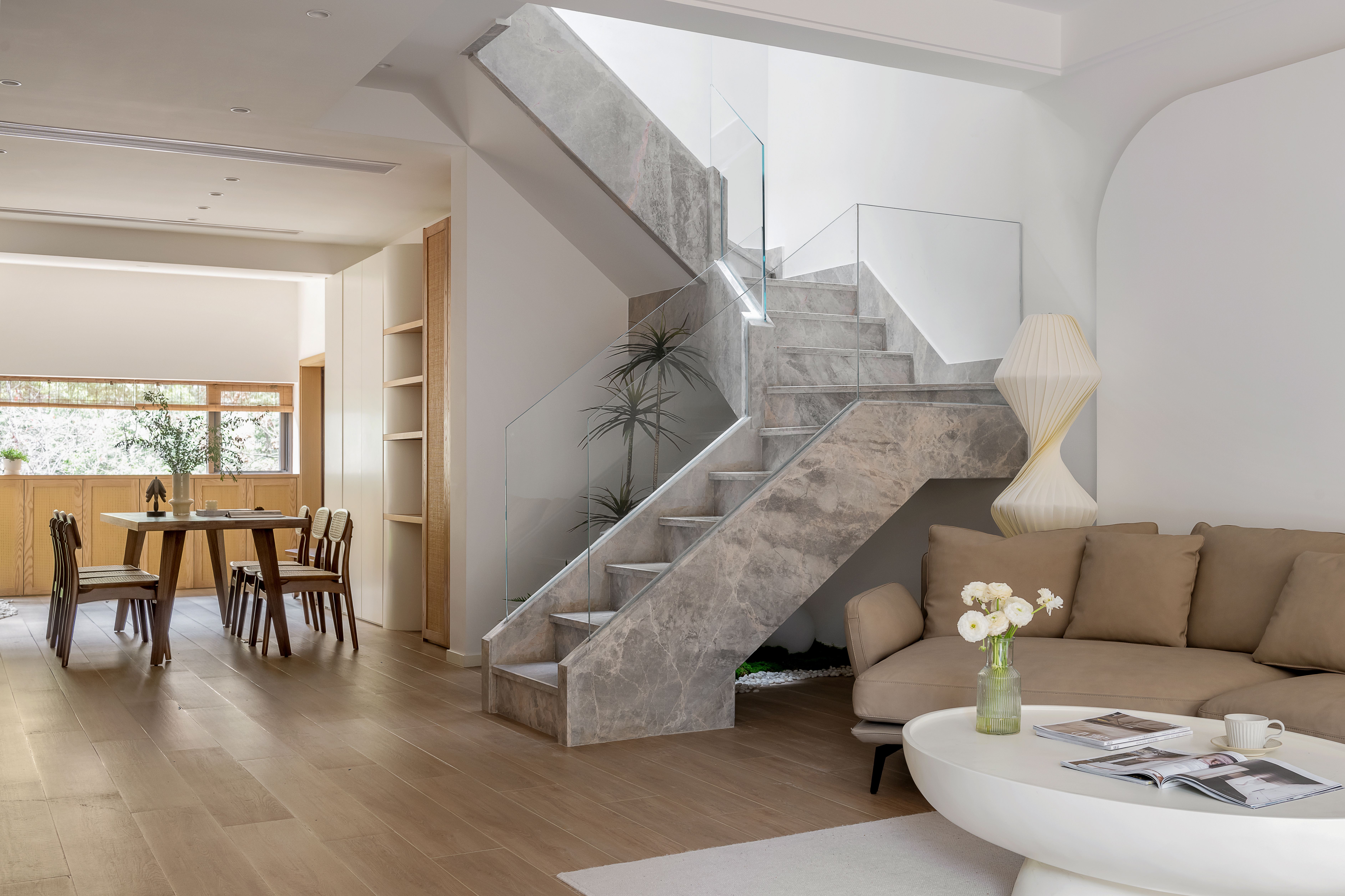 空间布局:户型改造上,扩大了一楼客餐厅的使用空间,自入户开始,整个空间通透宽敞,动线流畅方便。二楼与三楼的改造,让卧室的舒适度提升,且大大的增加了储物空间,也增添了单独的茶室区域。