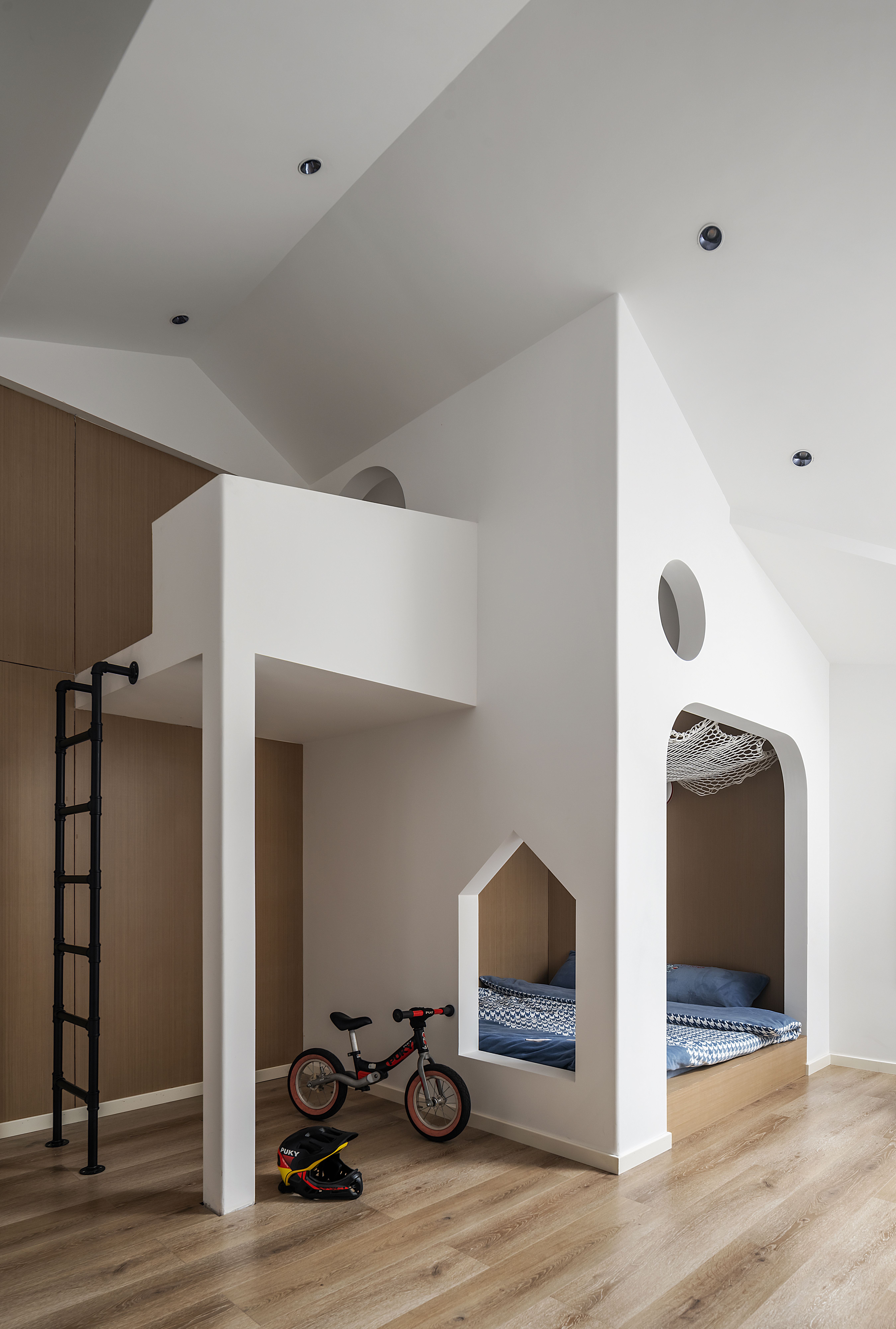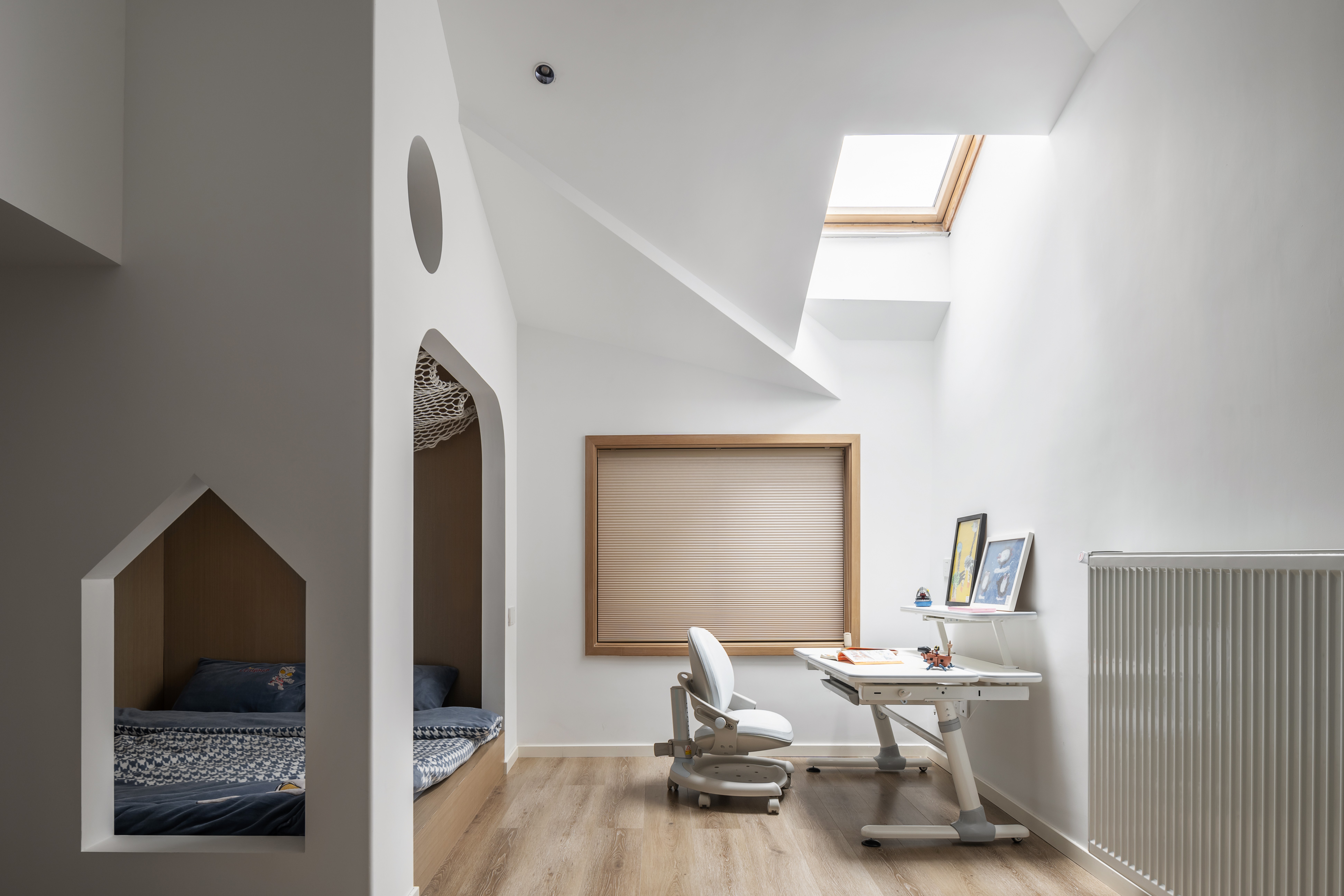 项目定位:本案的房屋是一个二手房,主要居住者为一家三口,偶尔有长辈居住,因此根据房屋四周环境的清幽宁静,打造出一个静谧自然的居所,将原始房屋重新改造,焕然一新,也利用了阁楼顶部造型的特别,改造出了儿童房的有趣可爱。