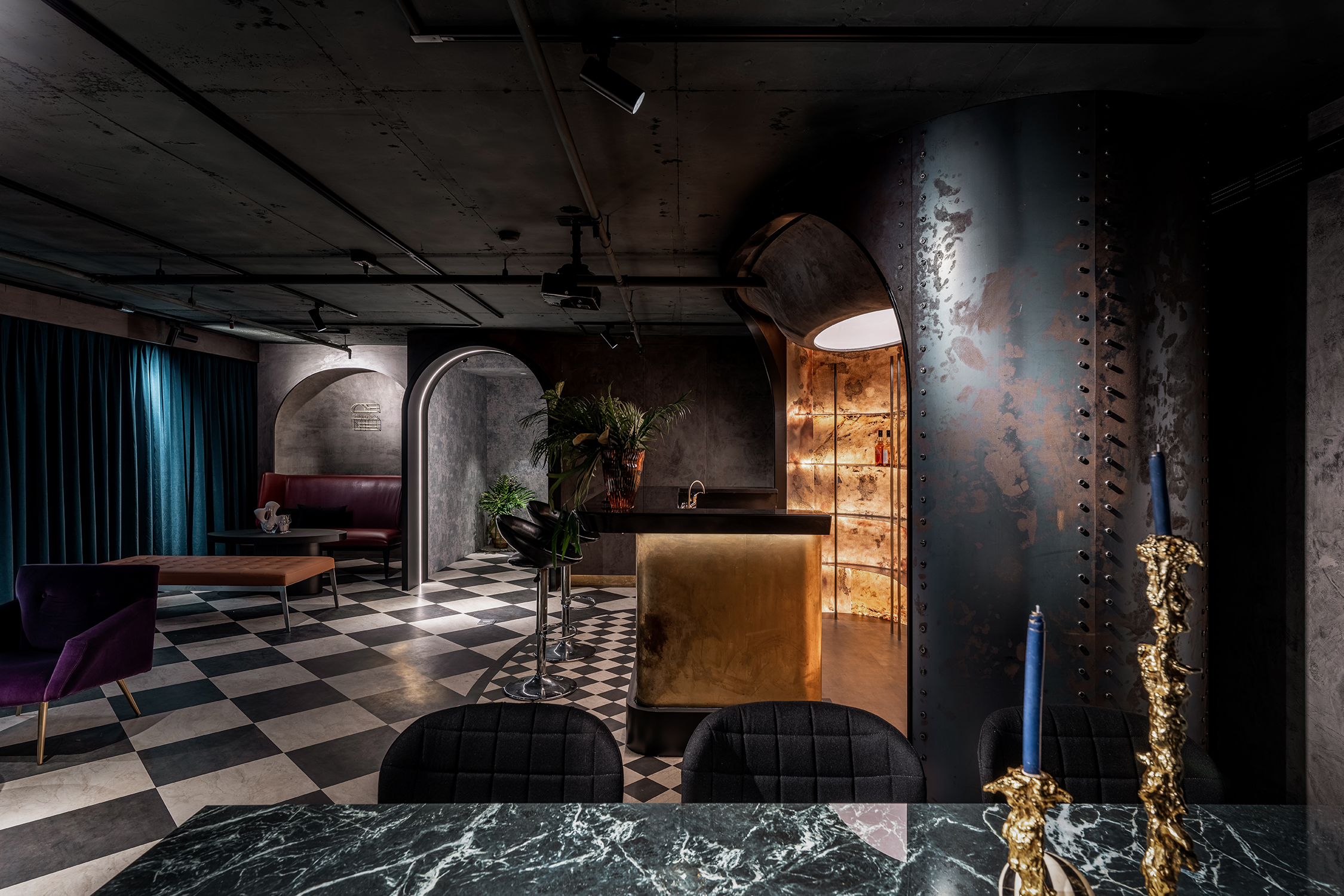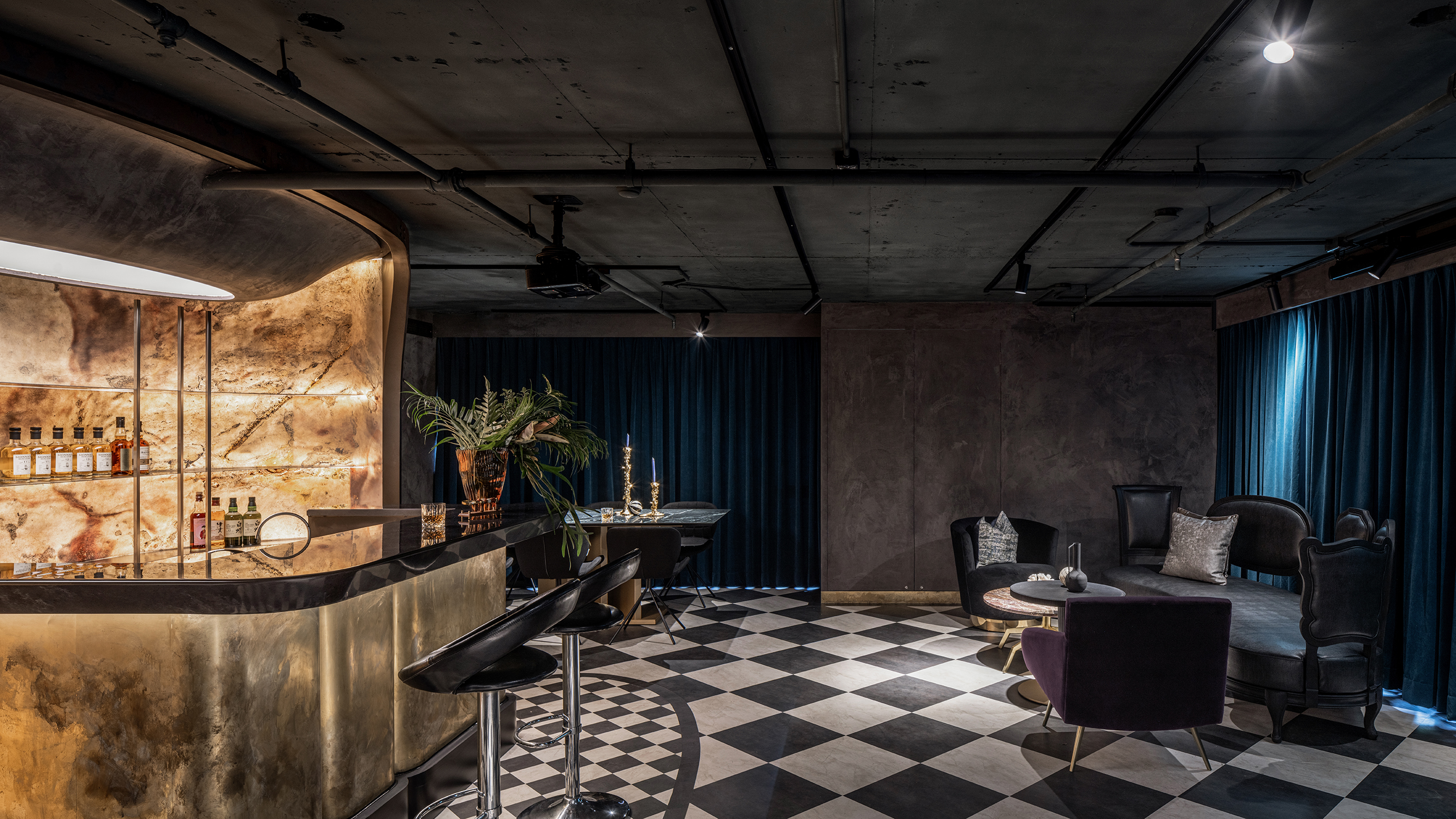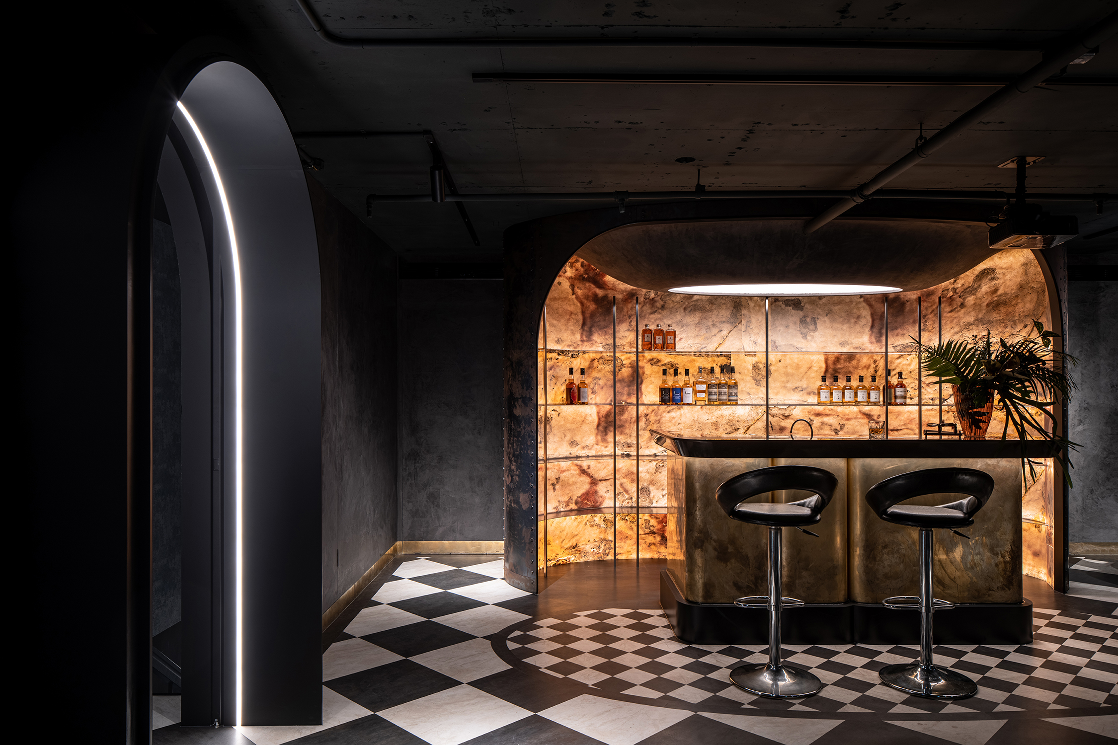 楼上,酒吧站位于布局的核心,提供了一个集中、适度的距离来服务每一位顾客。