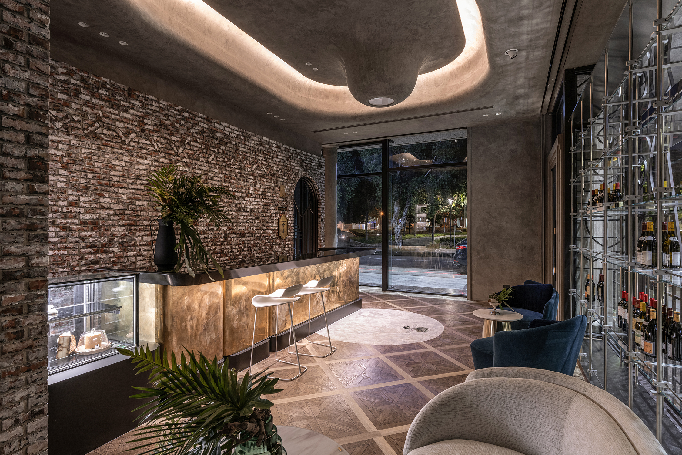 空间布局:座位布置有多种配置,以满足不同品酒人群的需求。透明的货架展示了与顾客和路人的双向互动:玻璃和抛光不锈钢的结合在内部营造出一种无忧无虑的轻盈感; 而从外立面上看到的漂浮的瓶子与立面格子图案相得益彰。此外,包含各种木种颜色的地板与青铜镶嵌相结合,营造出增强的视觉效果。