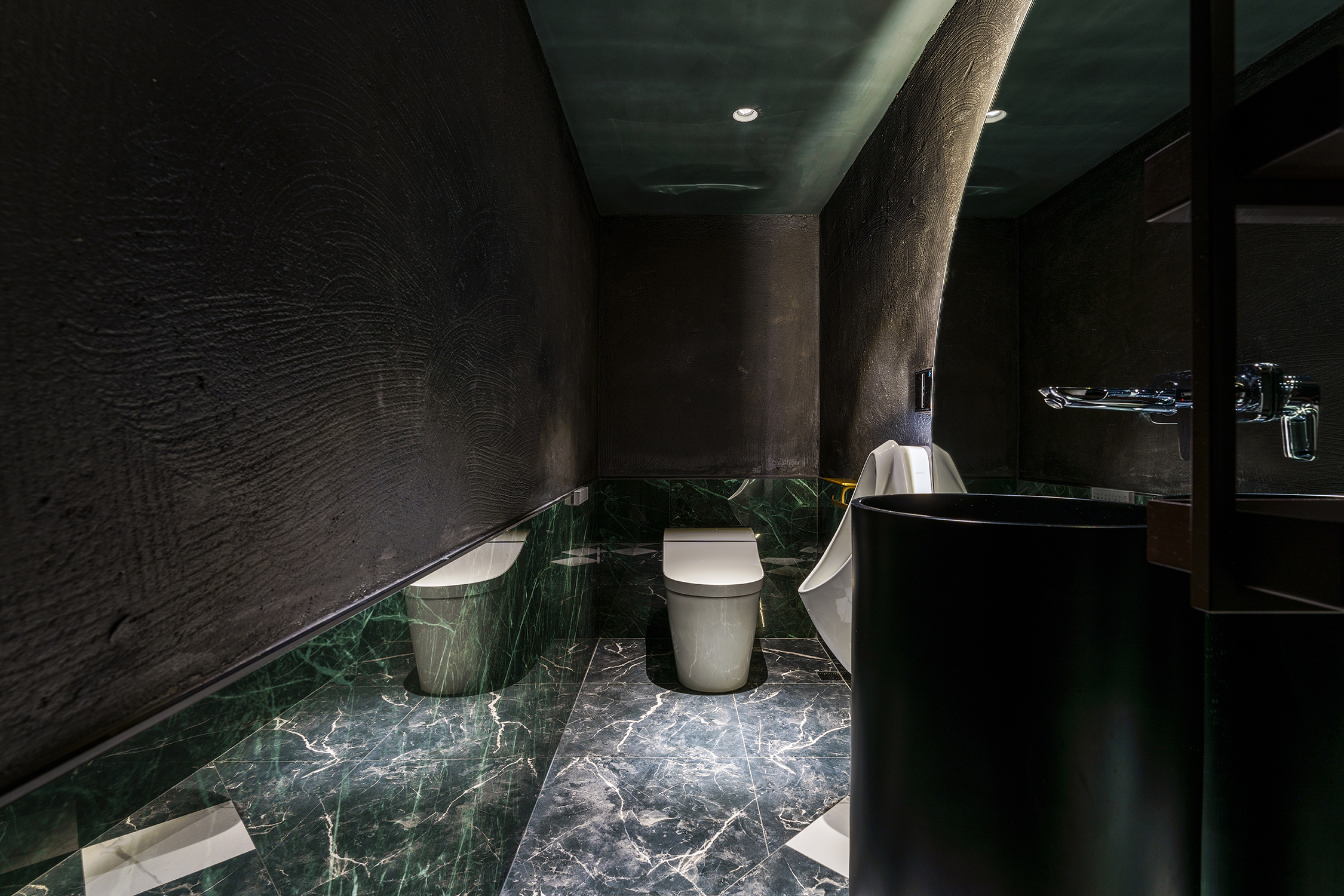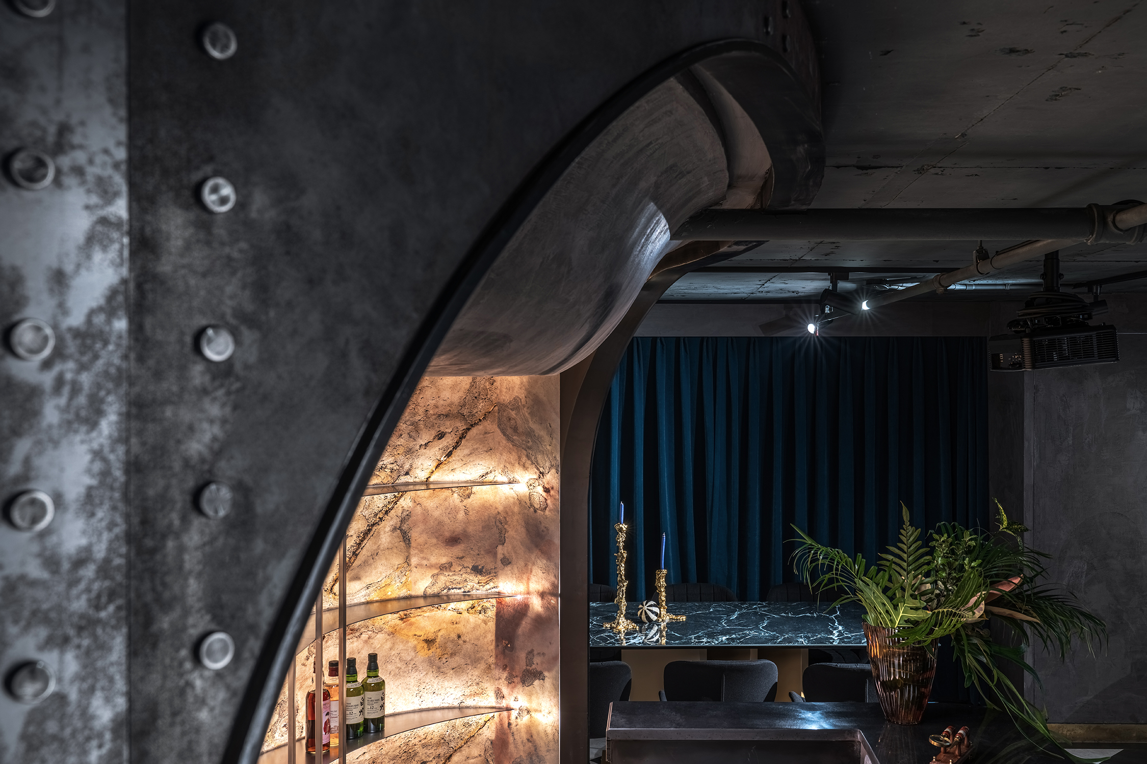 以特殊纹路涂料处理好似附着在空间中可见的湿度,天花巨型球体仿若摇晃酒杯时滴落的酒液