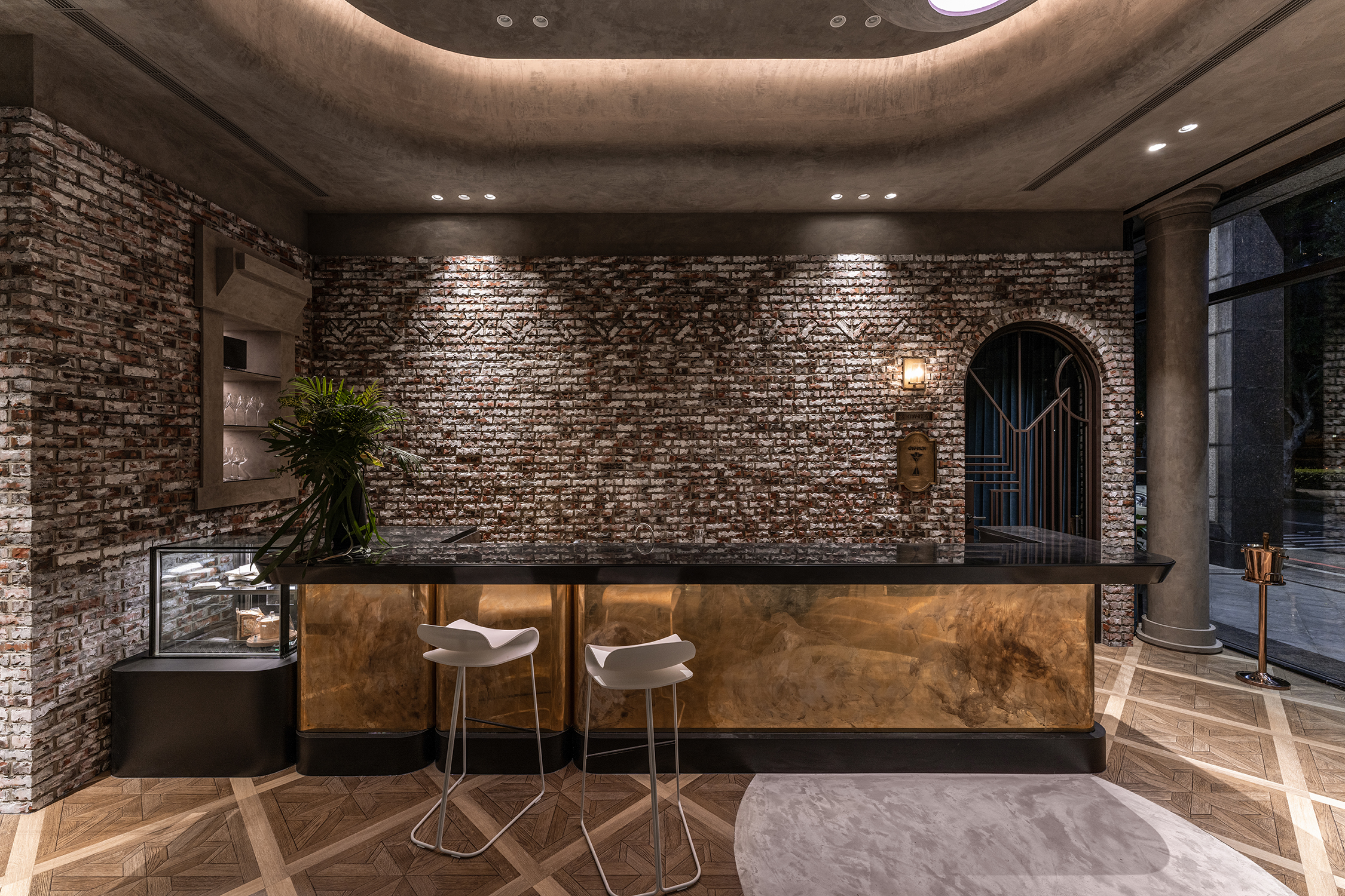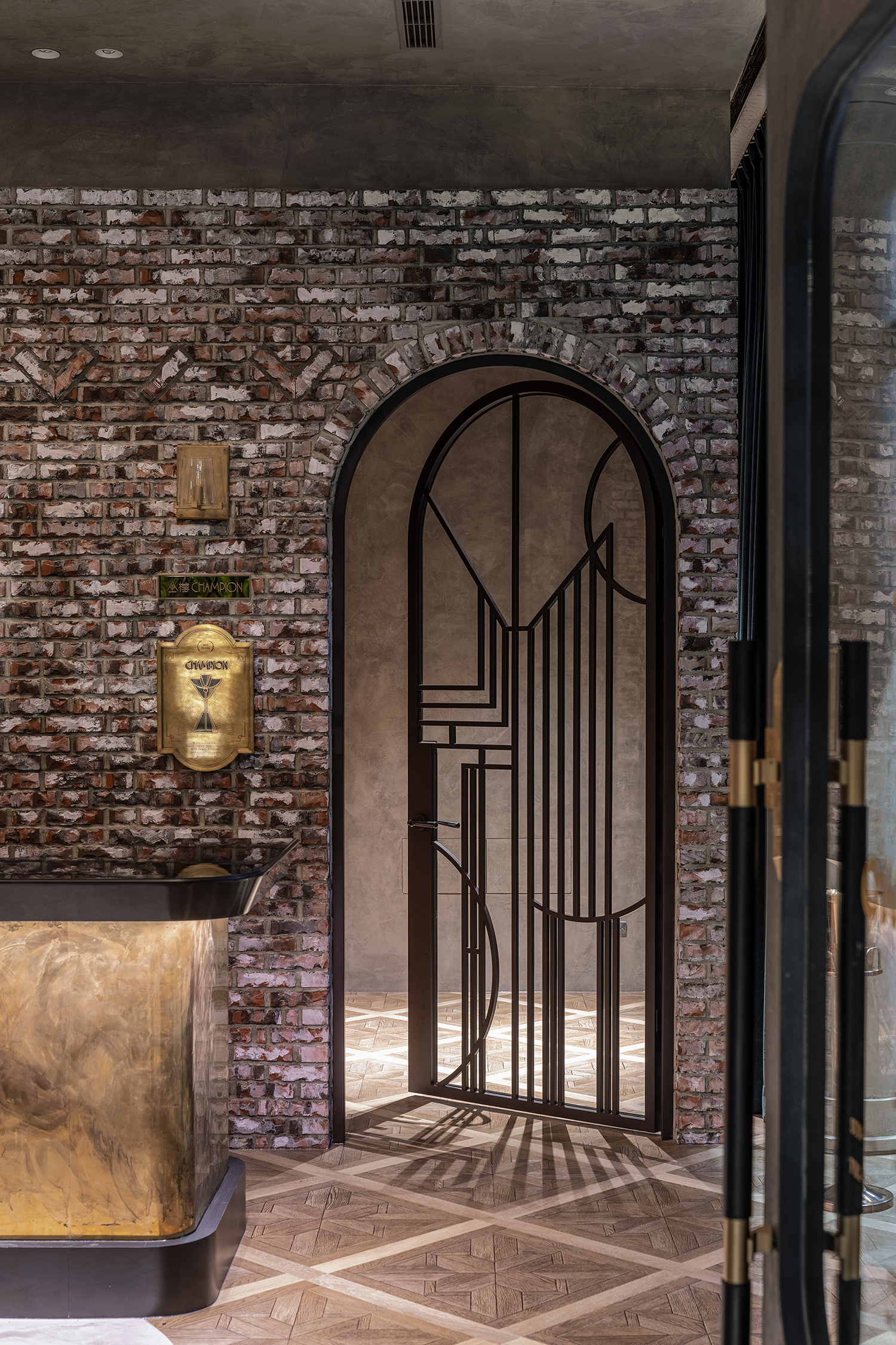 开出一个拱形门口,在砖墙上可以看到一个有趣的砖石结构,青铜板被精心镶嵌在底层,给人一种现代感。