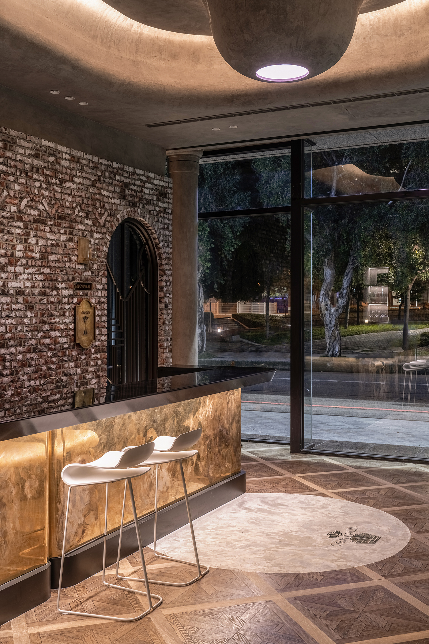 开出一个拱形门口,在砖墙上可以看到一个有趣的砖石结构,青铜板被精心镶嵌在底层,给人一种现代感。楼上,酒吧站位于布局的核心,提供了一个集中、适度的距离来服务每一位顾客。此外,光线和照明不仅勾勒出纹理和材料装饰,还让空间充满英伦风情。从空间的标志、吧台立面等立面细节上可以看到弧形的连续性,实现了企业形象的统一。