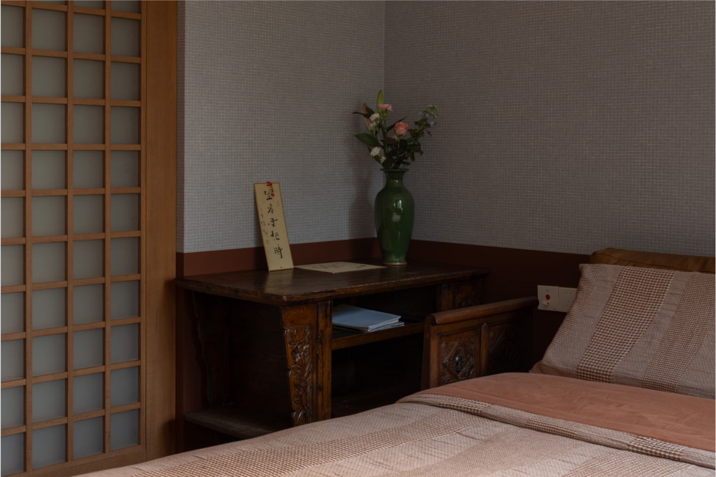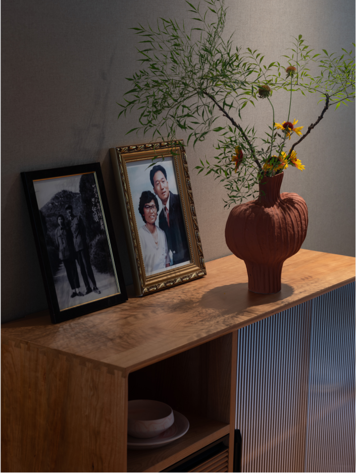 空间意境:并没有过多的造型工艺,安全舒适是第一位,在这个多变的功能区域,不做地台,铺上草席,营造氛围,以更多的软装陈设精美小物来打造空间“人设”,为妈妈留一个拍照“打卡”处,希望调动老人的生活热情,不与年轻脱节,细品时光中的惊喜。