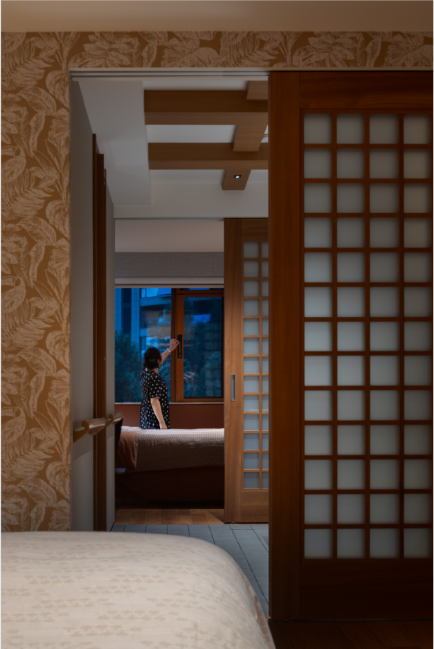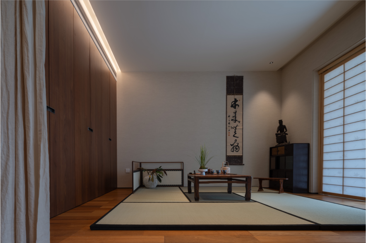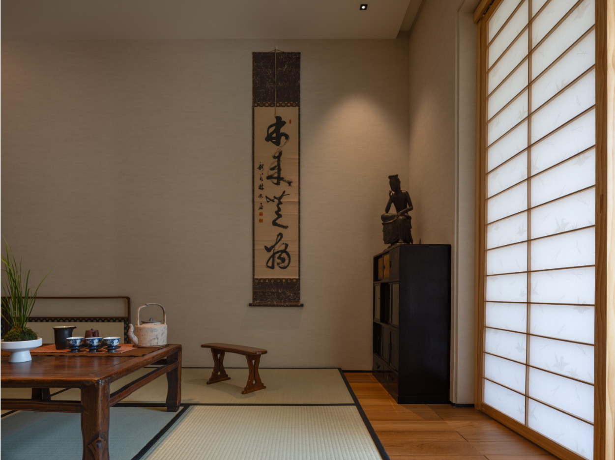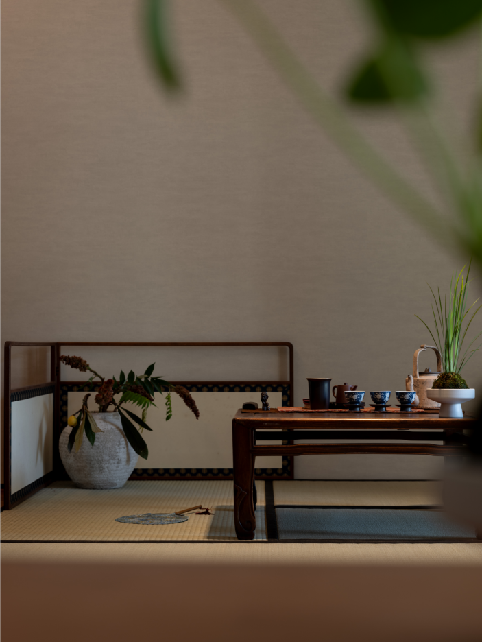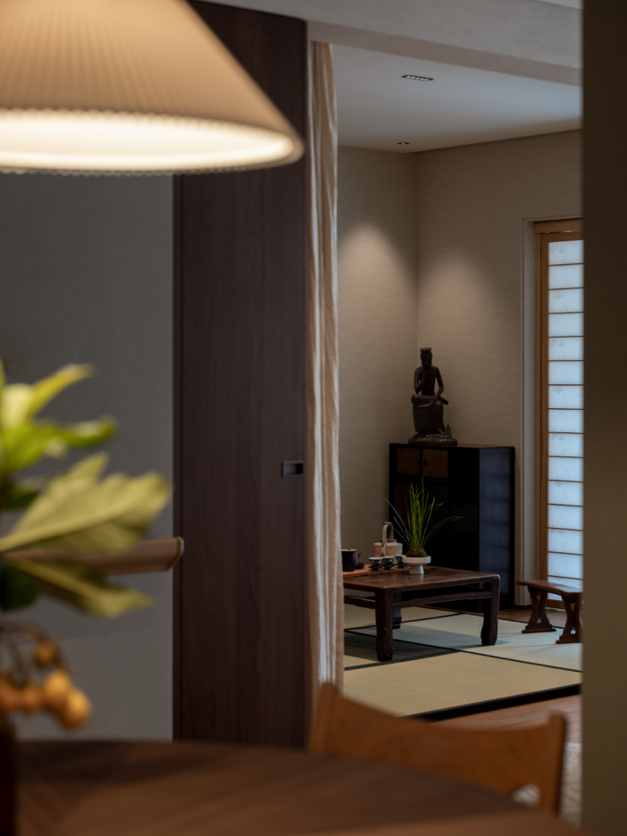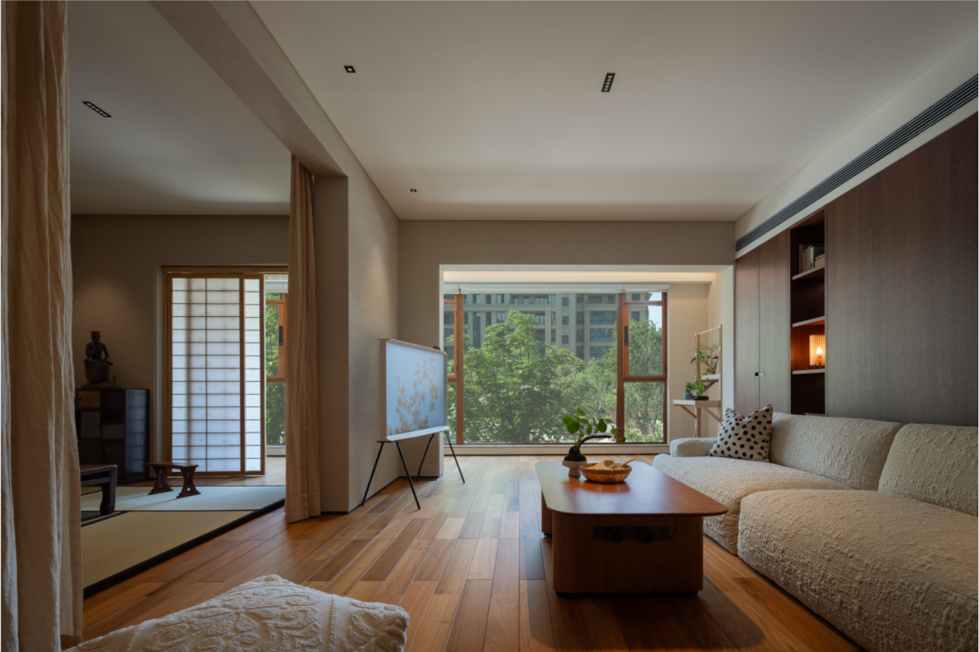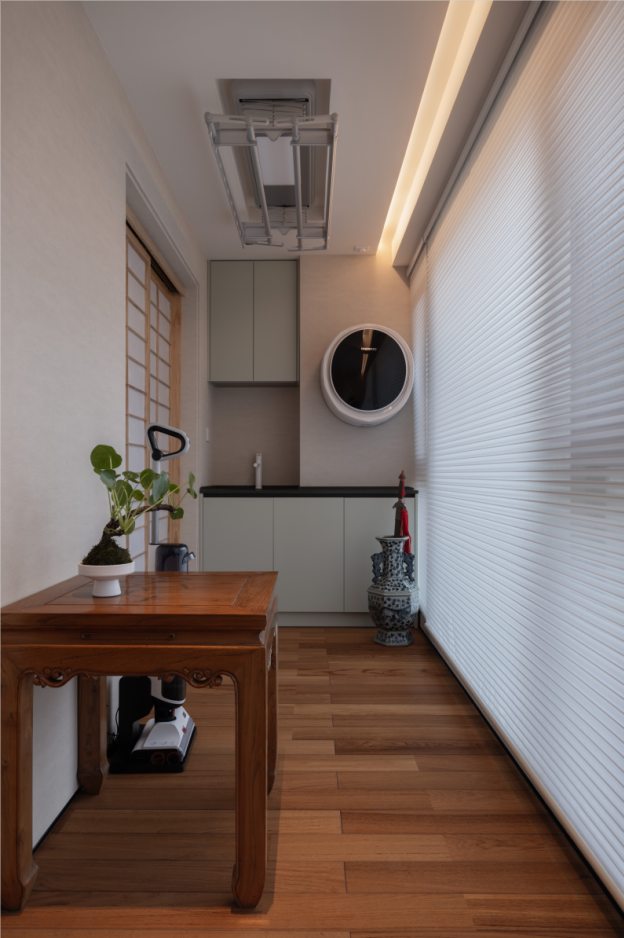2.去掉原始阳台推拉门,完全打开,公区的整体连接一片,这样顺畅的活动区域和充盈的采光都被“吸收”进来,榻榻米茶室紧邻阳台,设计半透明的障子纸移门,既能让充分的采光柔和的释放到整个居室,也能够分离生活阳台的功能,保持空间质感整洁。