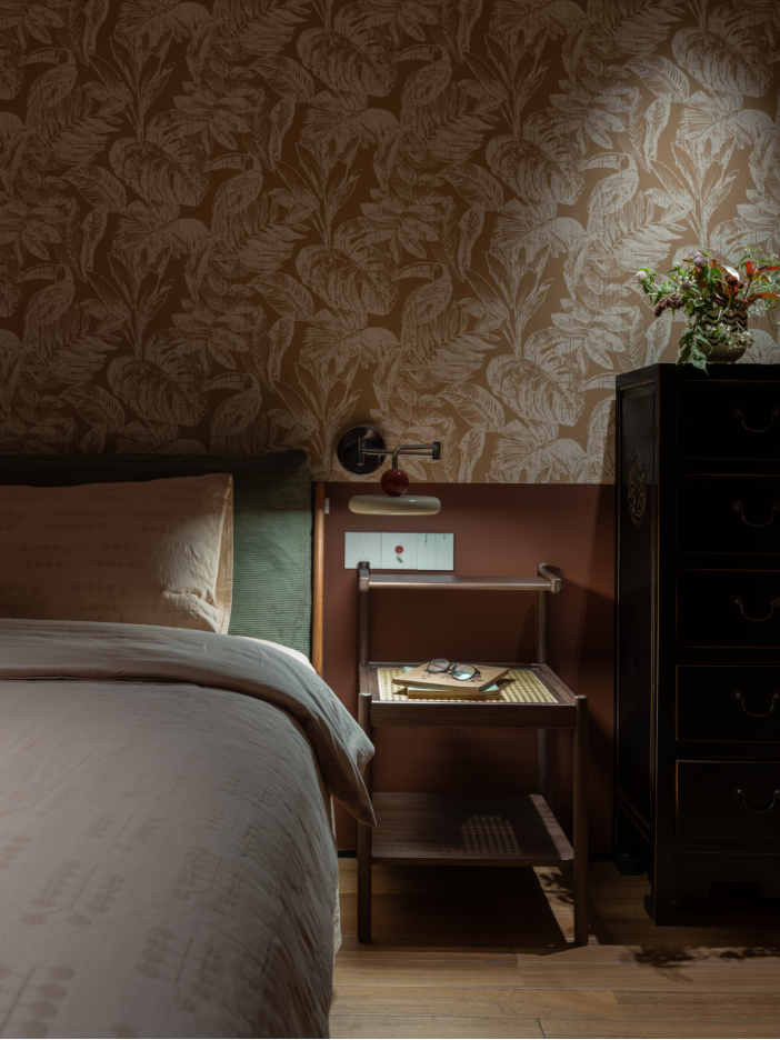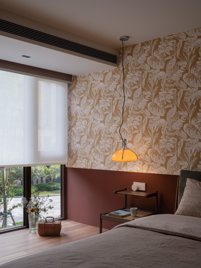 7.幸福大概就是无论何时回家,妈妈总会把屋子收拾的干干净净,因此,如今也希望给予父母收拾浪漫干净温馨的卧室空间,是平等的,没有暗示,去掉原始主卧的衣帽间,将储物分散在空间各个习惯顺手之处,衣柜嵌入床尾墙体与客厅背面柜体相连,齐平让卧室空间宽敞,将墙体空间充分使用;妈妈喜欢的墙裙颜色和日常服装惊喜契合,复古文艺的壁纸作为老师的妈妈气质很配。