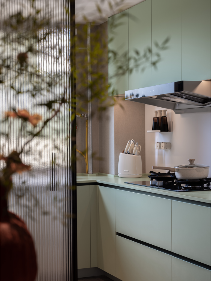 4.小时候厨房是妈妈忙碌的身影,抹茶绿在记忆中伴随着饭香,佯装帮忙填满口腹小欲望,执着于厨房和妈妈神奇技艺的“秘密”,将这些还原到厨房里,现代化的厨房便捷好用,记忆中的“家的味道”被保留。