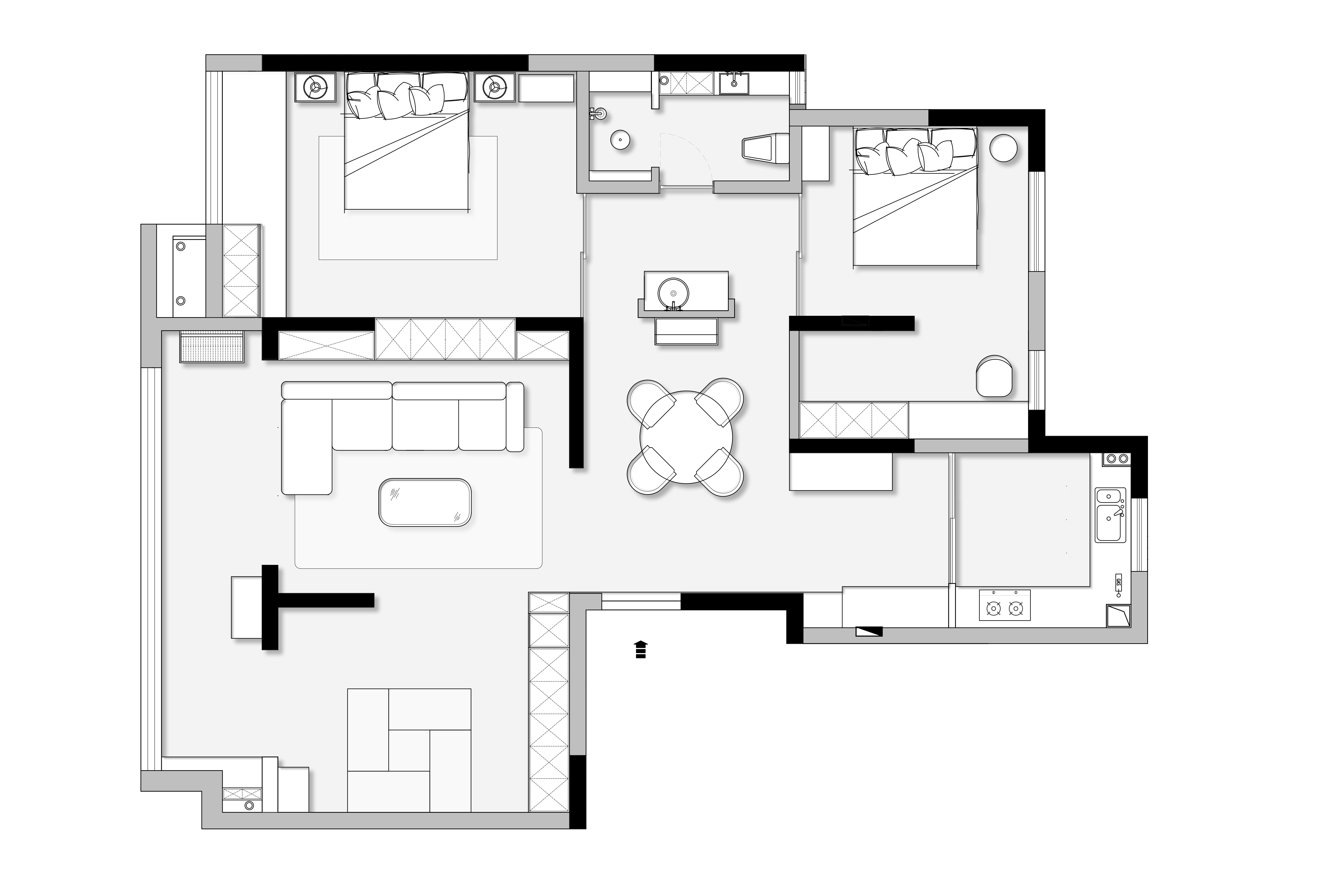 空间布局:1.原始入户南北向较长,东西向仅1米窄廊,分布3扇门与客餐厨公区连接,不仅通过起来拥堵,空间细碎,动线单一,无法舒适互动和使用,因为常住人口为两位老人,因此,不需要留有太多的卧室,打开其中一个空间并入客厅公区,以榻榻米多功能房的方式呈现,与客厅齐平,拉开麻帘,开放式茶室与客厅互通,女儿偶来,这里摇身一变成为榻榻米卧房,友人来访夜宿也可解决,空间的整体布局流畅“大方”起来。