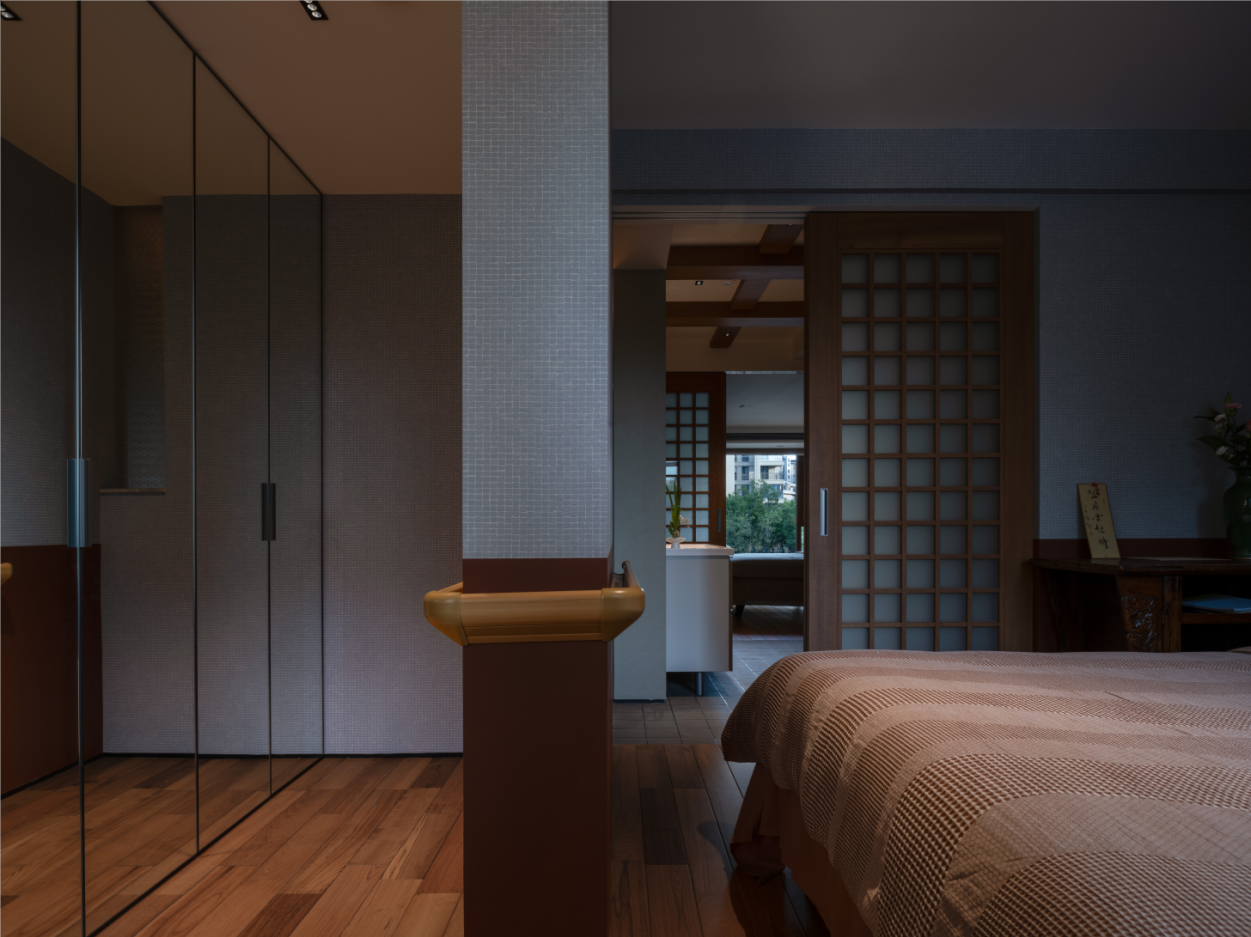 8.原始的客卫去掉,并入爸爸的卧室,这里设计了书房和衣帽收纳区域,因为墙体遮挡,因此设计镜面衣柜,视觉宽敞空间,同时也不影响睡眠,预留了未来的更多使用功能,护工看护的空间做了预留,适老化的设计是对老年方便照顾面面俱到的考虑。