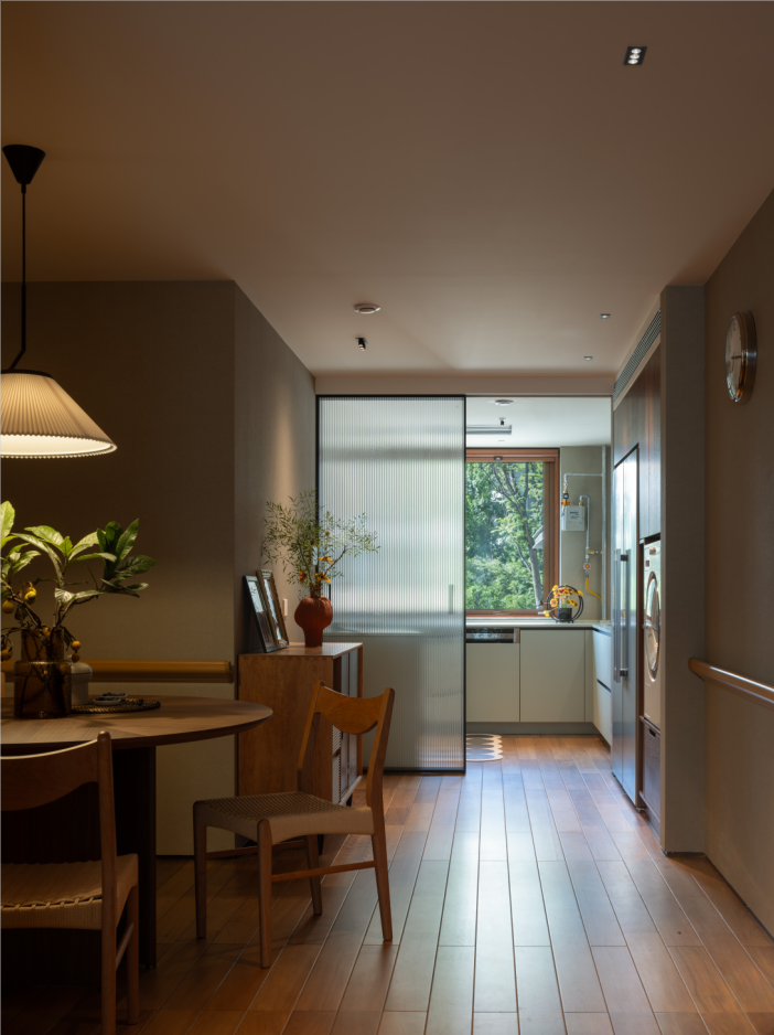 3.原始空间密集的隔墙被拆除打开,根据功能规划增加新的空间隔墙,门厅西侧居中是餐厅空间,与公共洗手池空间形成洄游动线,这里关照各个空间,原餐桌温暖围合,安全多用,精选的很多家具物件,都在还原记忆中老屋的情绪,老回忆新生活互相渗透。