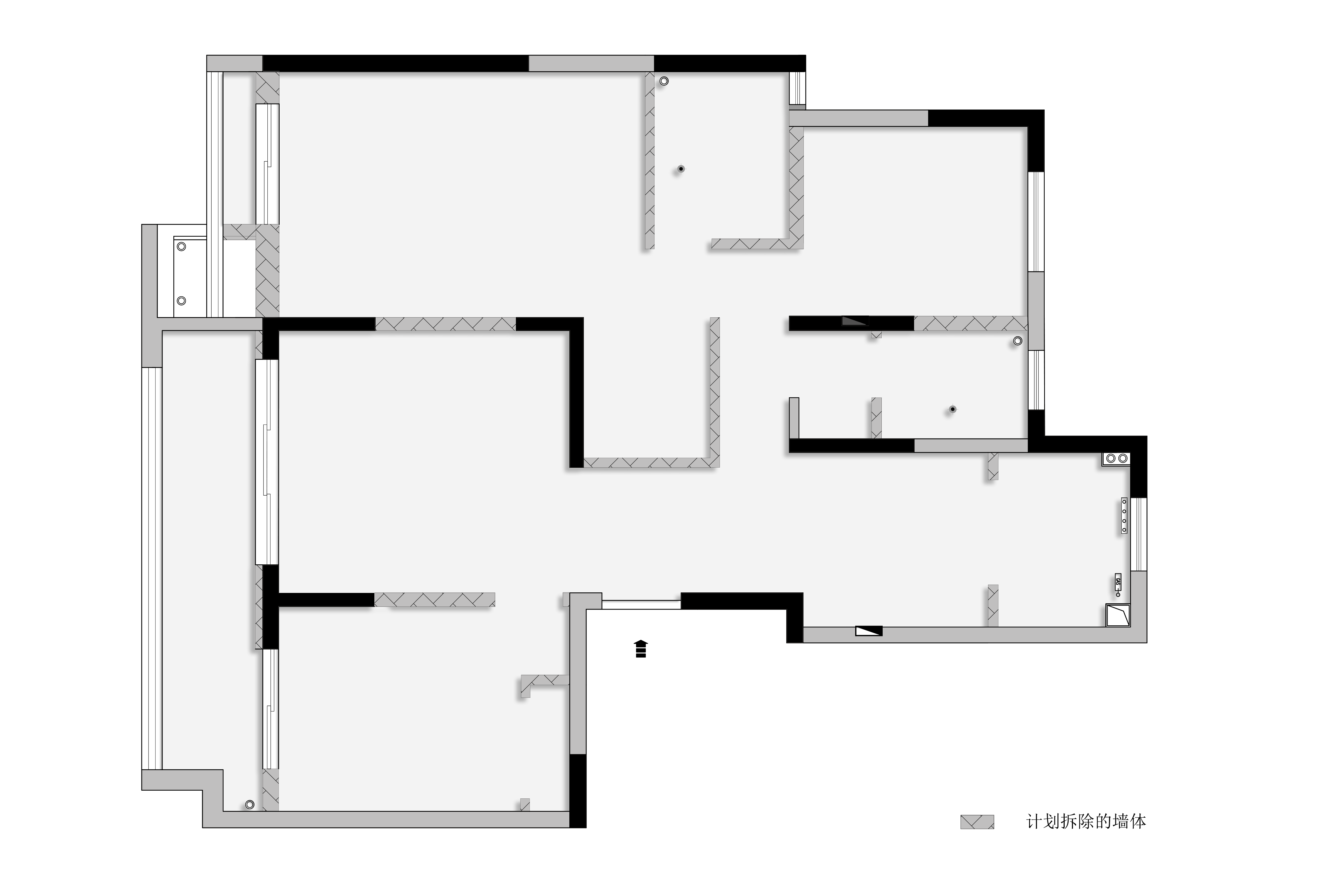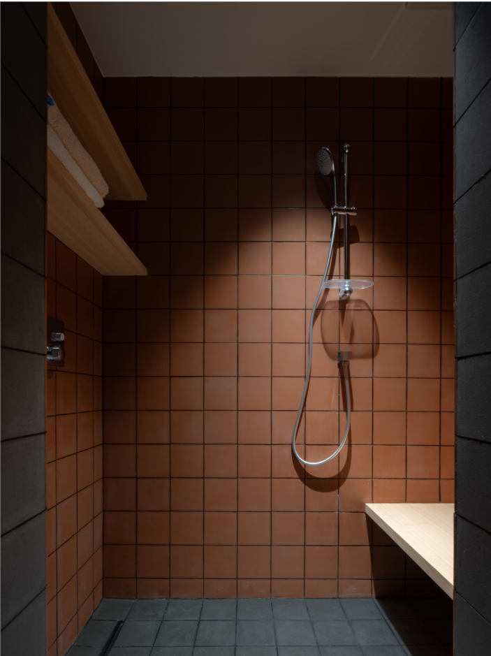 6.原始空间有两个卫生间,主卧的非常小,加之平日常住老人两口,设计师考虑到卫浴间三件套需要围合布置,考虑轮椅拐杖的使用,因此卫生间需要宽敞的交通空间,去掉客卫,扩大主卫,改作宽敞的三分离卫浴间,从中间分开,南侧淋浴,北侧马桶,双厕纸架和扶手安全使用,成为两个老人卧室的公用卫浴间。