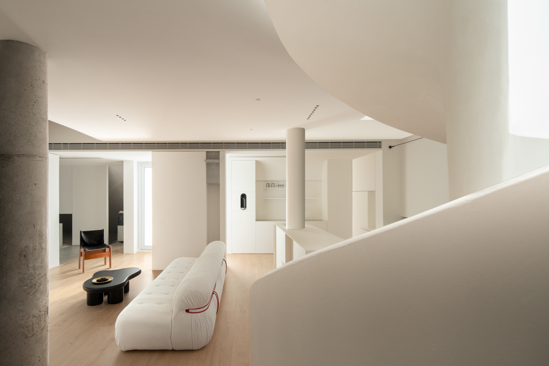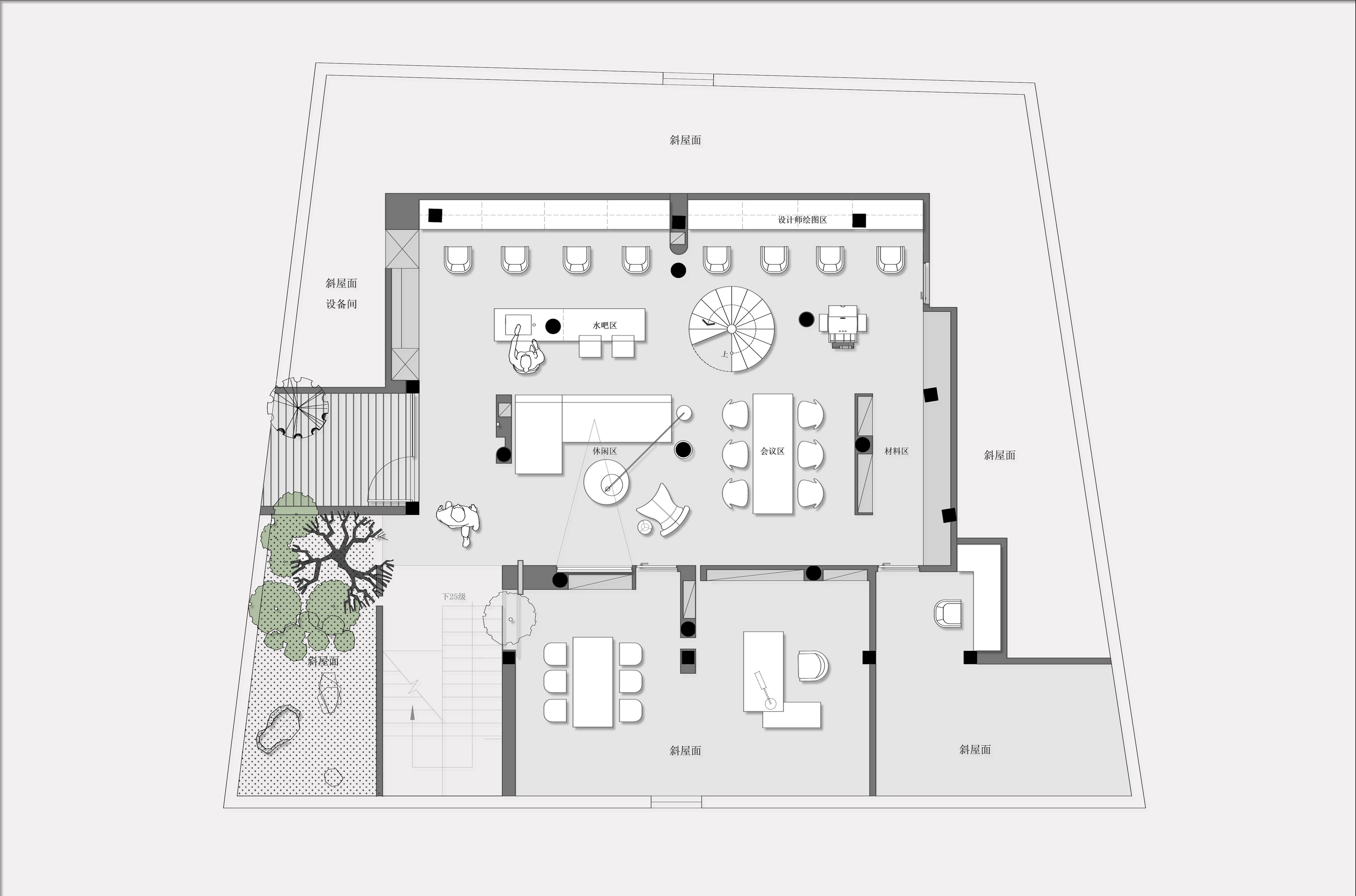项目定位:本项目位于江西万年县一套顶层办公空间,案子以作为顶楼公寓改造项目,设计师对于理想办公空间的探索成为了设计出发点,希望办公空间不再只是提供单一办公的地点,更多是给人们提供可以交流互动的公共空间。办公室抛弃常规做法,而选择将空间彻底开放,形成一个围绕着休闲区而展开的格局以及从室外延伸进来的视觉。