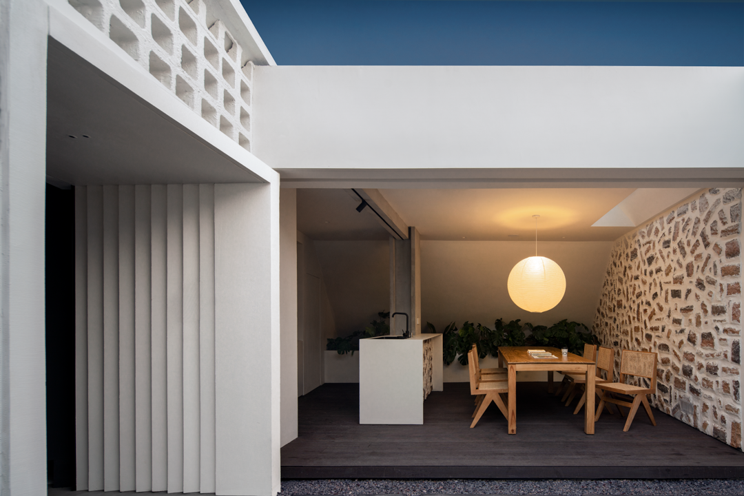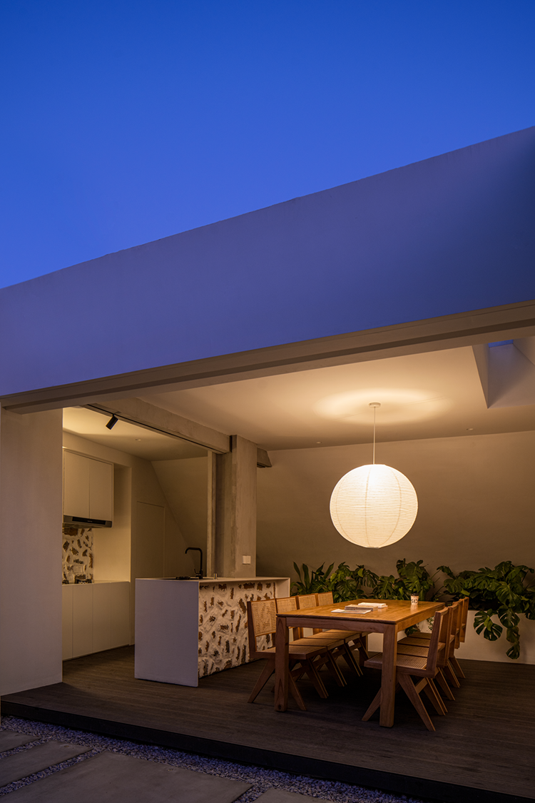 设计选材:干净、简单的花园处理方式,保留着空间张力与自然的一面,释着原生态的纯粹之美。餐厅分为室外和室内,可以根据心境进行选择。餐桌和餐椅均选用了木色,看起来颇为宁静,舒适感十足。无处不在的绿植搭配与它们搭配在一起,使得空间更具呼吸感,十分具有大自然的气息。