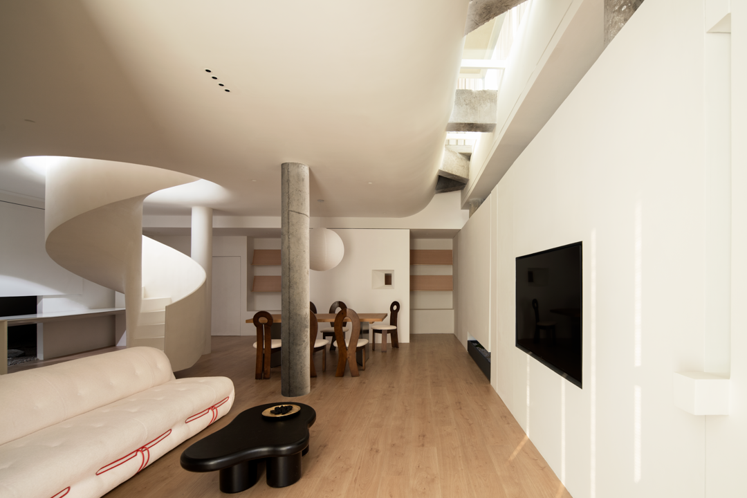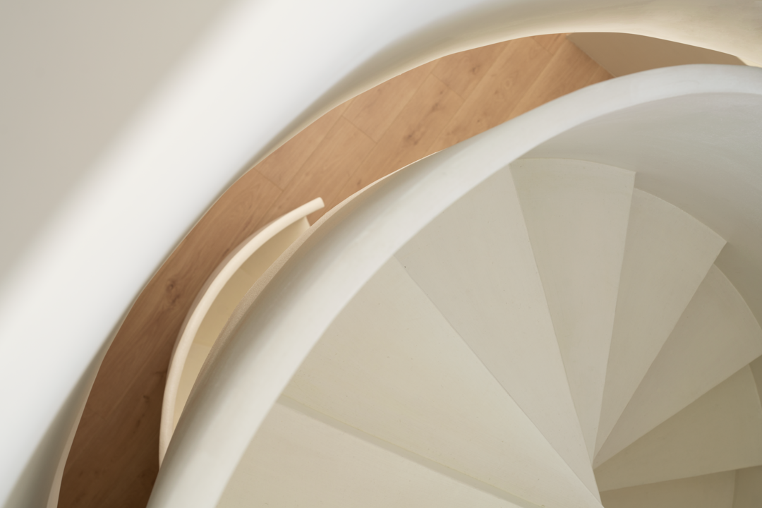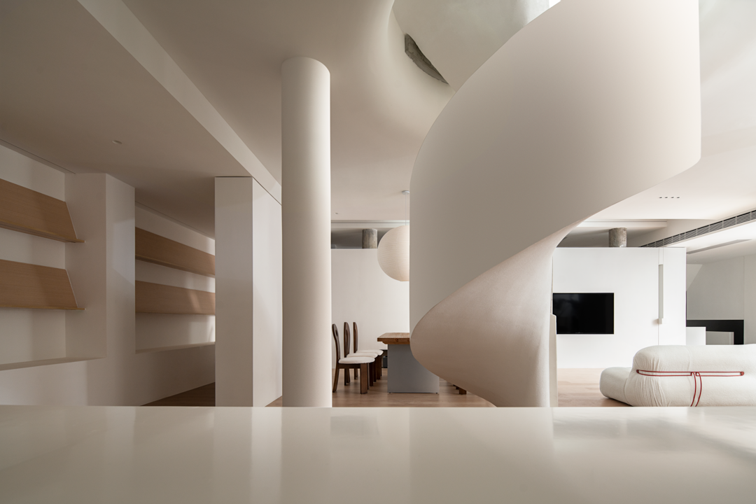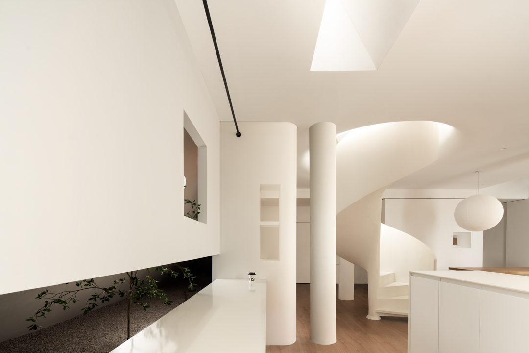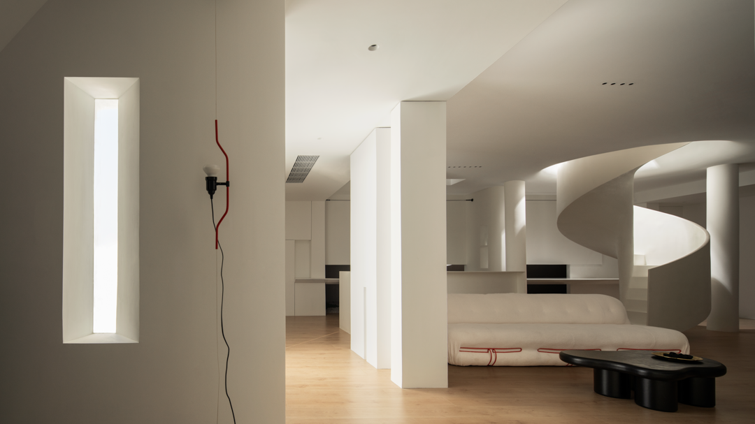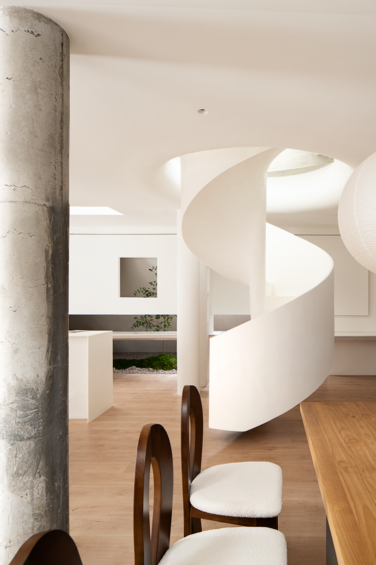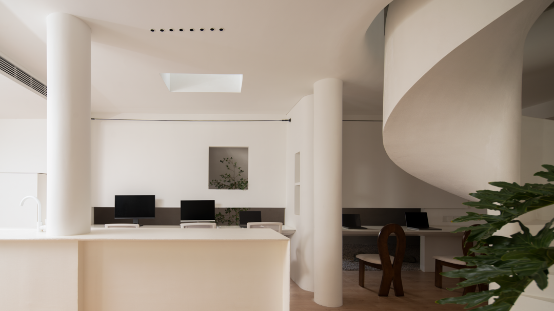 空间布局:会客区十分宽敞,巧妙地把它设计成挑高的采光空间,使得整个视野得到了一定的延展。天窗的空间,为的是将窗外的美景与光线一同有引进屋内,优化了整体的空间,使得空间发挥其最大化的优势,也极大地满足了视觉需求。依照洄游动线的设计理念,让展示空间、水吧区、办公区以及会客厅,既独立又能够产生互动,空间活动变得更加自如。旋转楼梯在空间中它可以呈现许多不同外观,在高,窄的空间中呈现完美无瑕,为建筑增添独特的艺术细节,进一步提供便捷的垂直动线。设计师通过运用回形动线的手法,将空间和功能紧密相连,营造出个性化分割区域,使人们与空间之间产生了有趣的互动。这种设计手法不仅增加了空间的层次感和立体感,还为人创造了更加丰富的空间维度和体验。