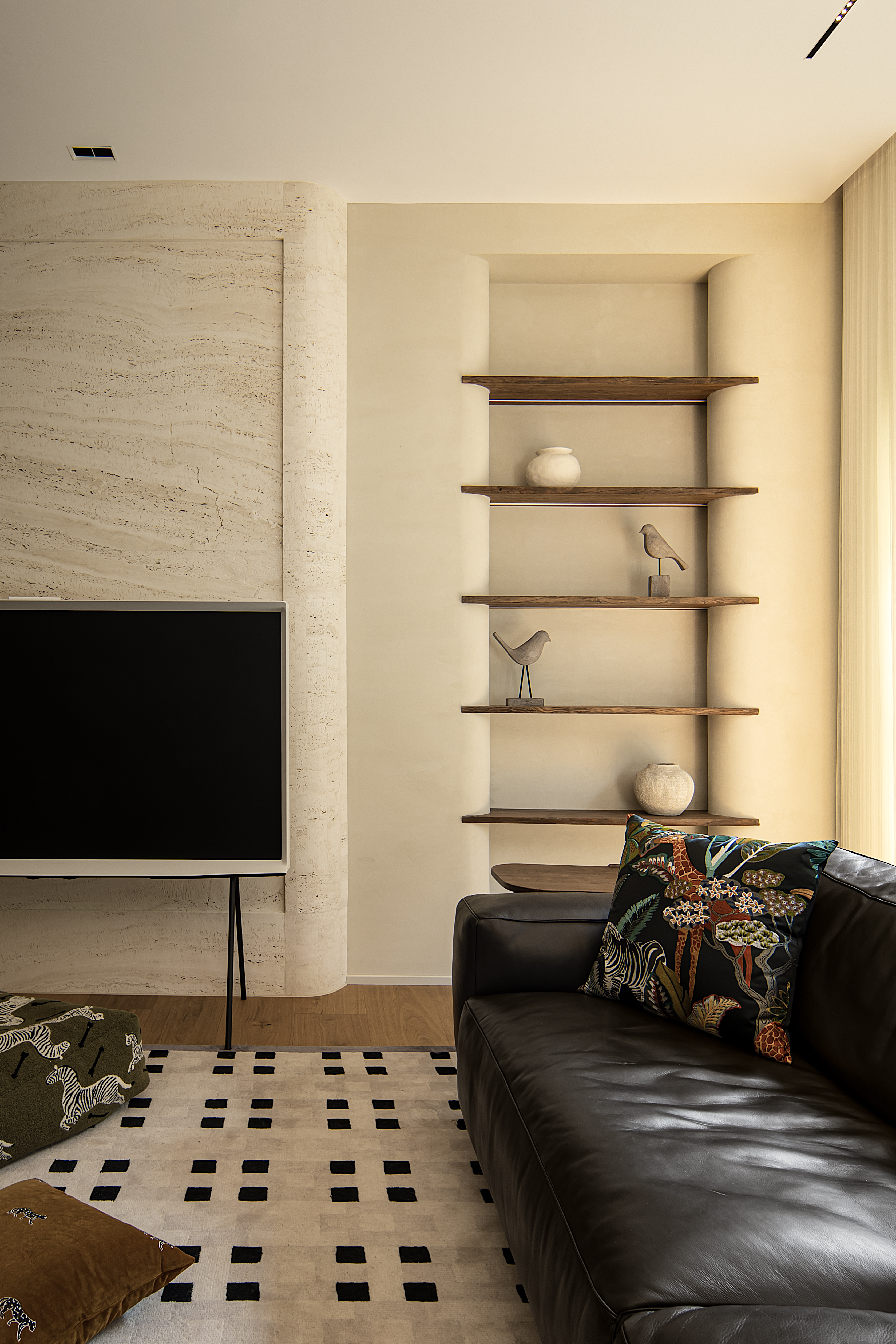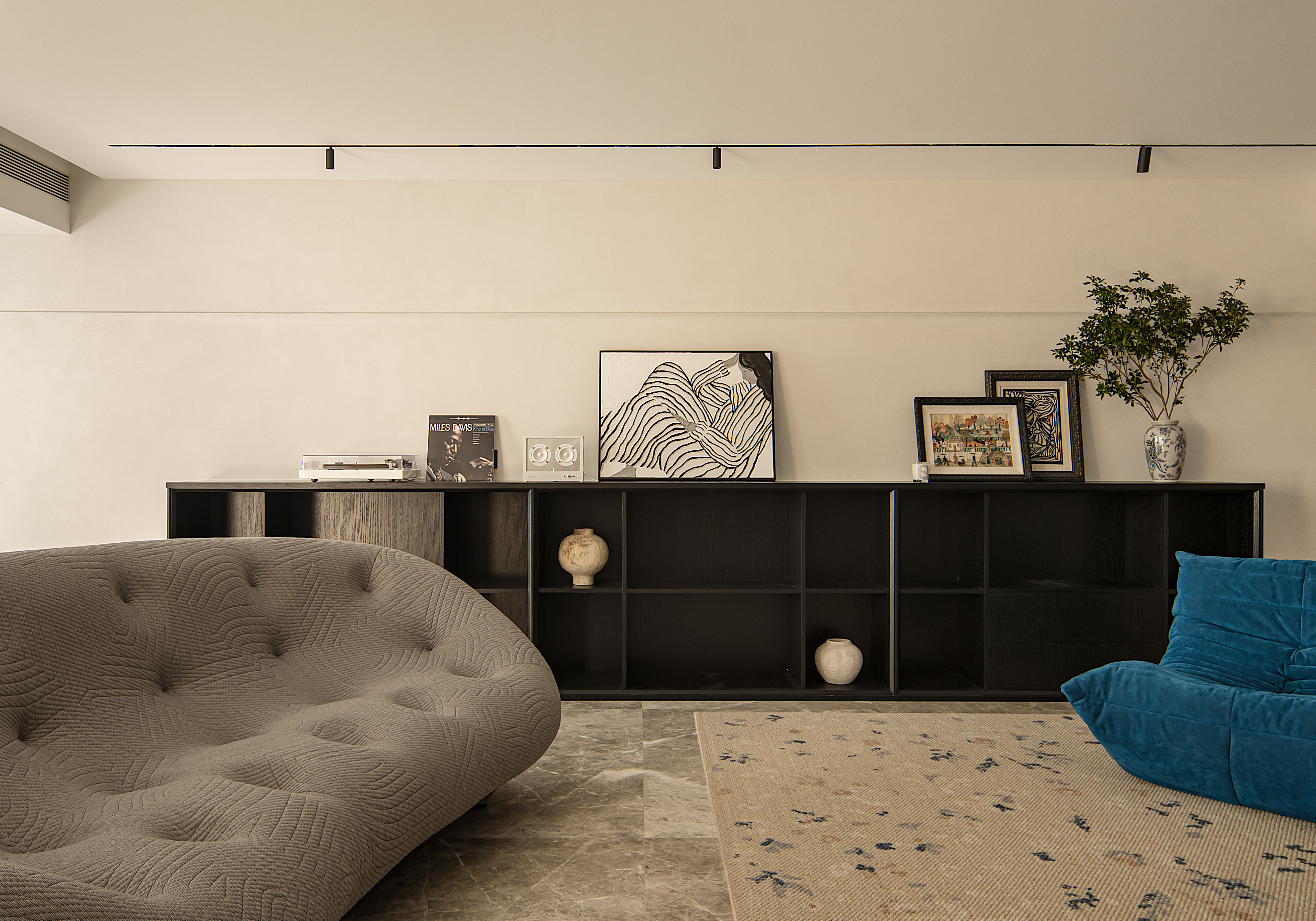 这么大的客厅,窗明几净的感觉。背景墙用了顶级的白色洞石,和整个风格很契合。这里我给业主淘了几块老榆木,做一个书柜,随手拿下一本没有看完的书坐在沙发上晒着太阳,看看书,享受着安静的时光。