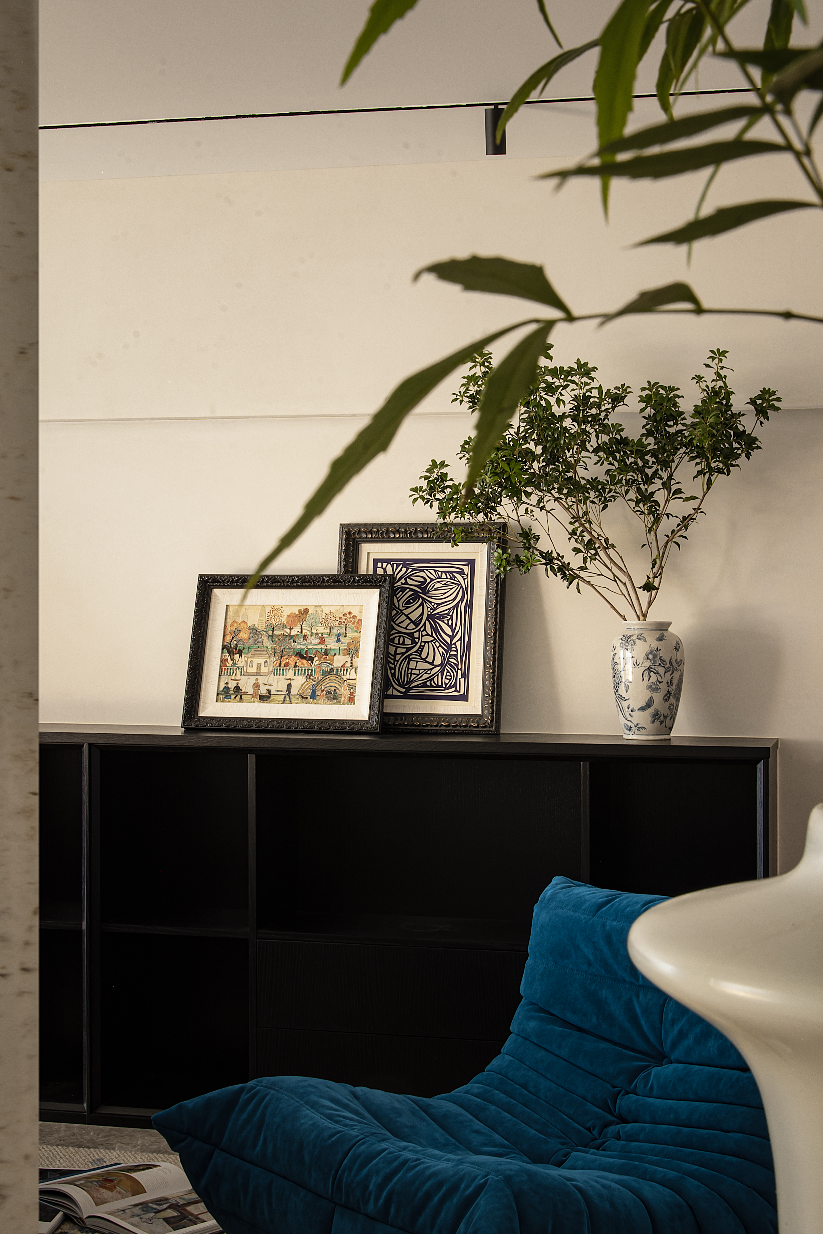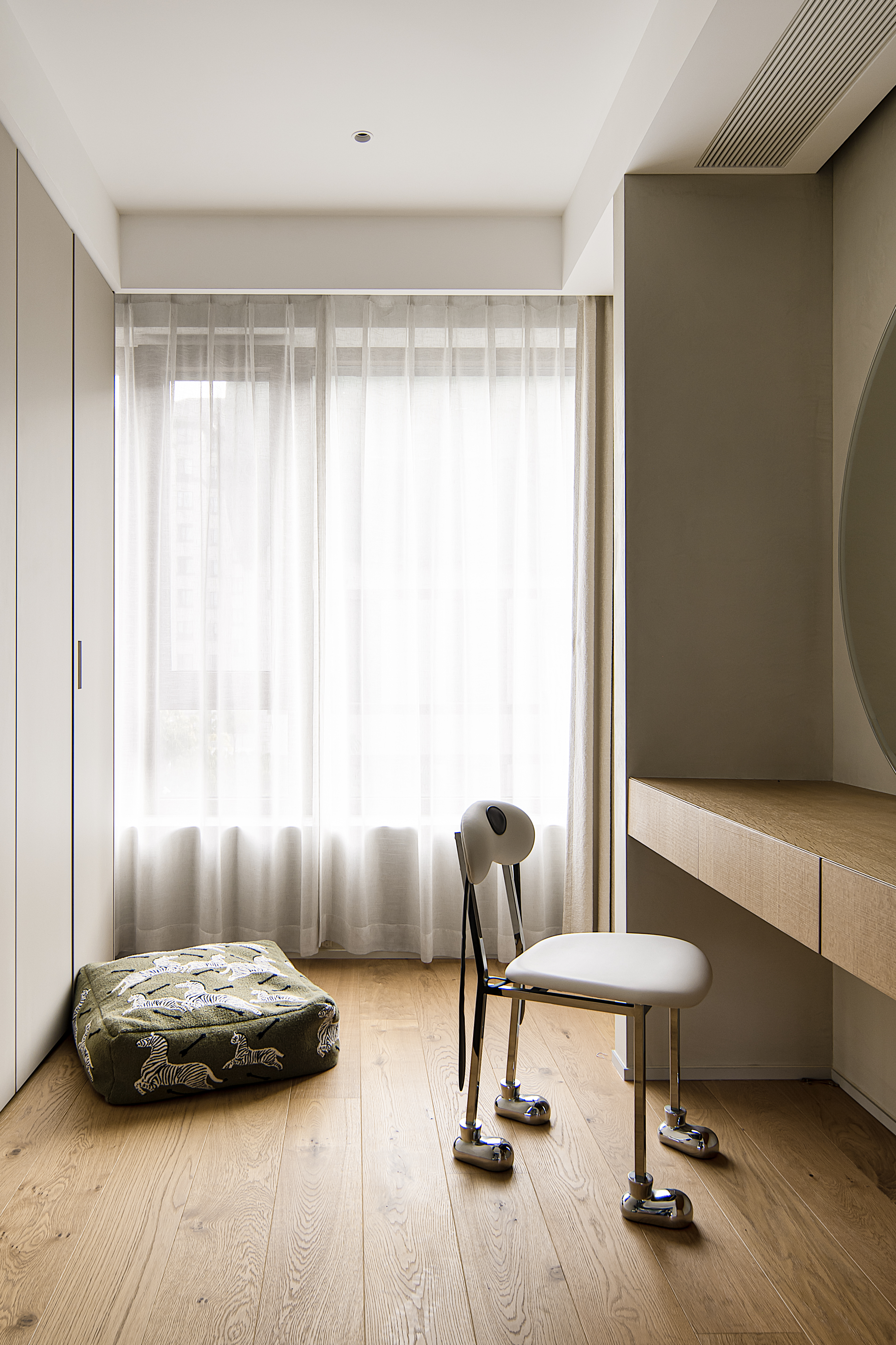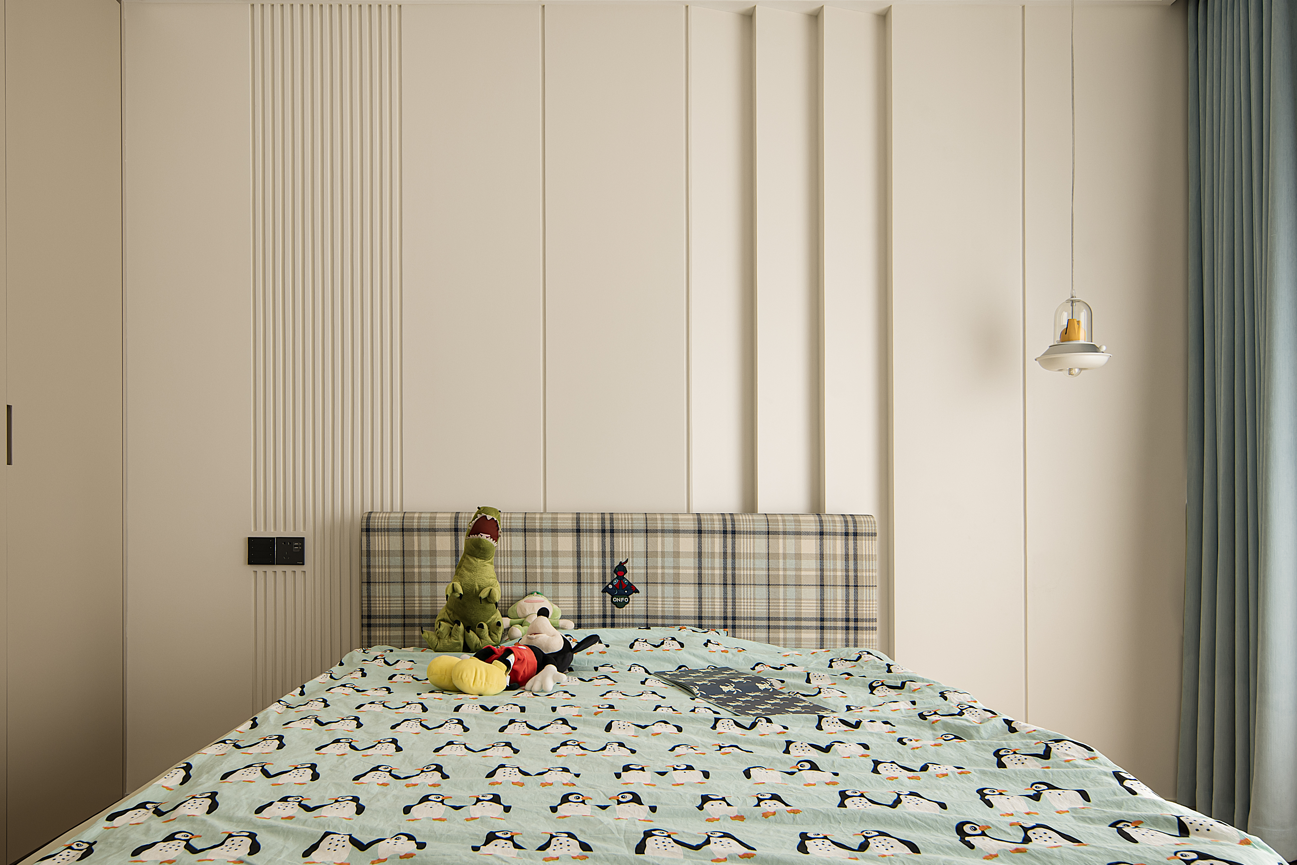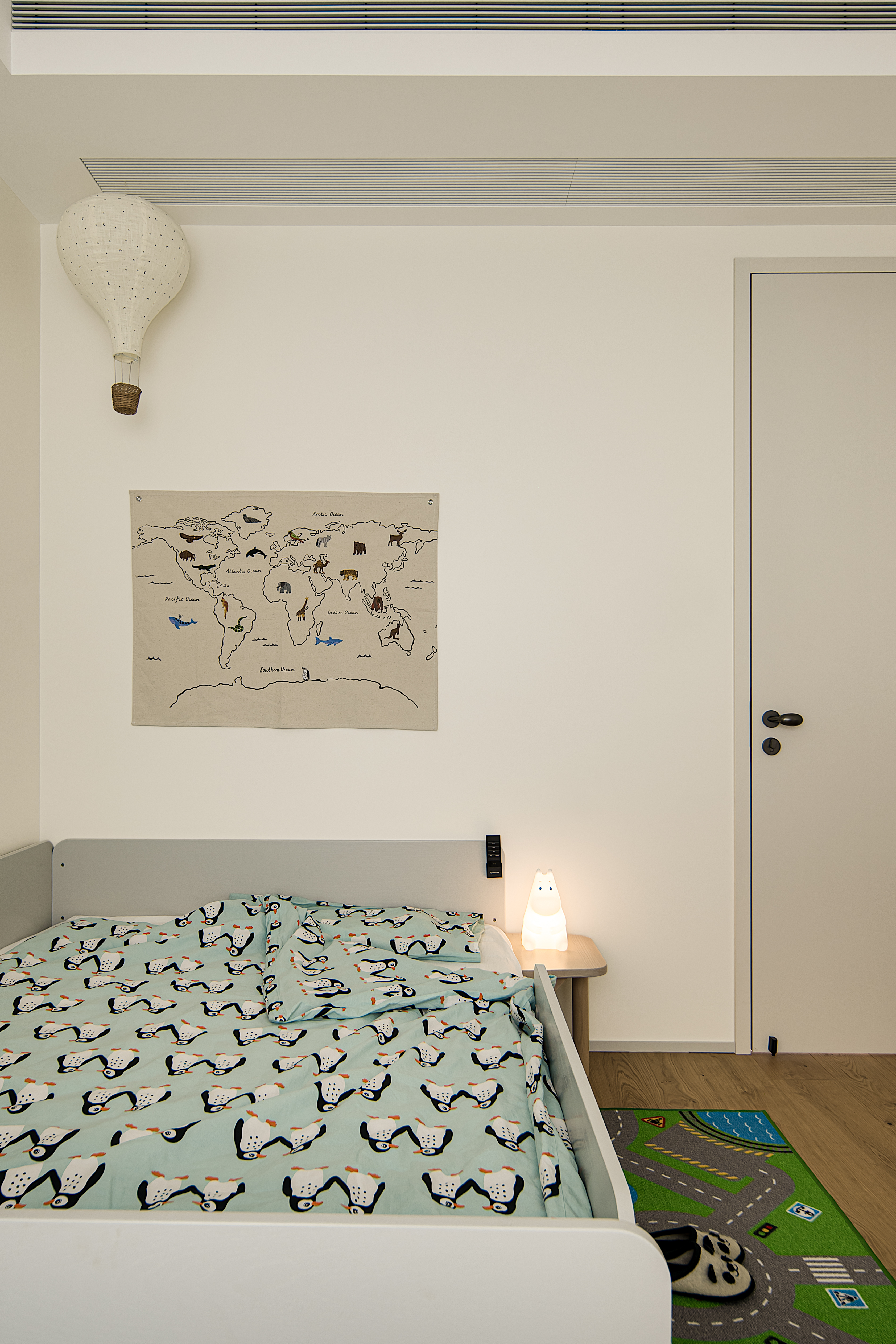 为了方便照看小孩,主卧的隔壁设计的是儿童房,进门是大的衣帽间,满墙的柜体最大化利用空间增加储物。中间预留大片区域后期可铺置圆形地毯放上小帐篷、小书桌,为孩子打造玩耍、手工、娱乐的空间。睡眠区的布置考虑到小孩需要安全感,我们将床靠近角落,后期床尾放置成品书柜。