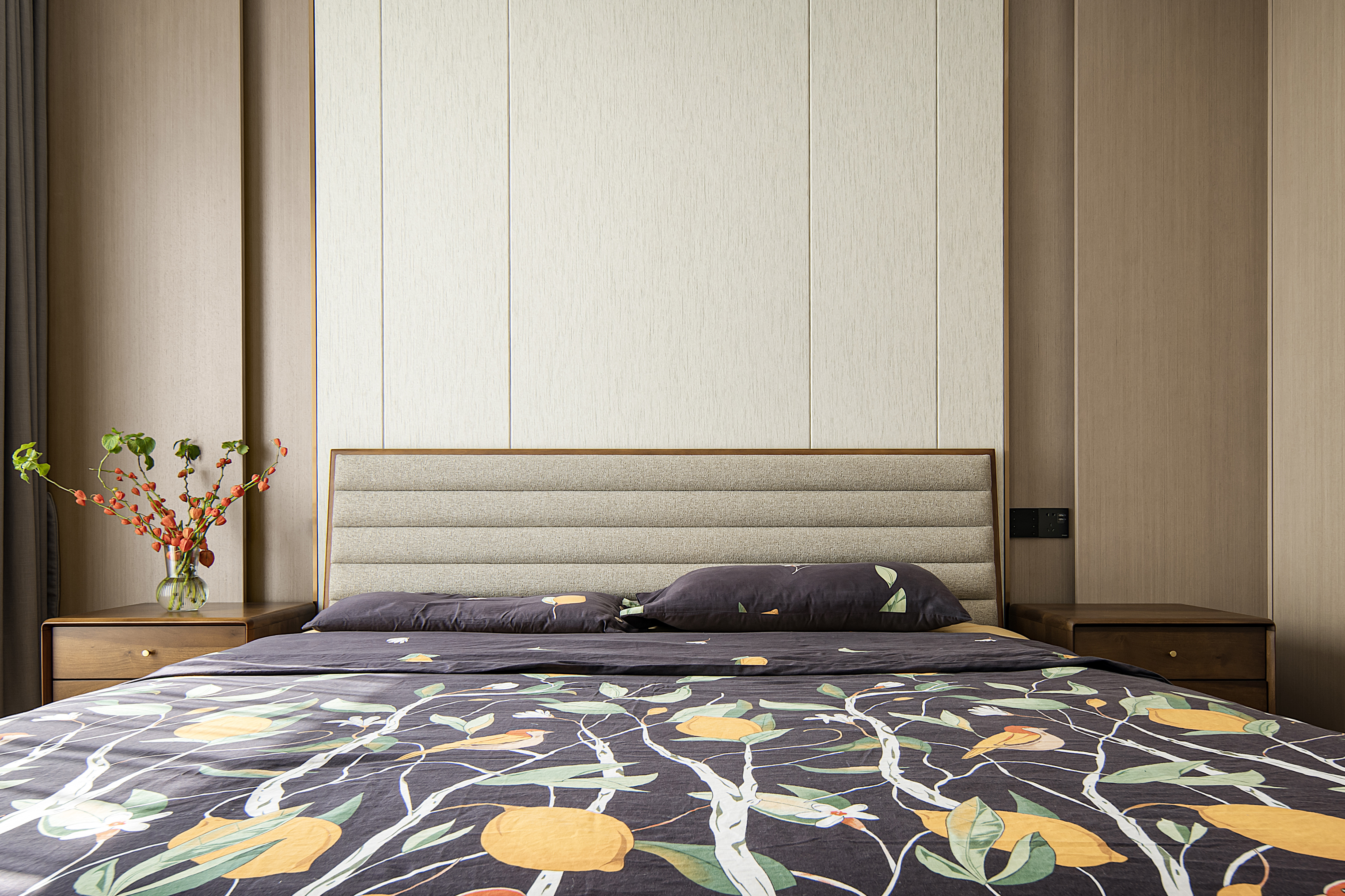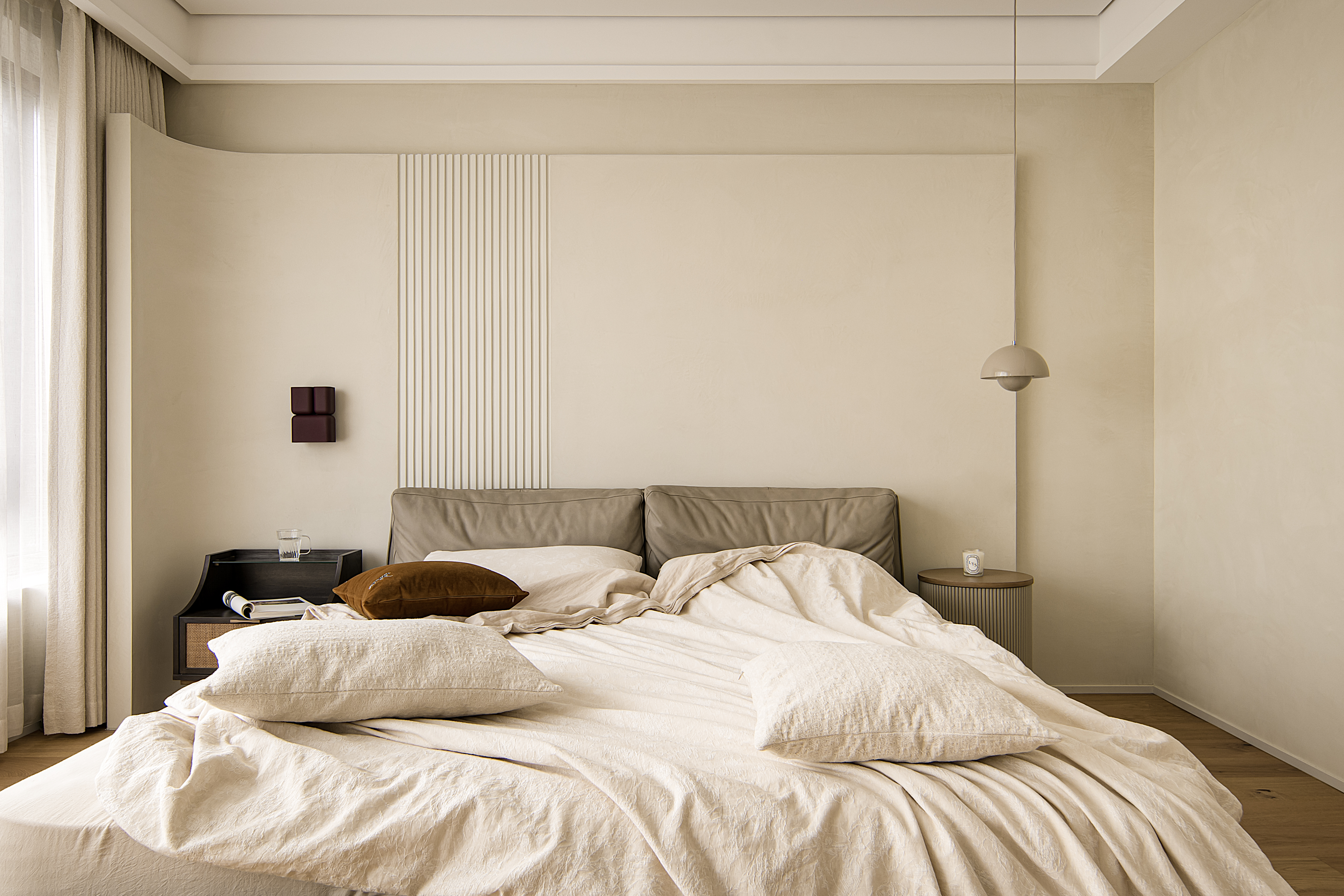床头背景设计弧线造型有一定的包裹性,给人一种安全感。