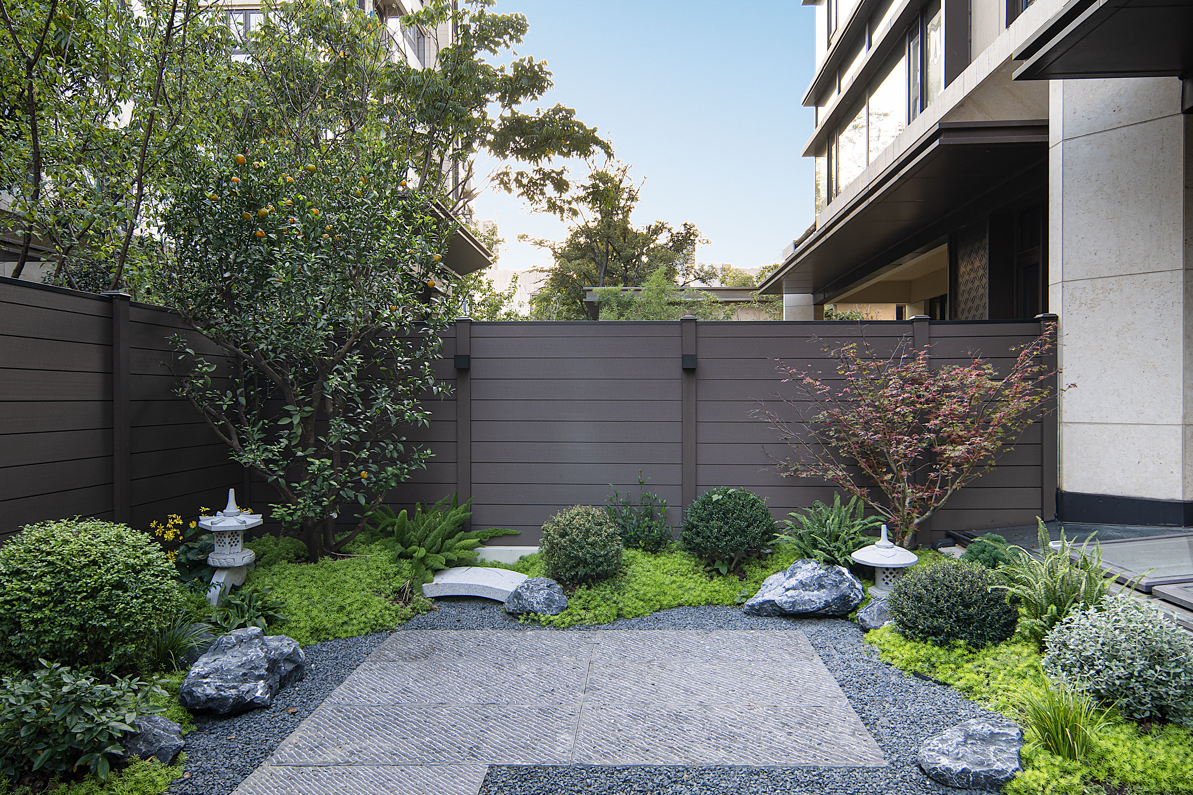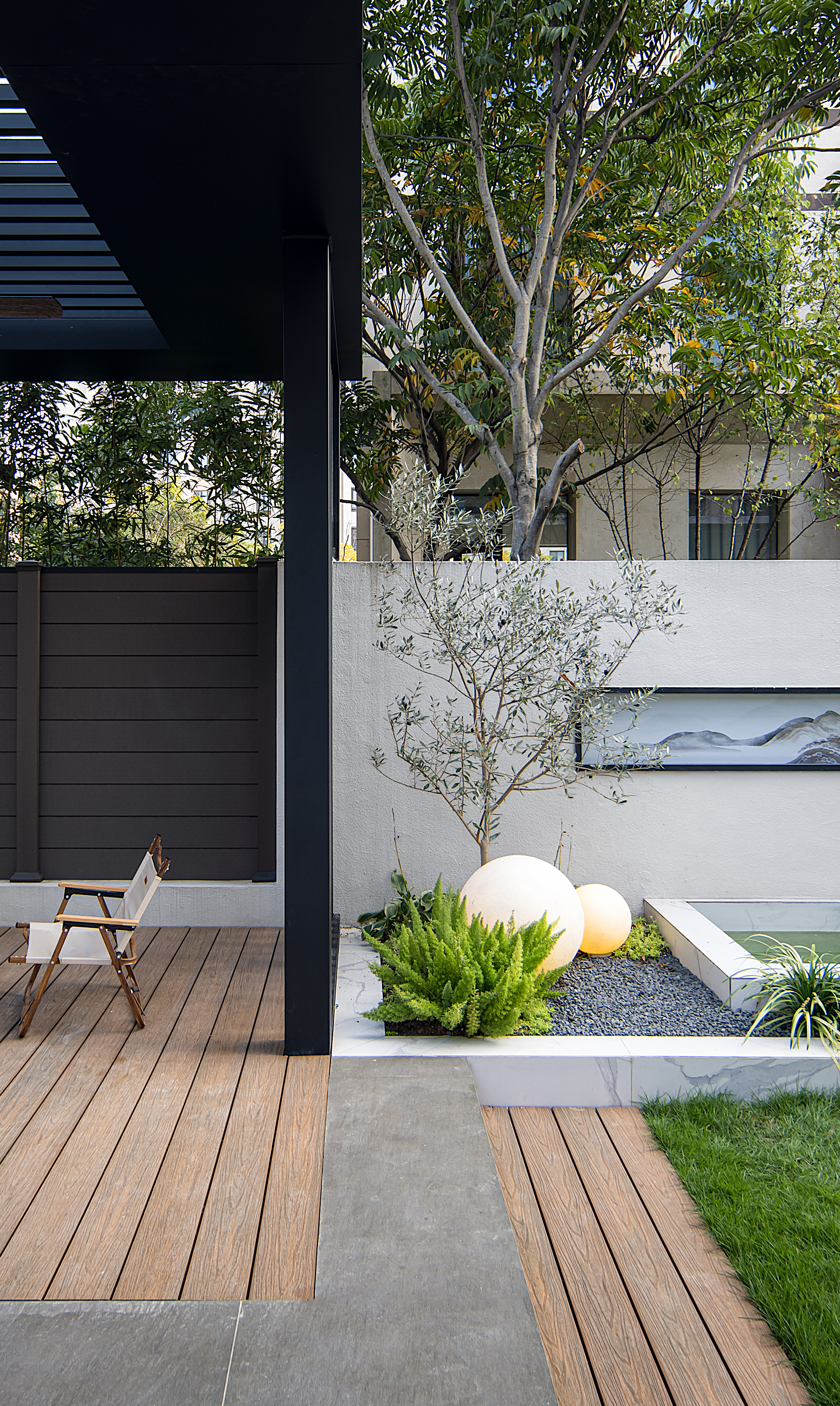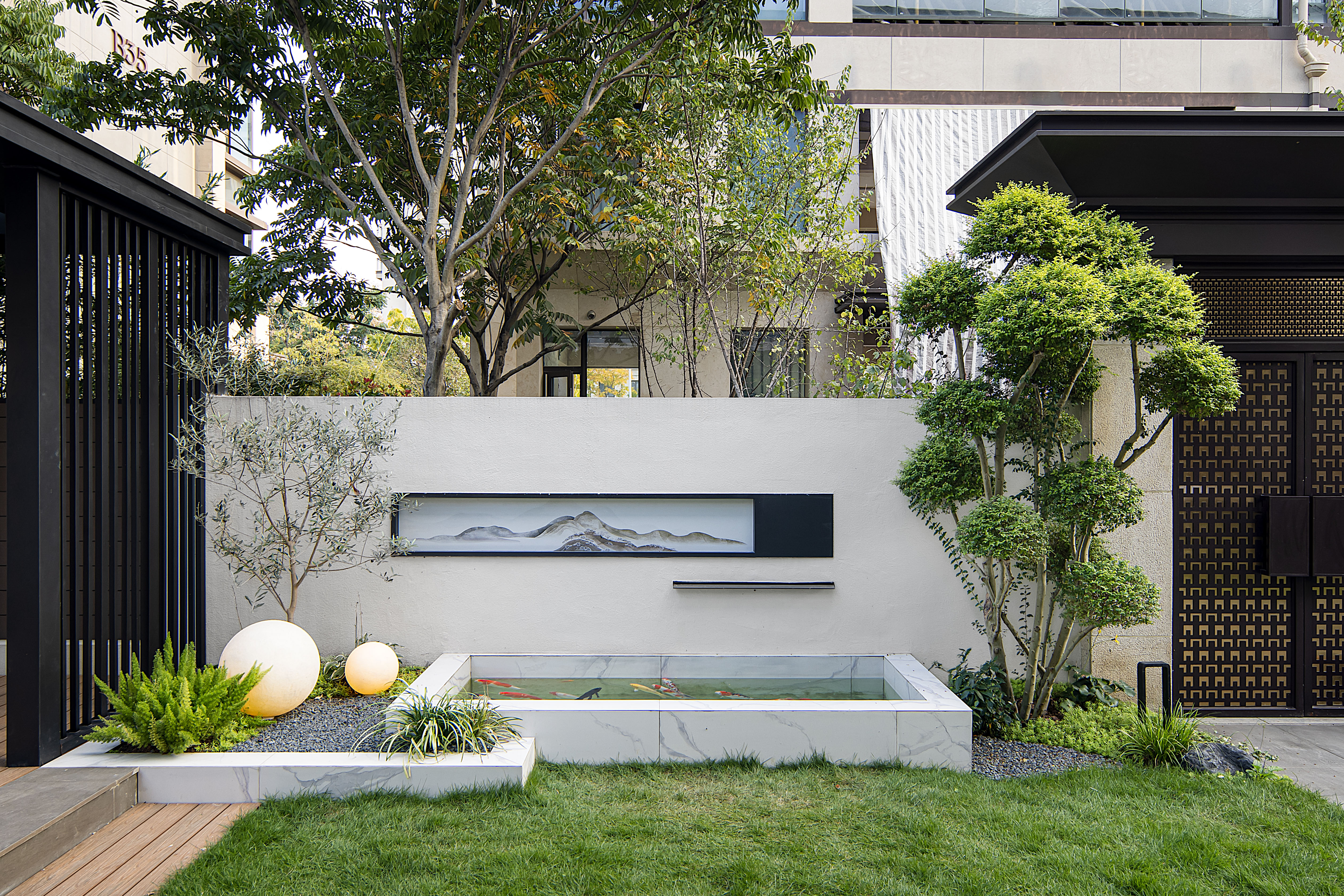 这里是一层私人庭院,右边是凉亭和水景,从这个汀步进入一层的室内。