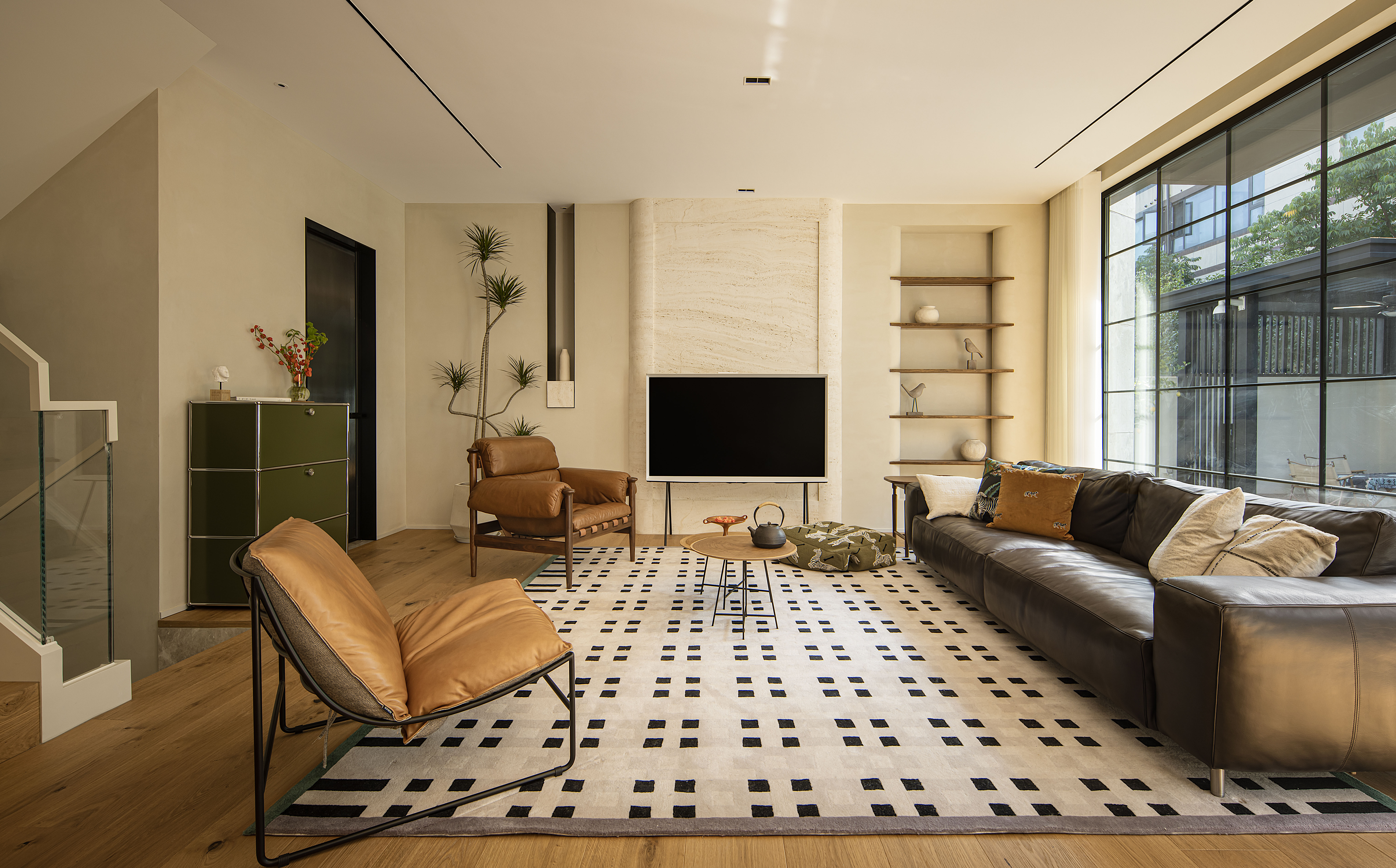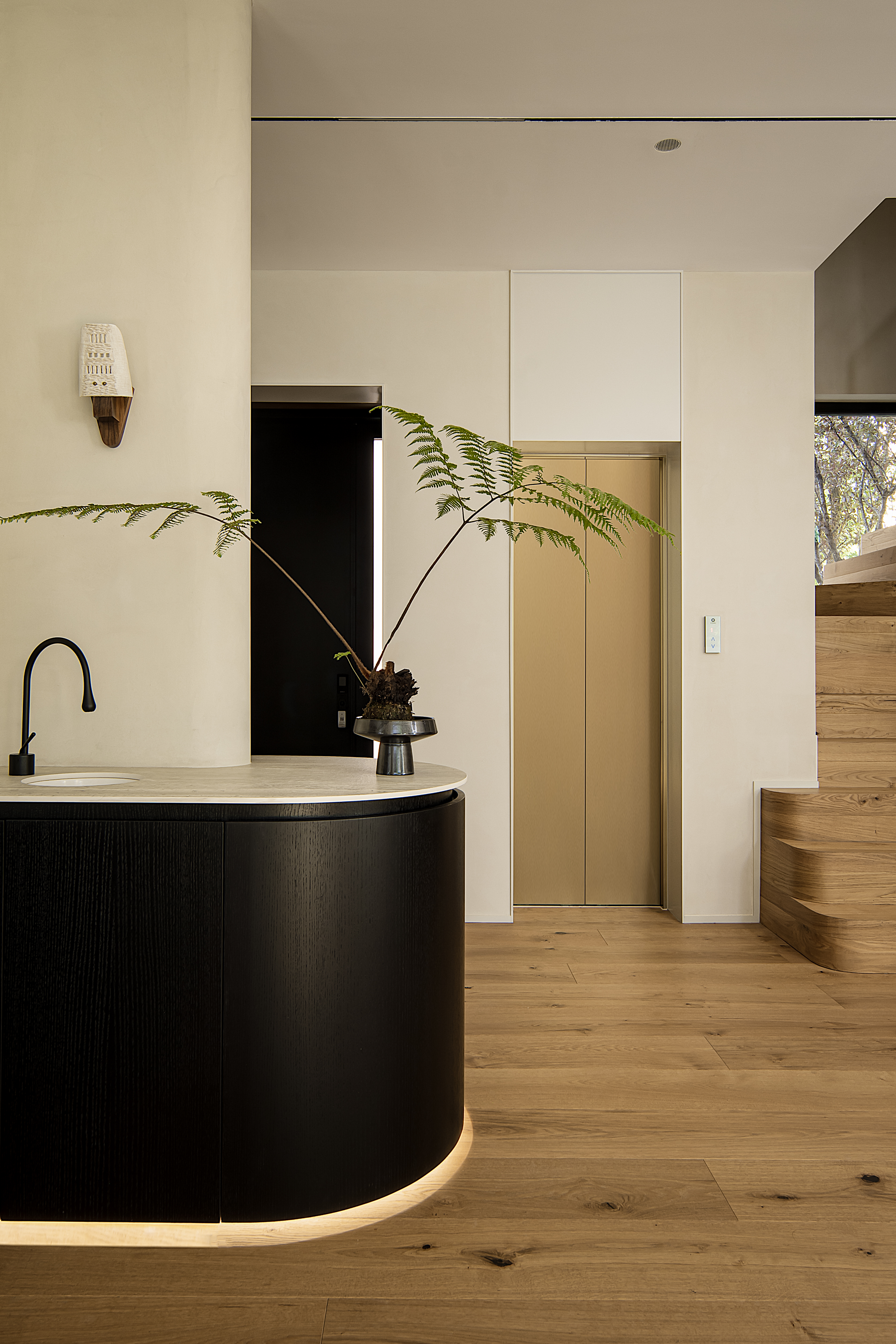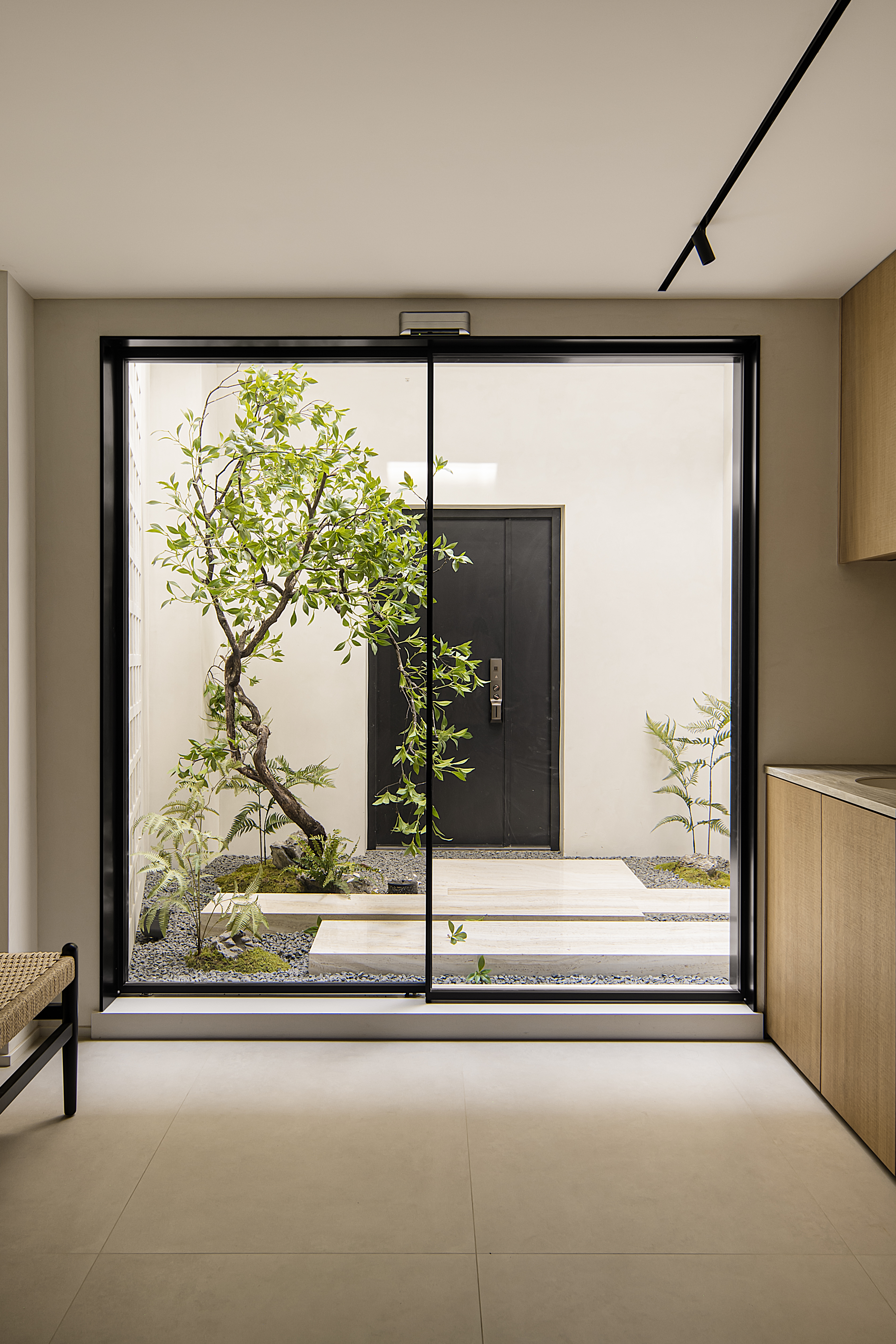 从停车库进入家里首先是到这个下沉式庭院,这里会有一棵树,伴随着绿意,经过这个电动玻璃移门走进我们的玄关区。背后这里我们会放一个休闲椅,司机过来接业主出去的时候就可以在这里休息等待,不用上楼。