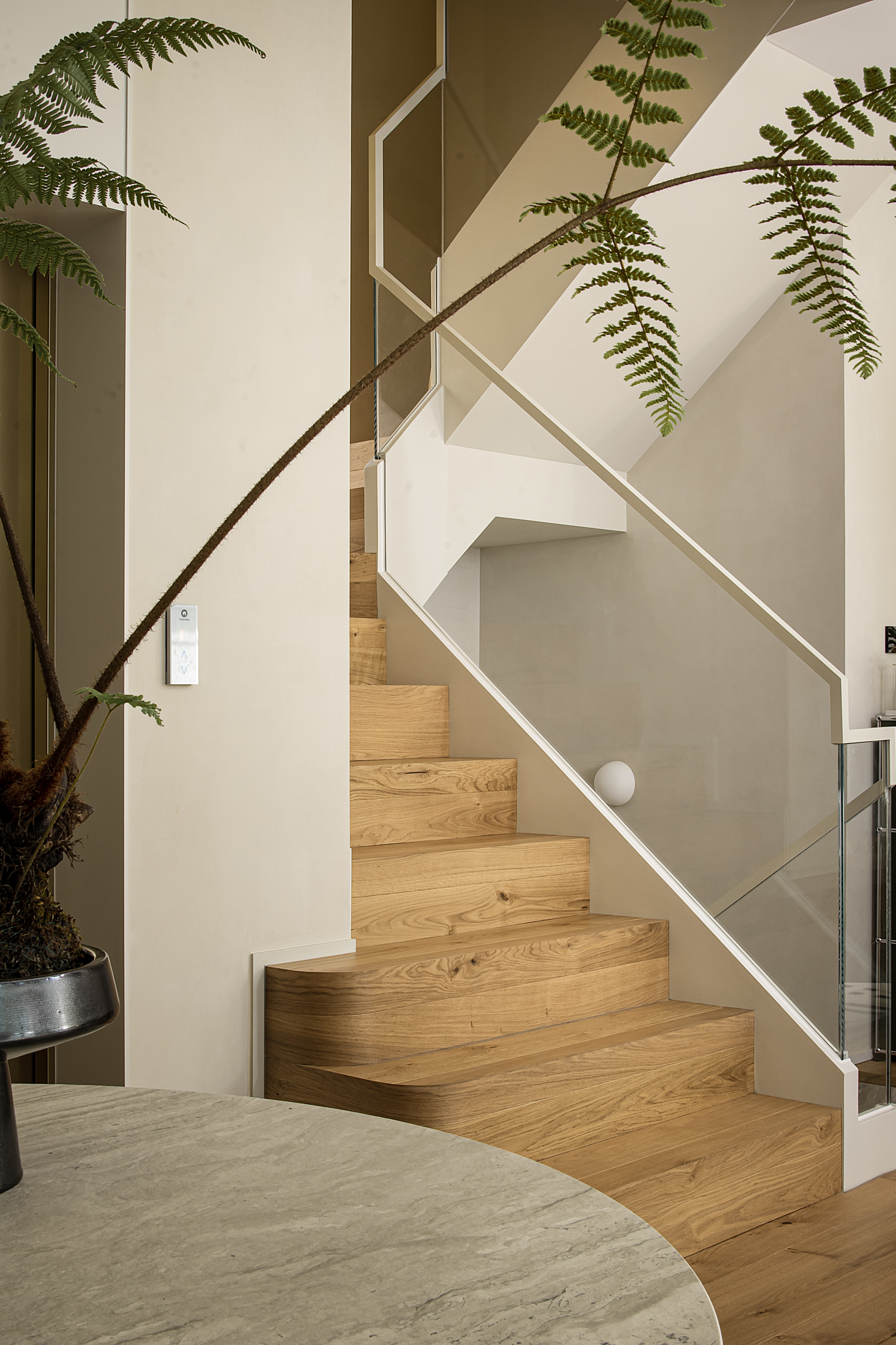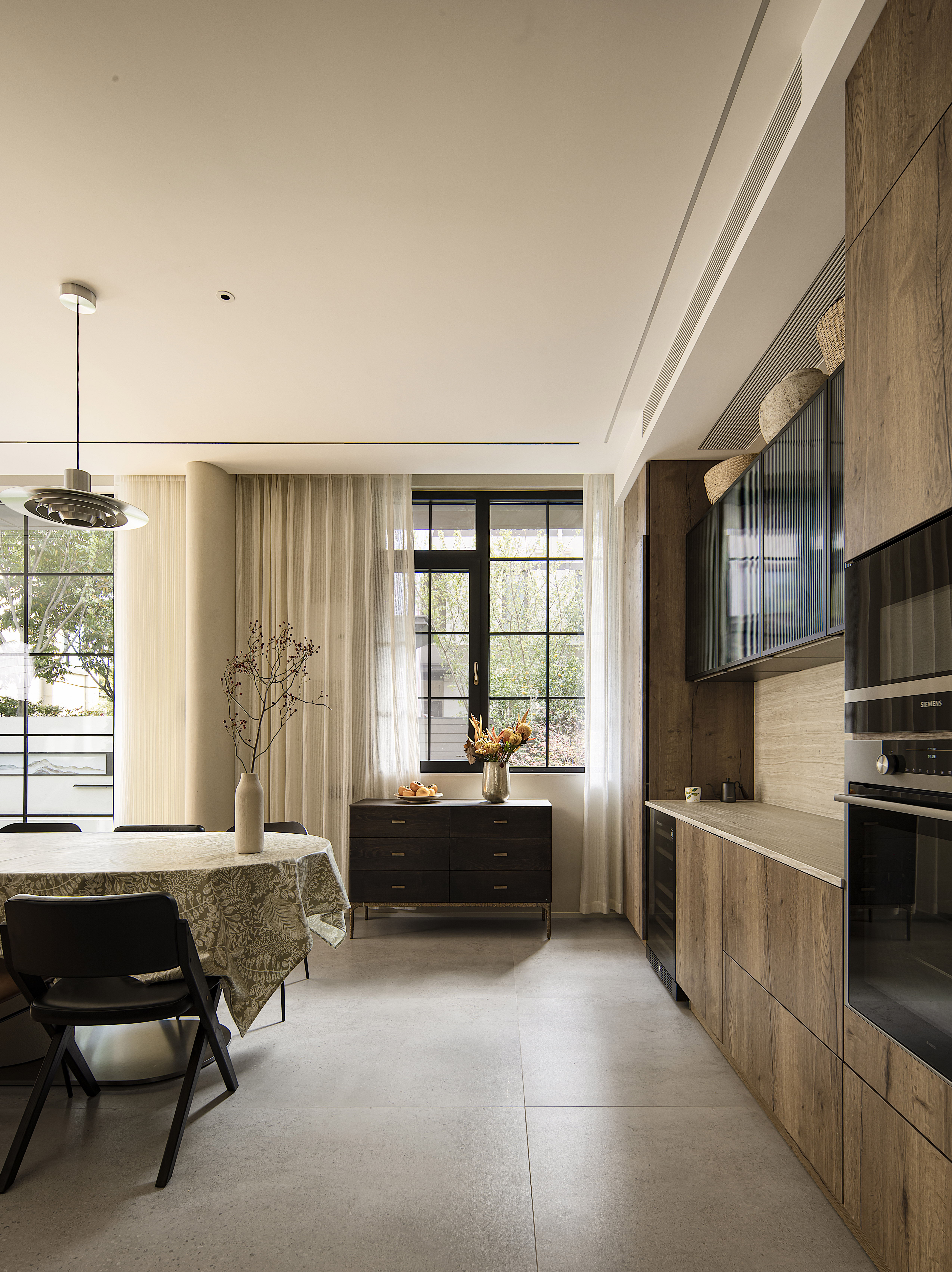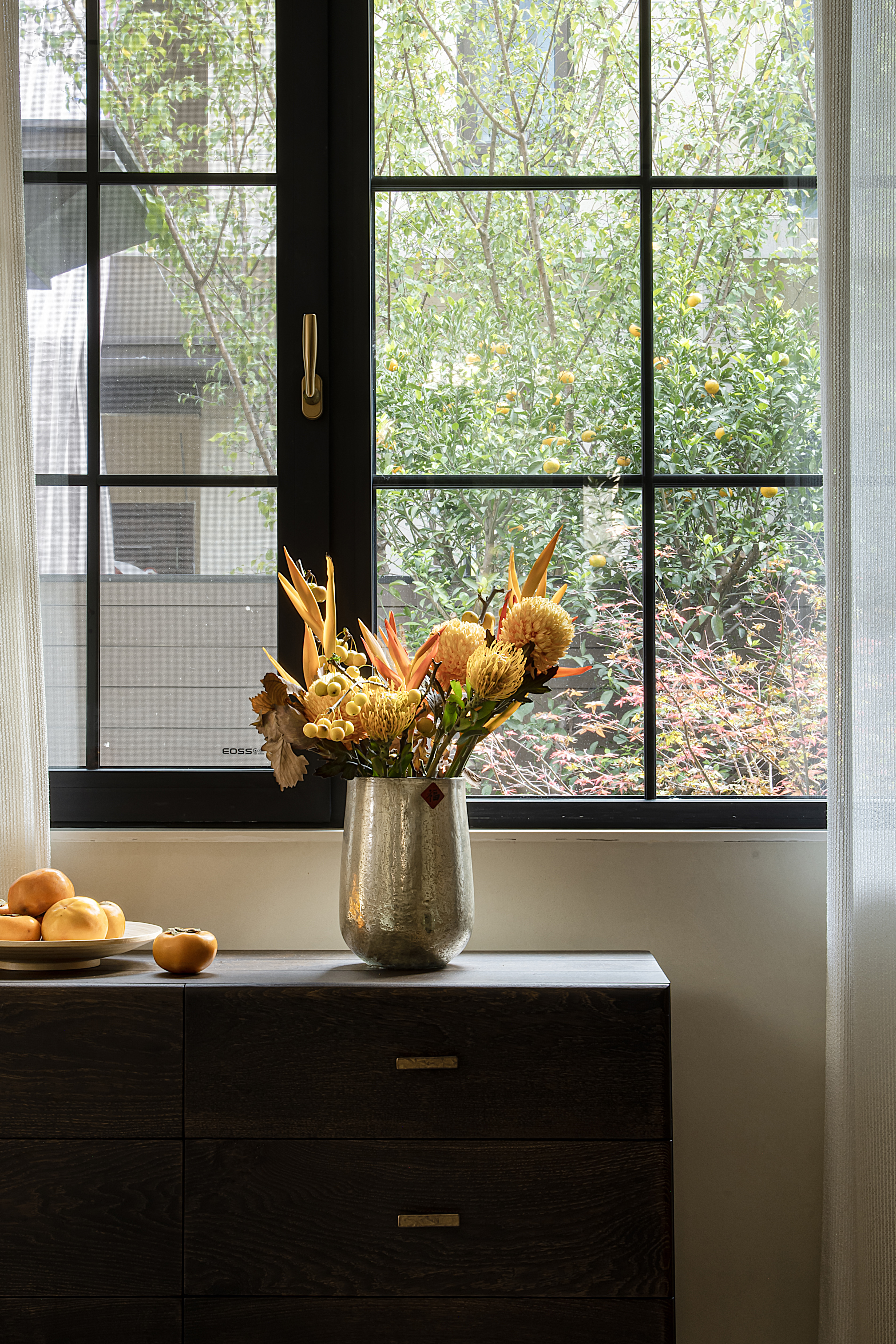 从停车库进入家里首先是到这个下沉式庭院,这里会有一棵树,伴随着绿意,经过这个电动玻璃移门走进我们的玄关区。背后这里我们会放一个休闲椅,司机过来接业主出去的时候就可以在这里休息等待,不用上楼。