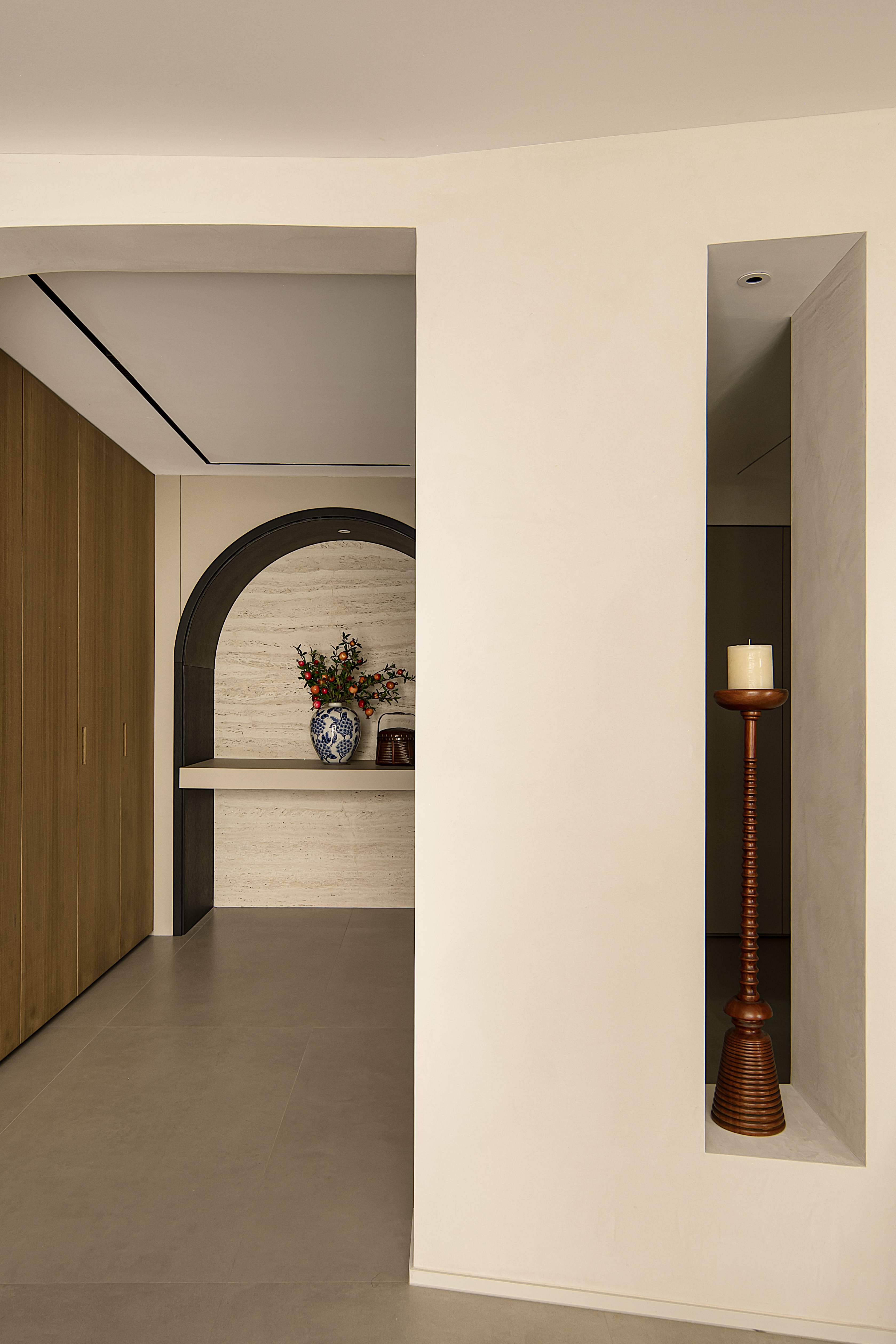 玄关尽头处有个端景柜,这一组端景柜设计的是洗手池和鞋柜,右手边这个位置背板用的是白色洞石,前面摆的这个是北欧风情的玄关柜,这个是一个金属玻璃柜,主要是放一些包包使用的。