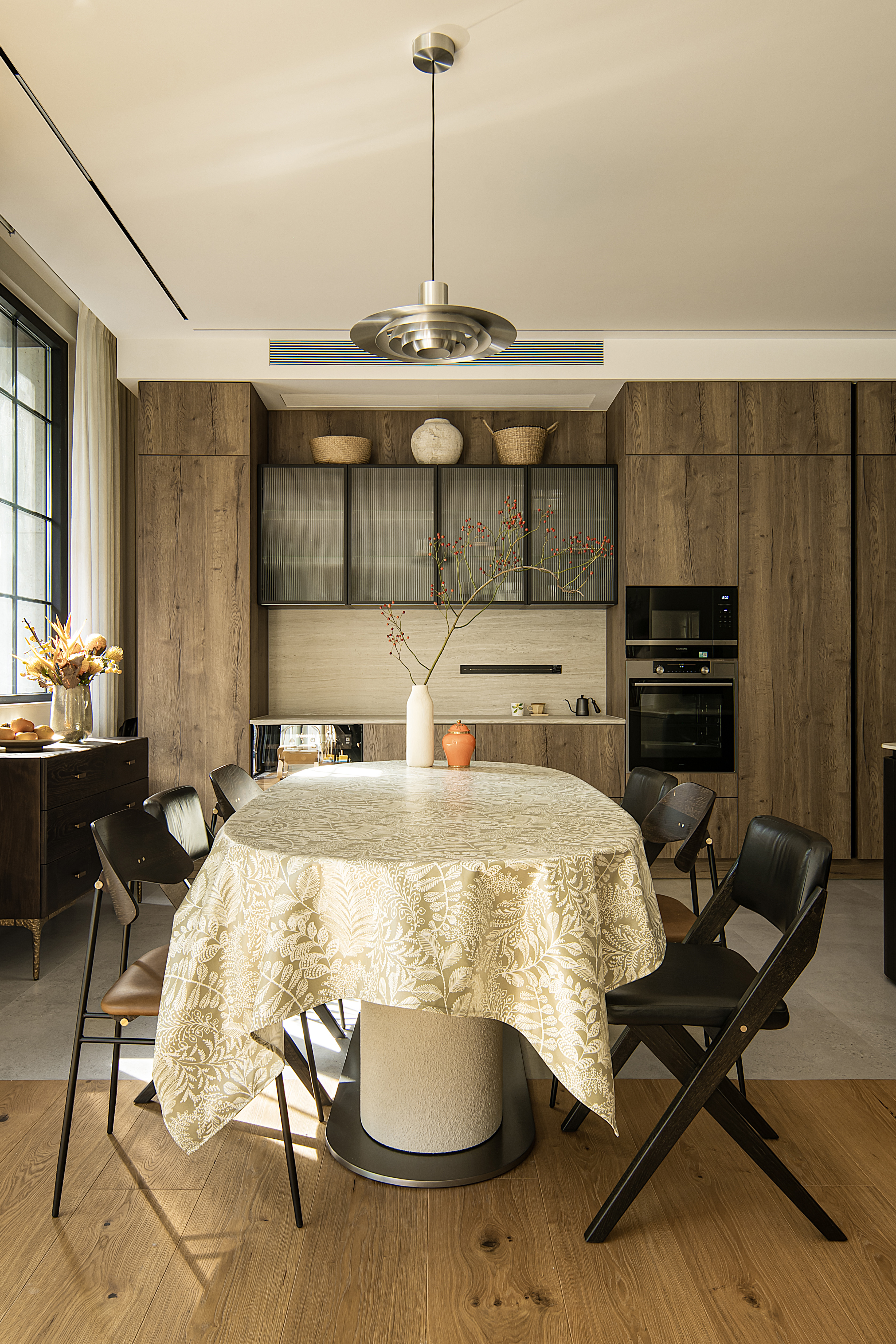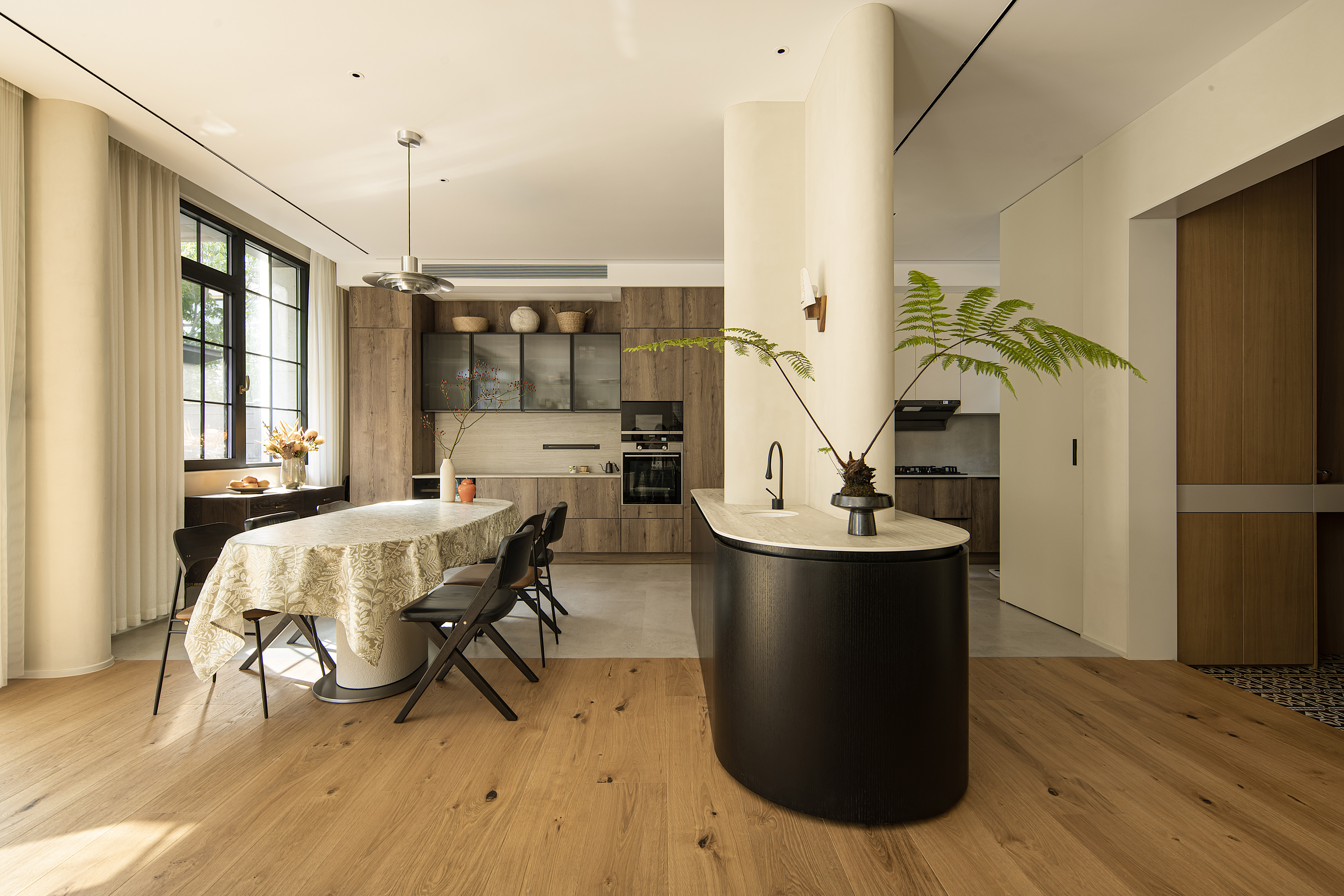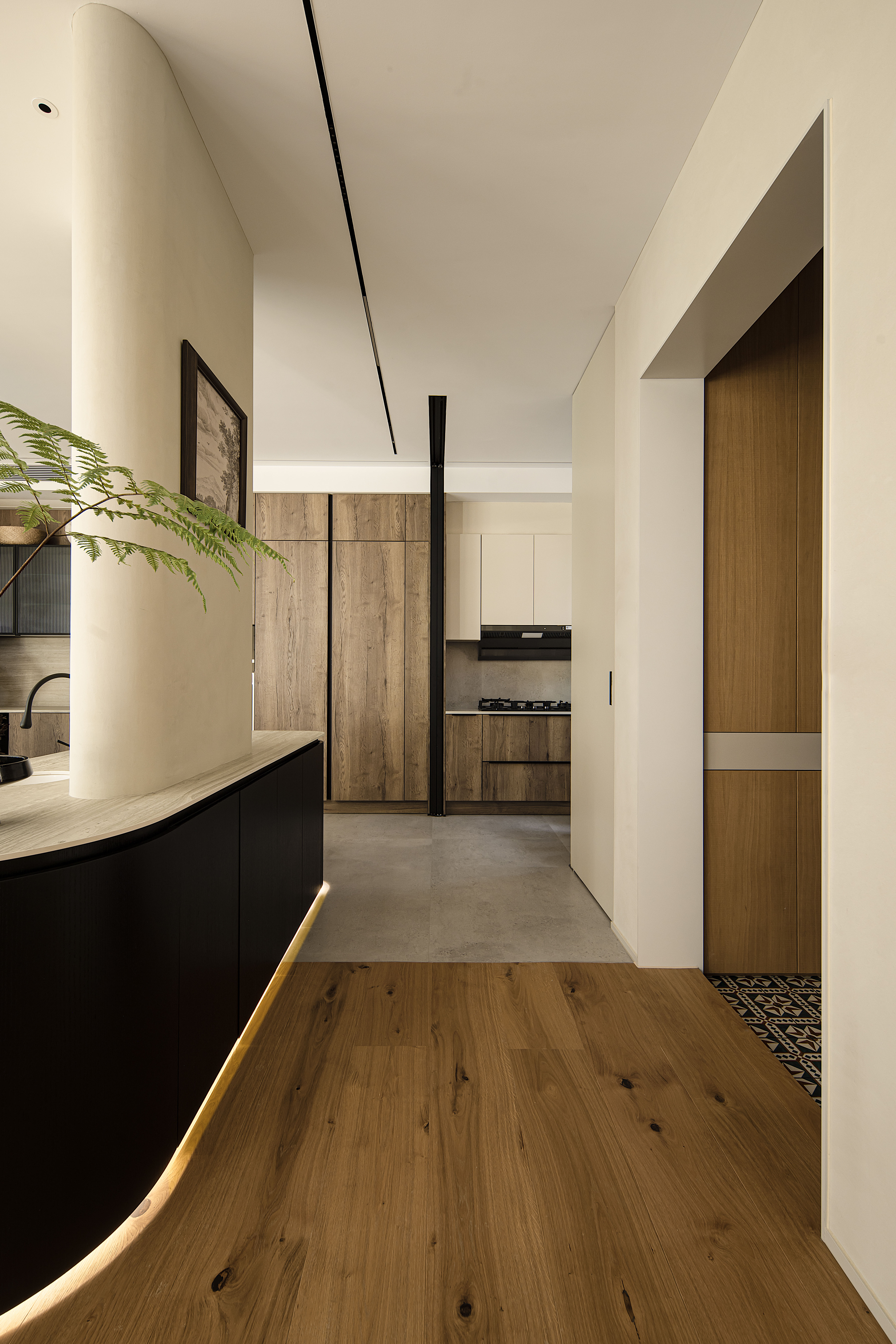 再来餐厅这边,这里原先是根承重柱在无法拆除的情况下,我们把这里设计成了一个半圆弧的造型,下面做成了半圆岛台,柱子上还设计壁灯装饰。这一面柱子正好对着北边入户门,在这里挂一副画,可以让这个玄关变得更有仪式感。