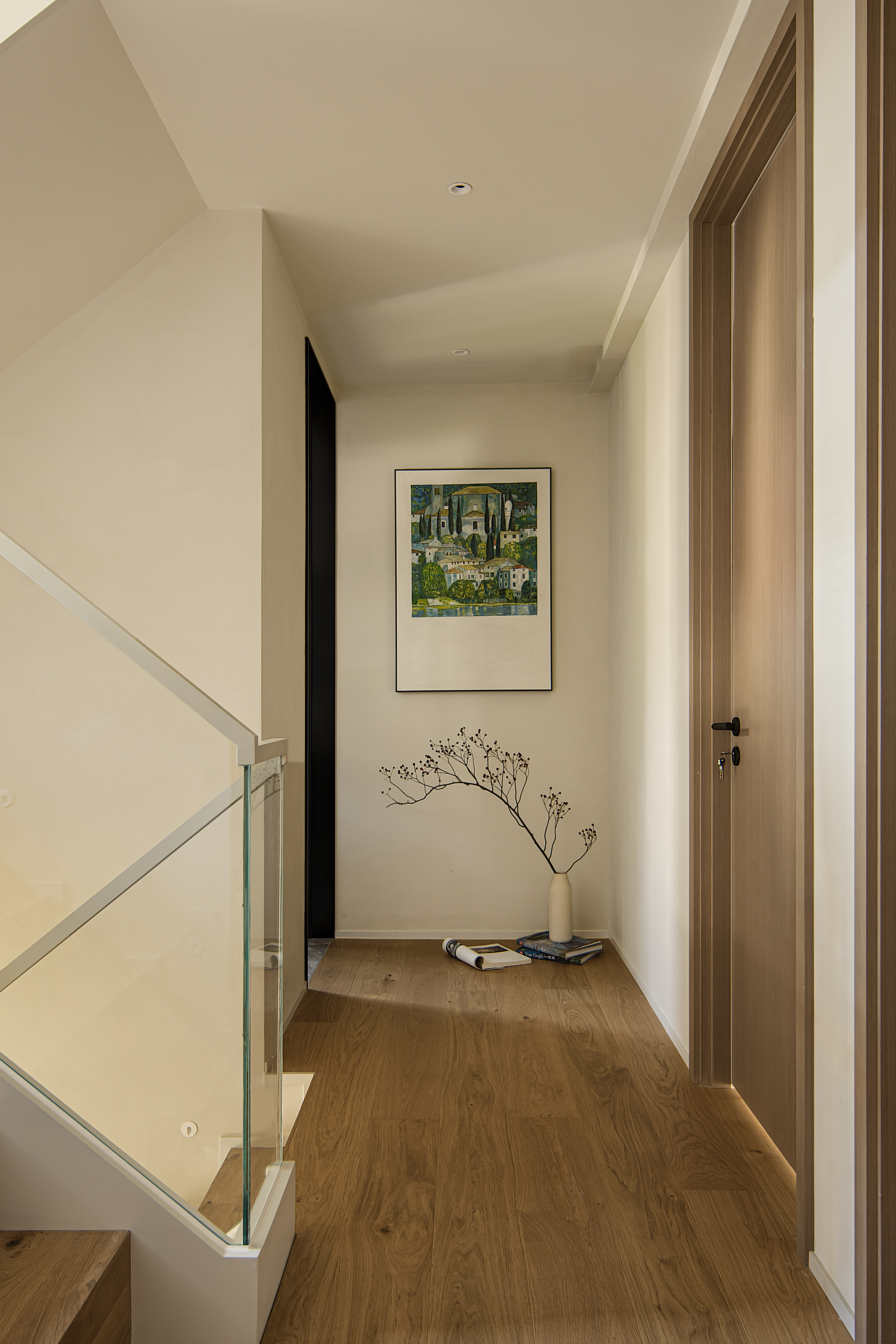 出电梯正对的是二楼过道的造型墙。往左边走是东边的儿童房,考虑到舒适性楼上卧室用的都是进口的木地板,卧室左边是一门到顶的衣柜,简洁素雅,床头背景的石膏板抽缝造型由木工纯手工打造的,再刷上和墙面材质相同的艺术涂料,有拉伸层的效果。