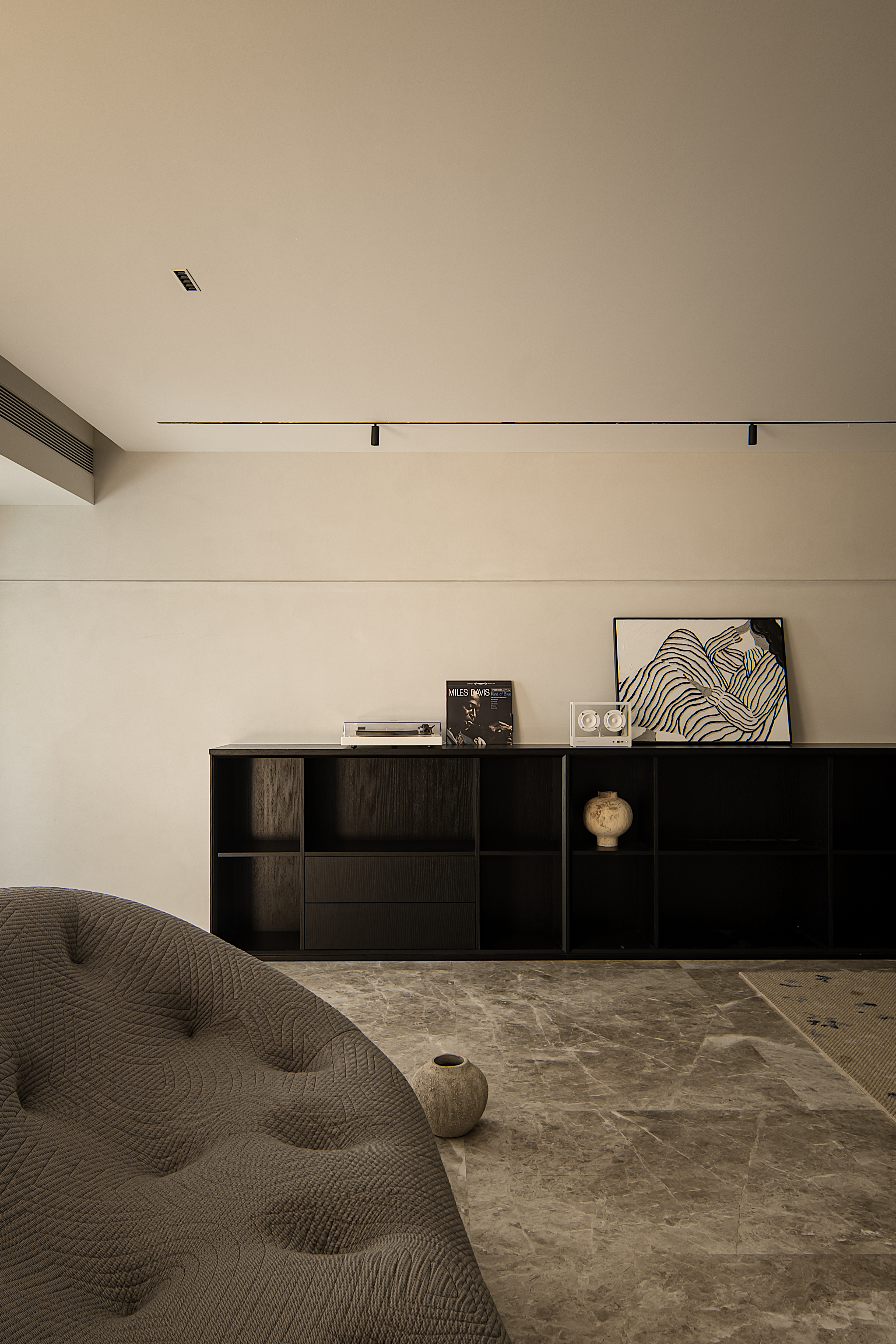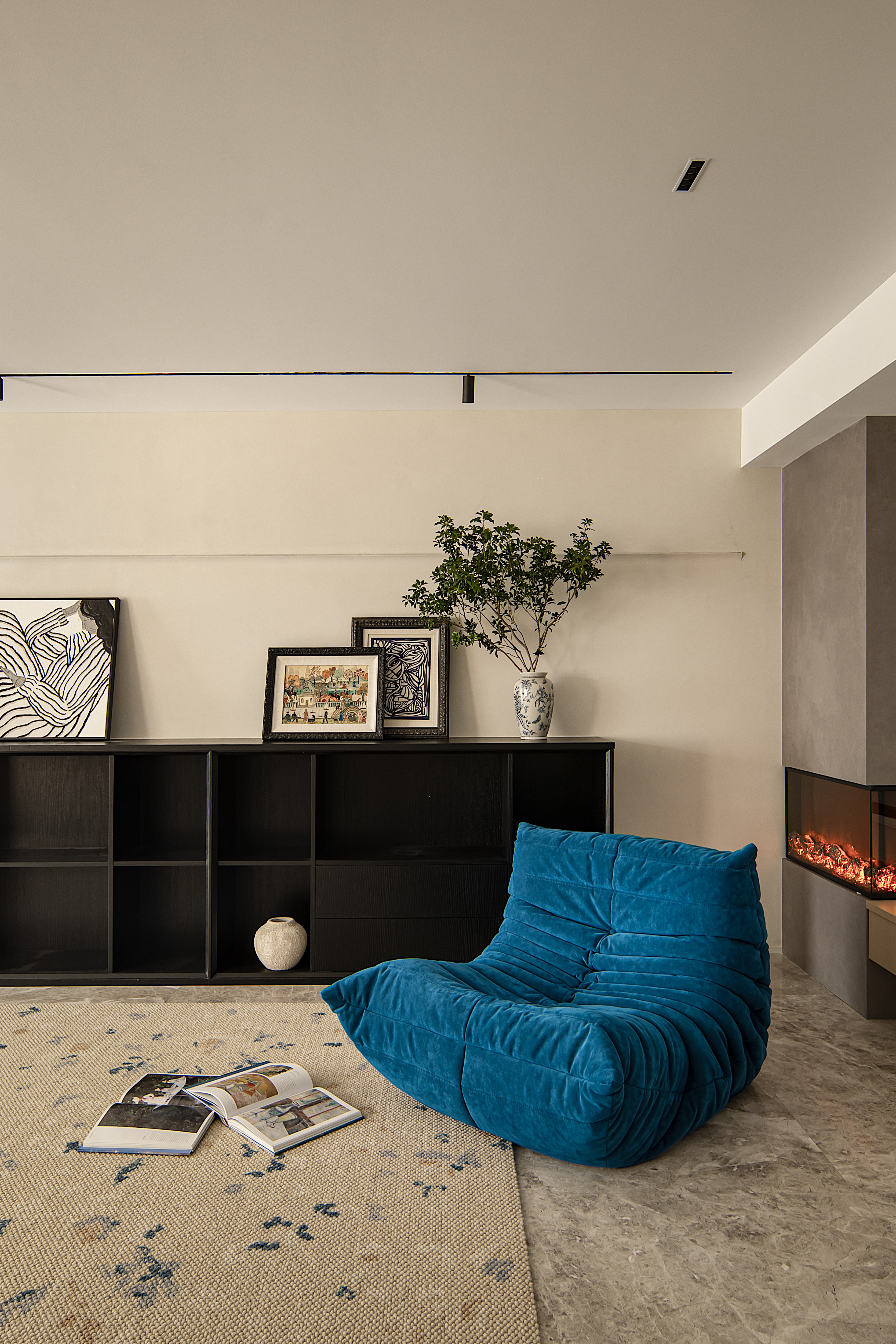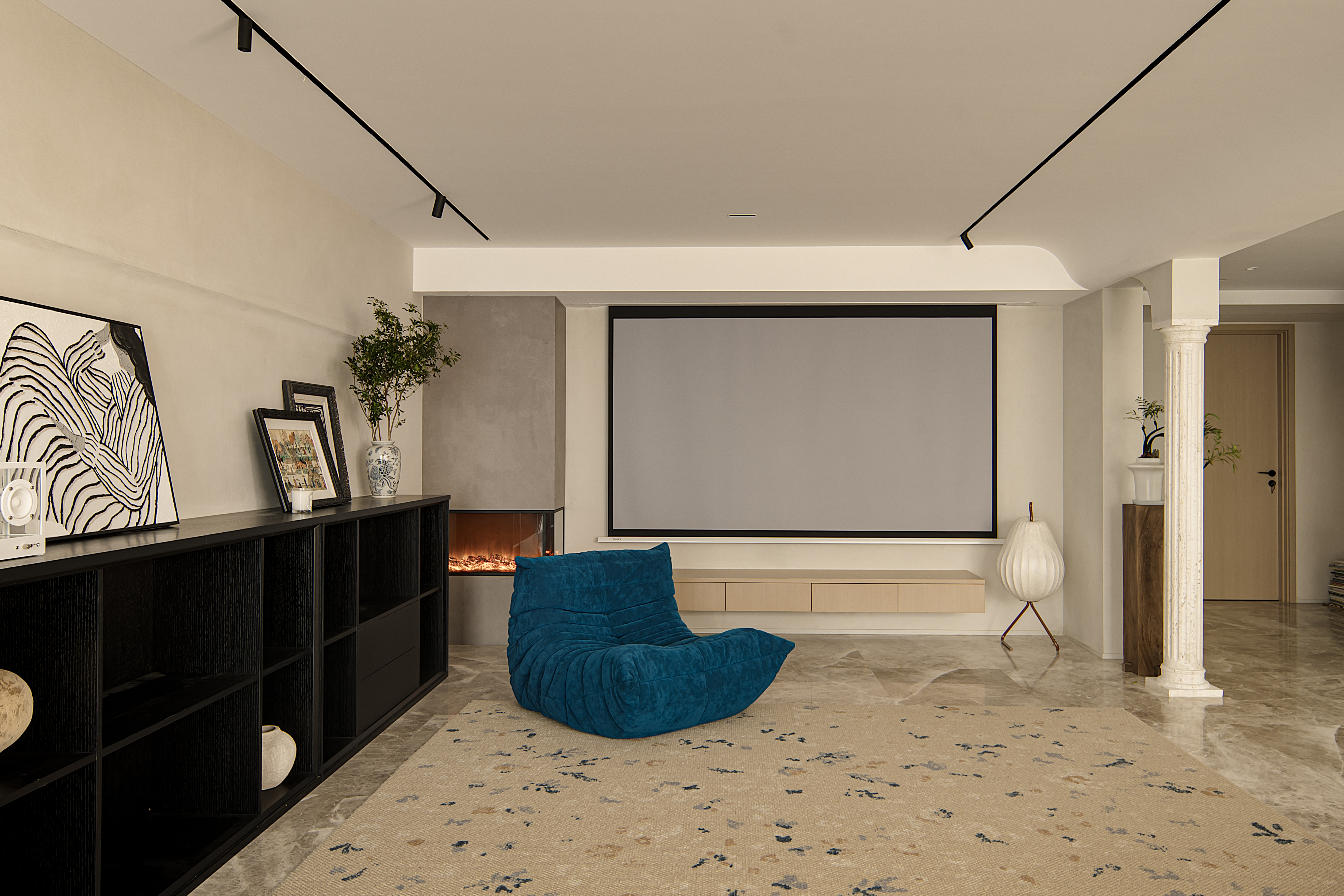 首先这边是一个公共影音空间,设计了有伸缩式幕布,还有收纳柜,墙角的位置我们设计了一个壁炉,这个壁炉我们用灰色的岩板做了材质包裹,火光灼灼营造一种冬日阳光的空间氛围。左边的设计的黑色书柜,墙上设计了入墙式的洗墙灯,整个空间的上下光源的完美搭配。