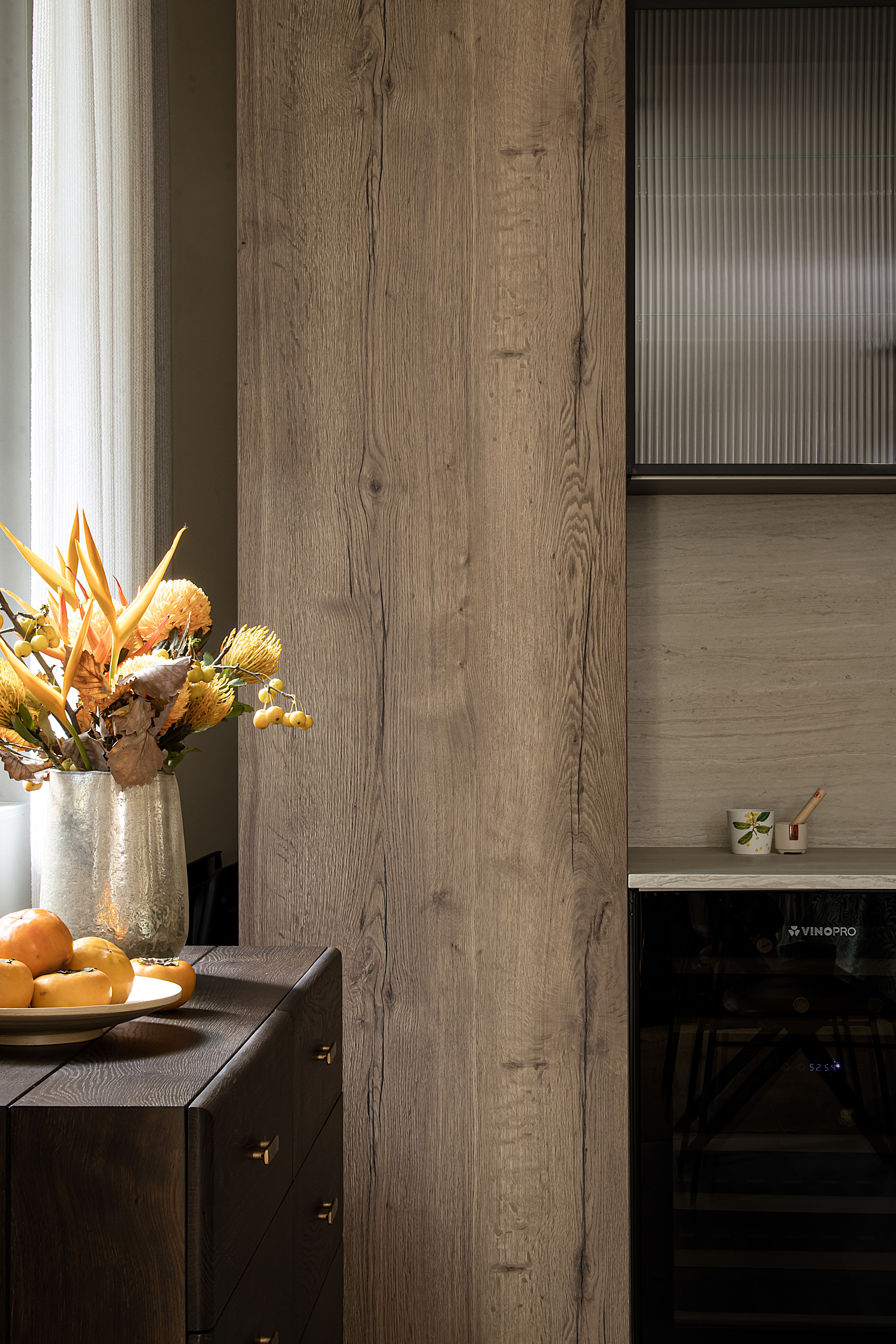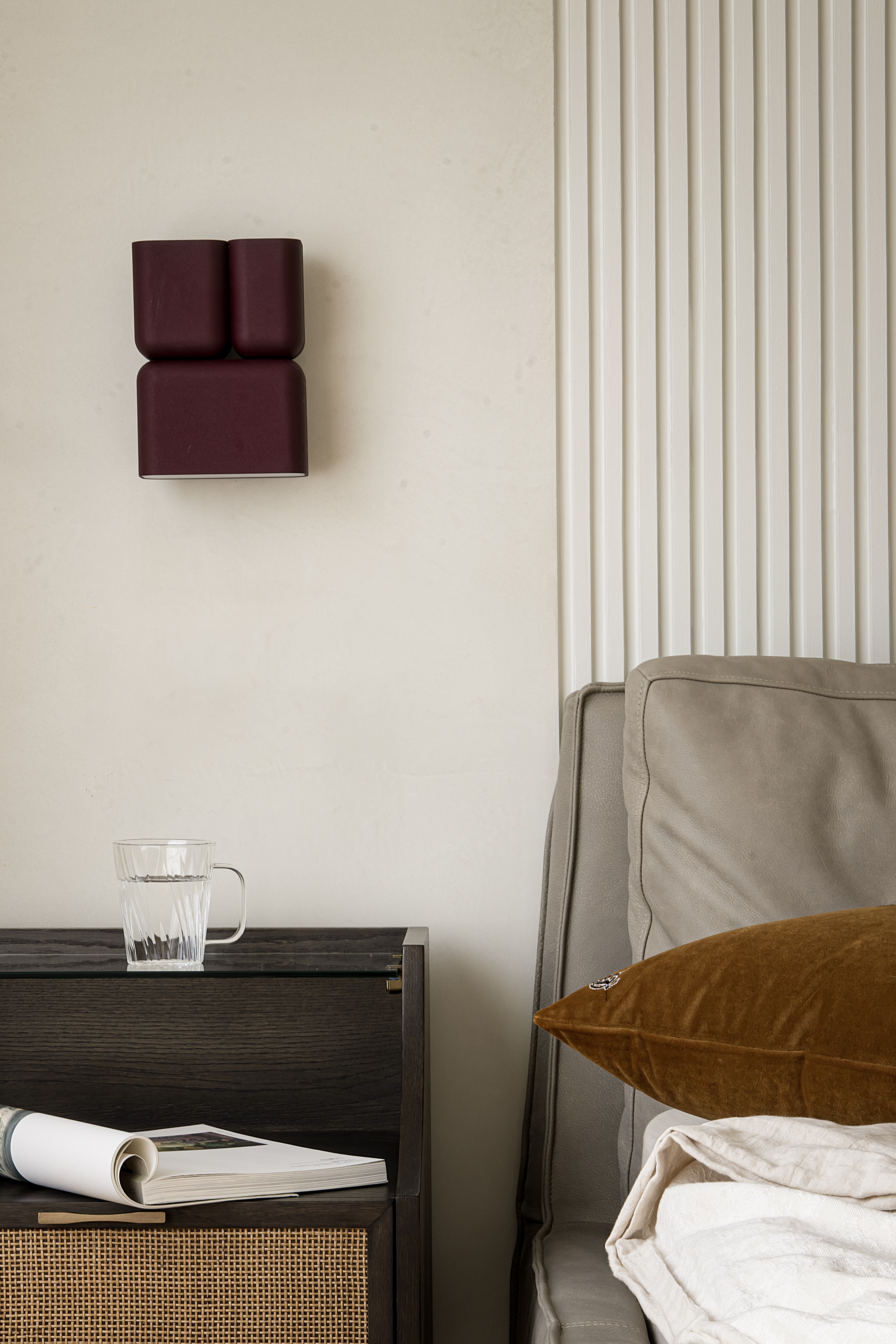 床尾利用电视墙一个空间开两道门,很特别的是,用了口袋移门的设计关上就完全隐形又不占用过道,将卧室睡眠区与衣帽间巧妙连成一个整体,不走回头路.